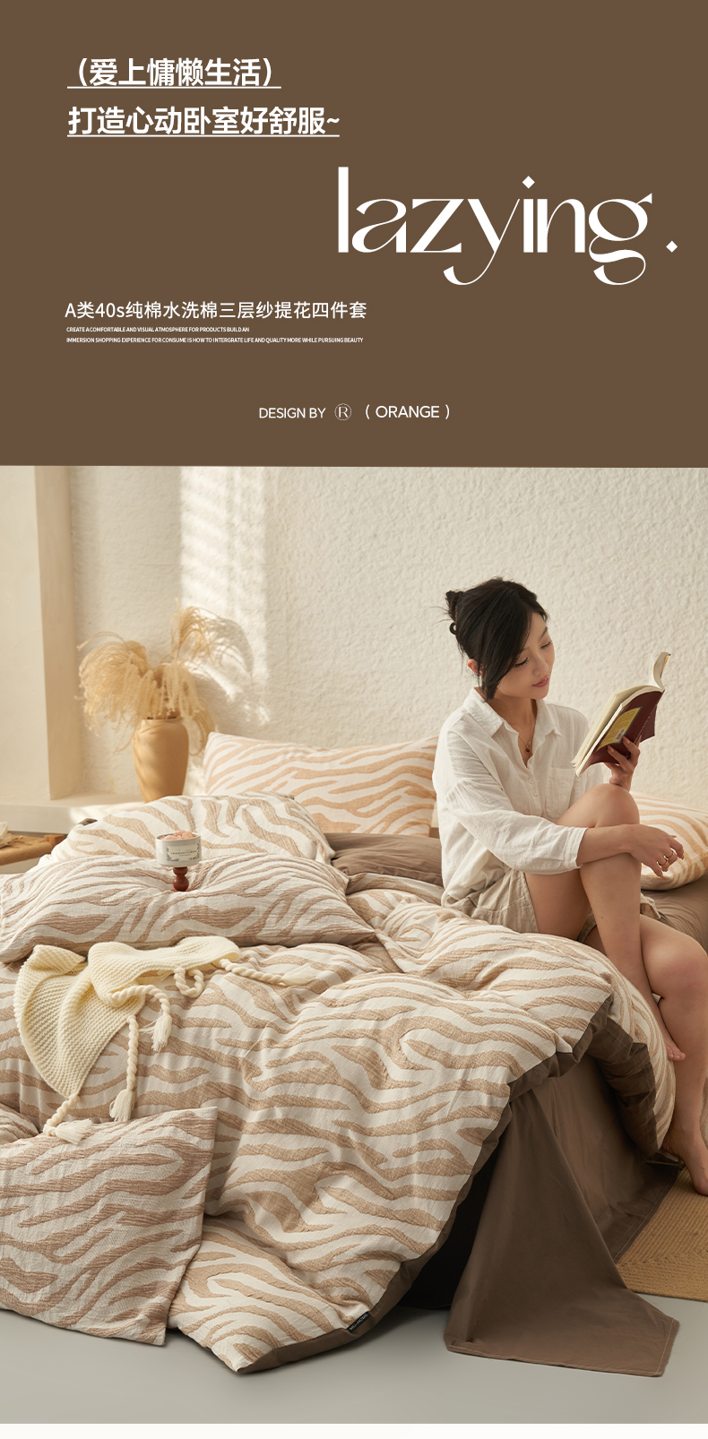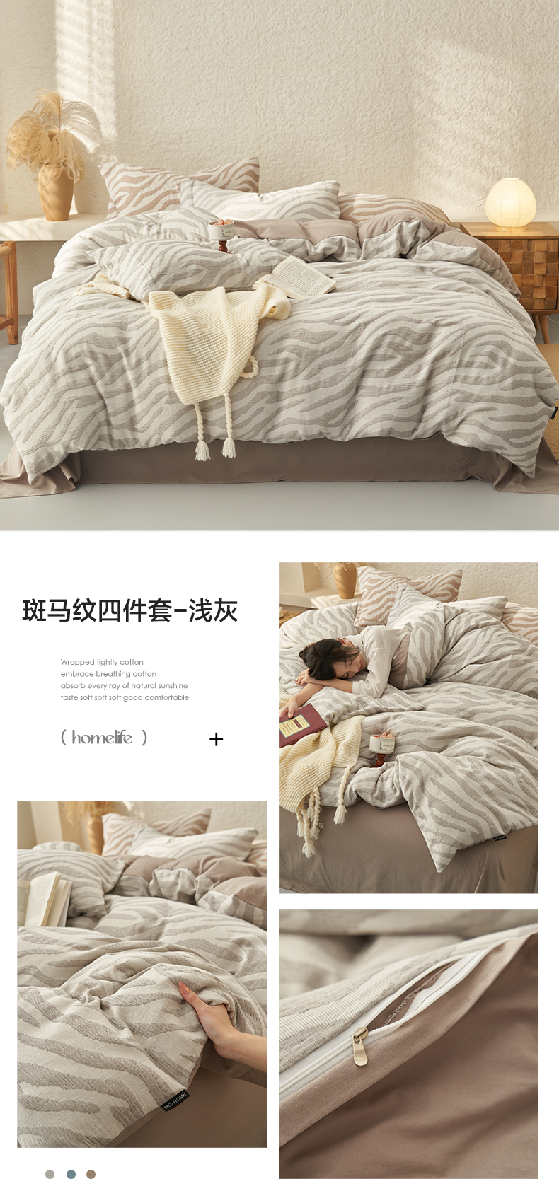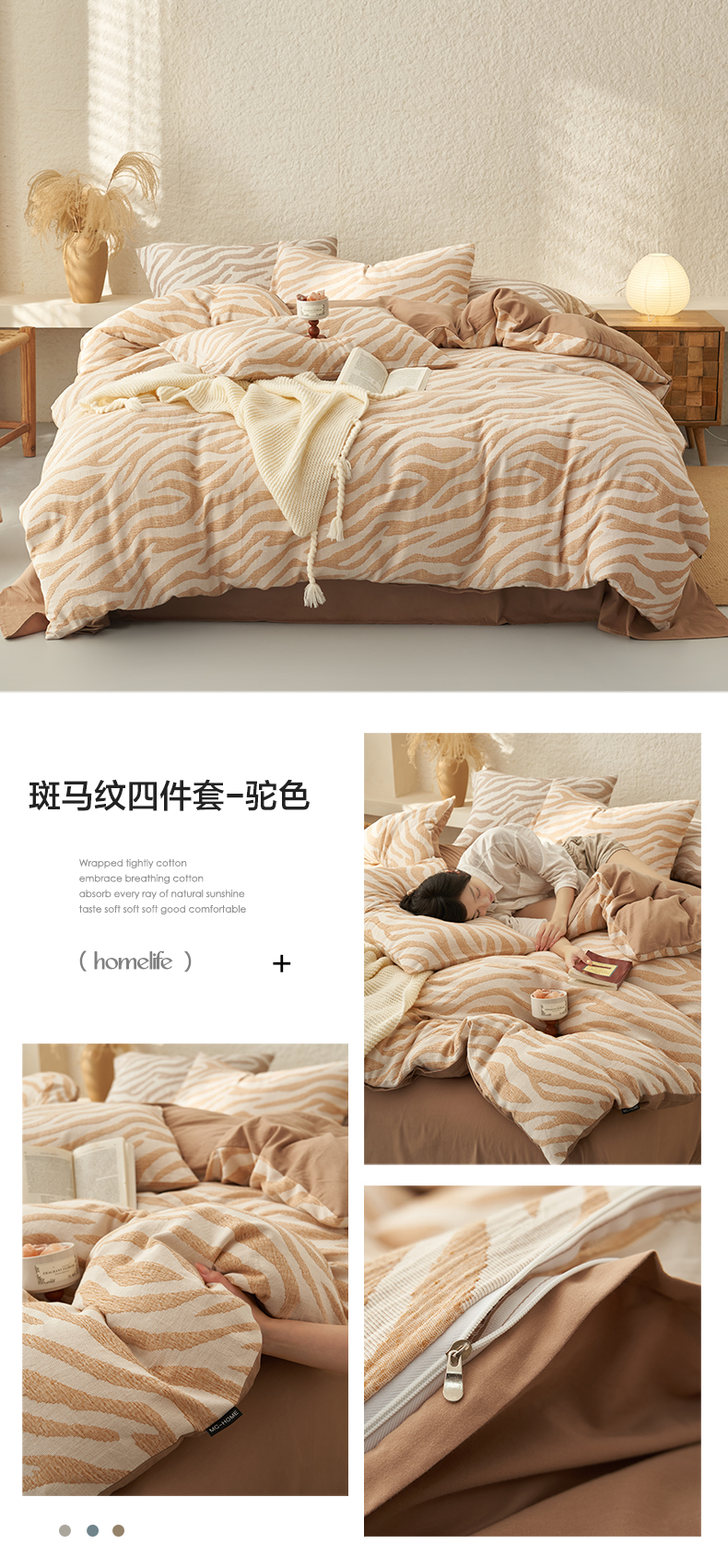 2025新款纯棉水洗棉三层斑马纹提花四件套 斑马纹四件套-豆沙
