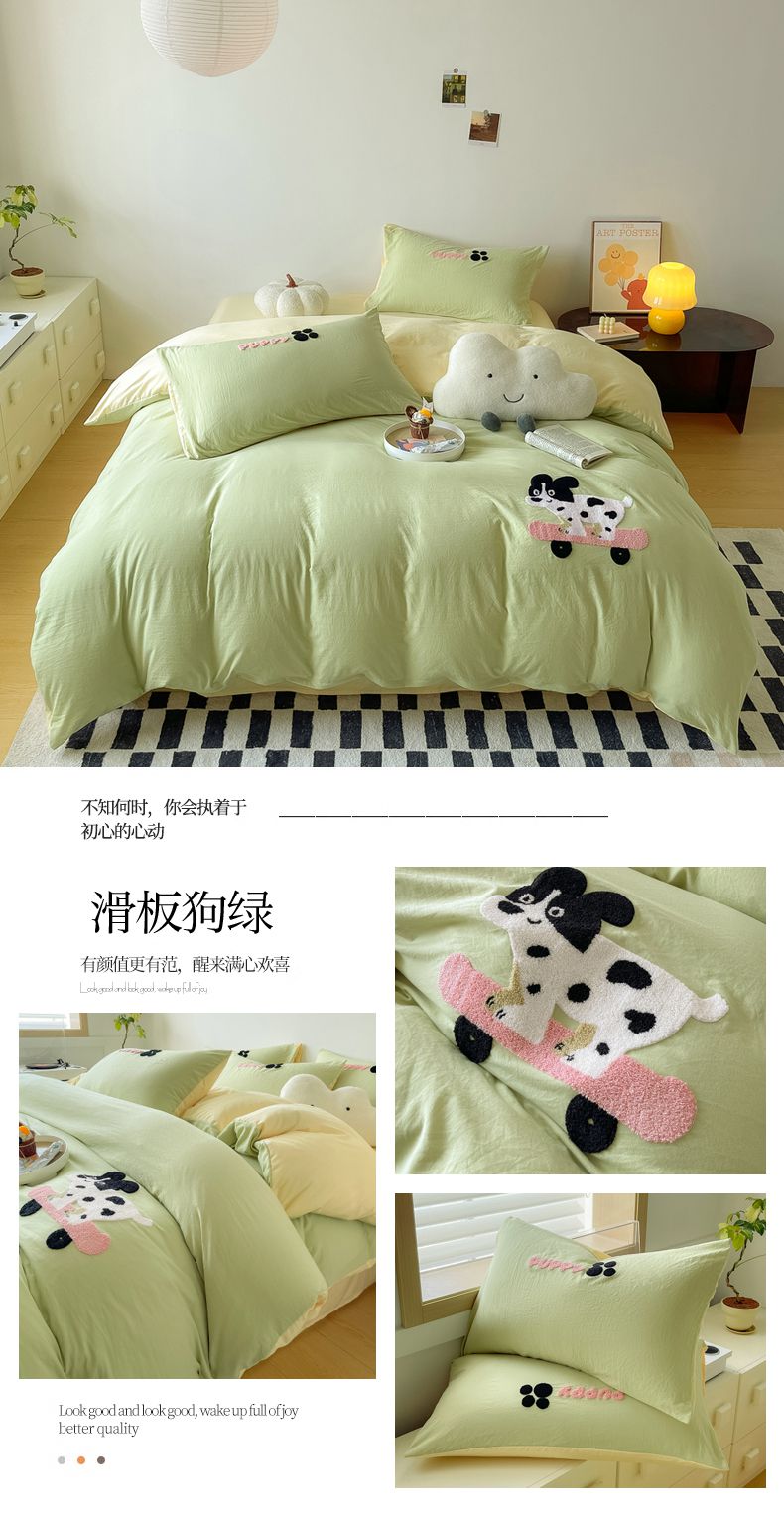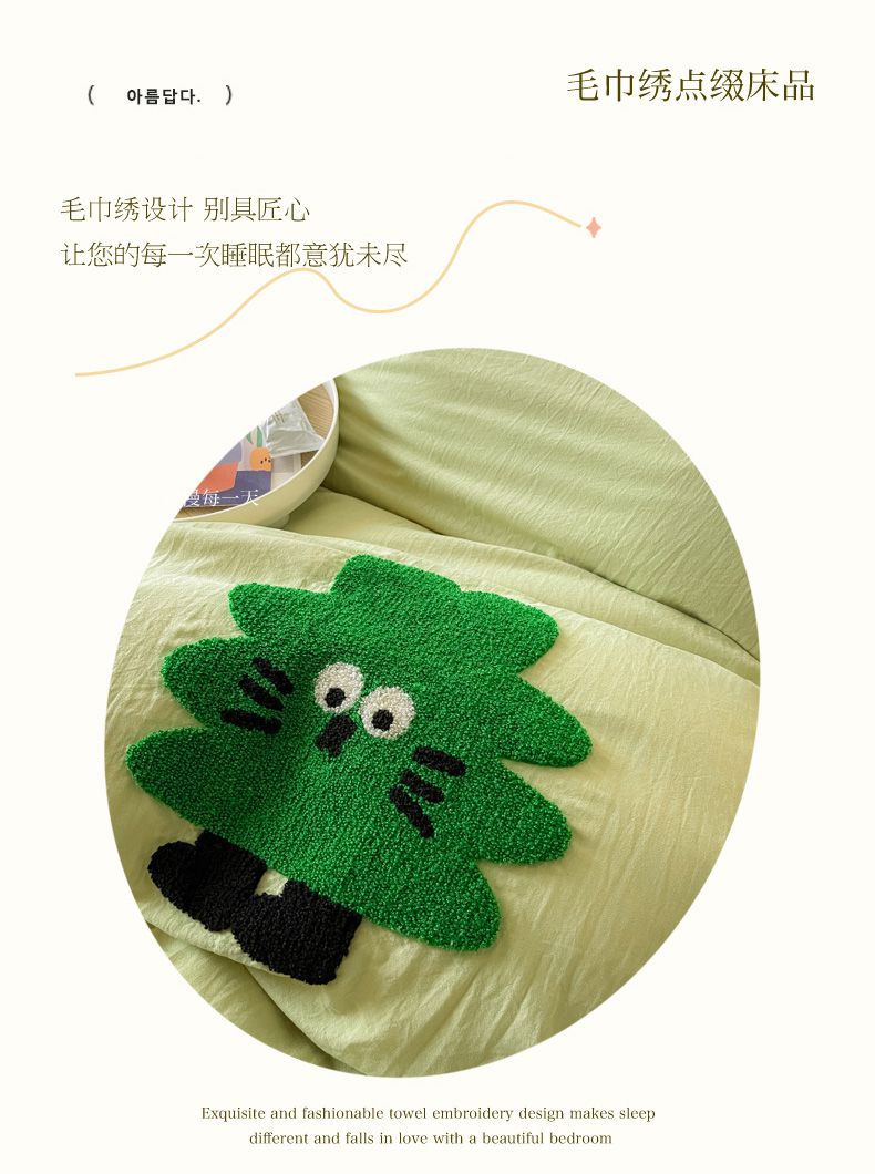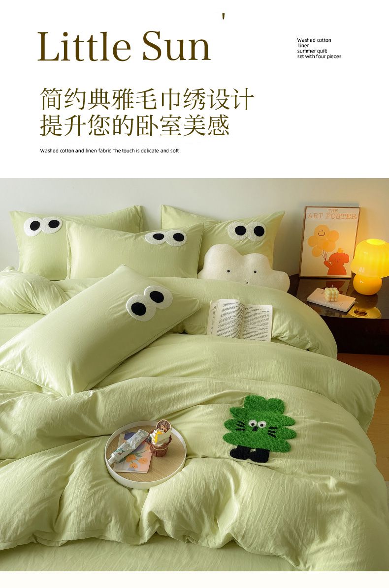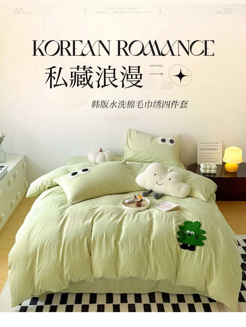 商品名称:宜家坊 2025新款卡通水洗棉毛巾绣四件套 浅绿配米黄