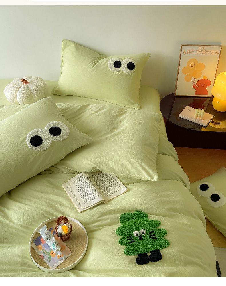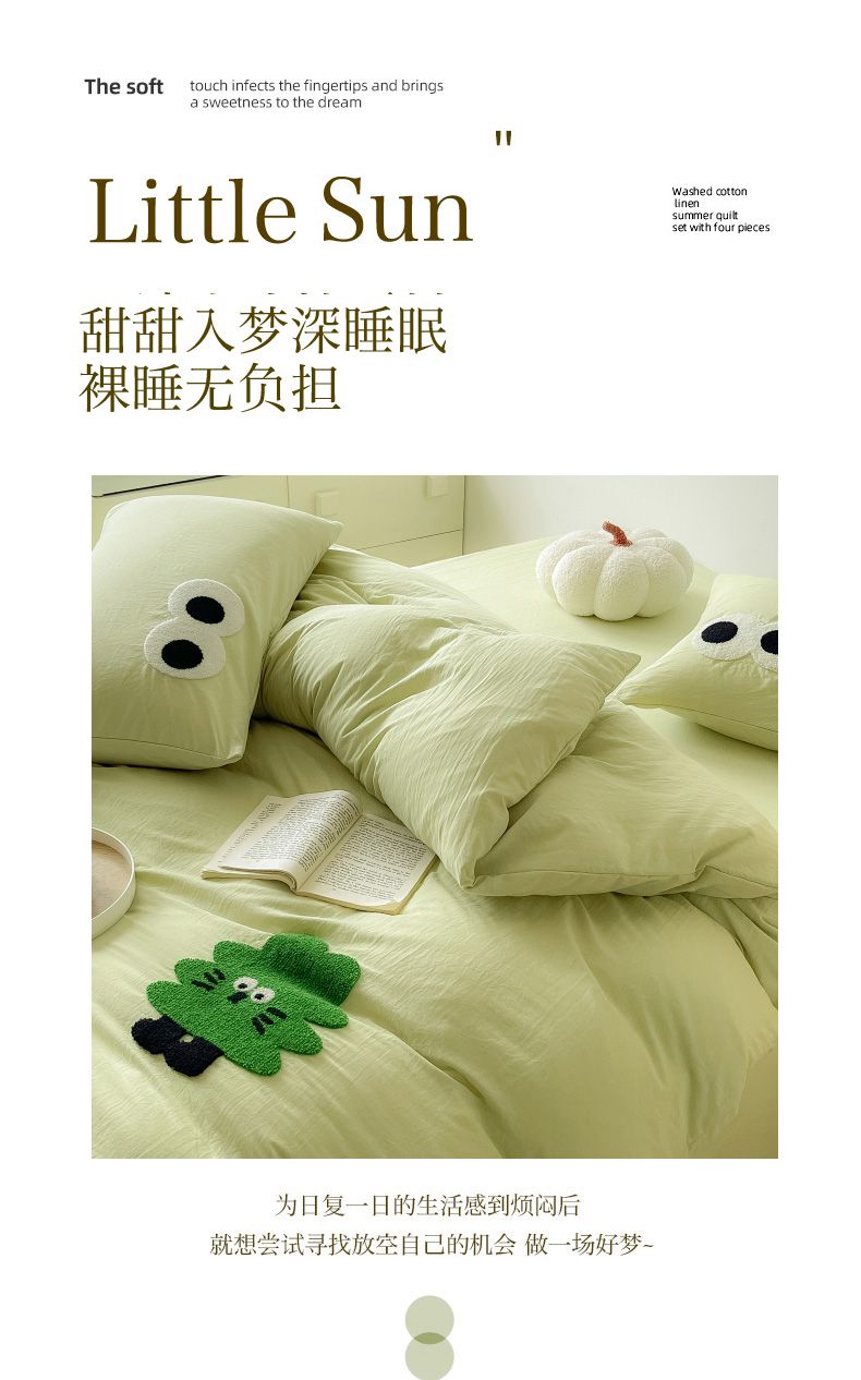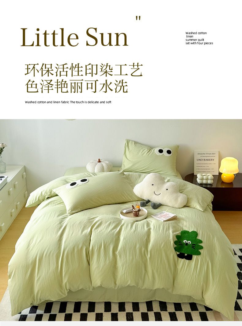 商品名称:宜家坊 2025新款卡通水洗棉毛巾绣四件套 浅绿配米黄