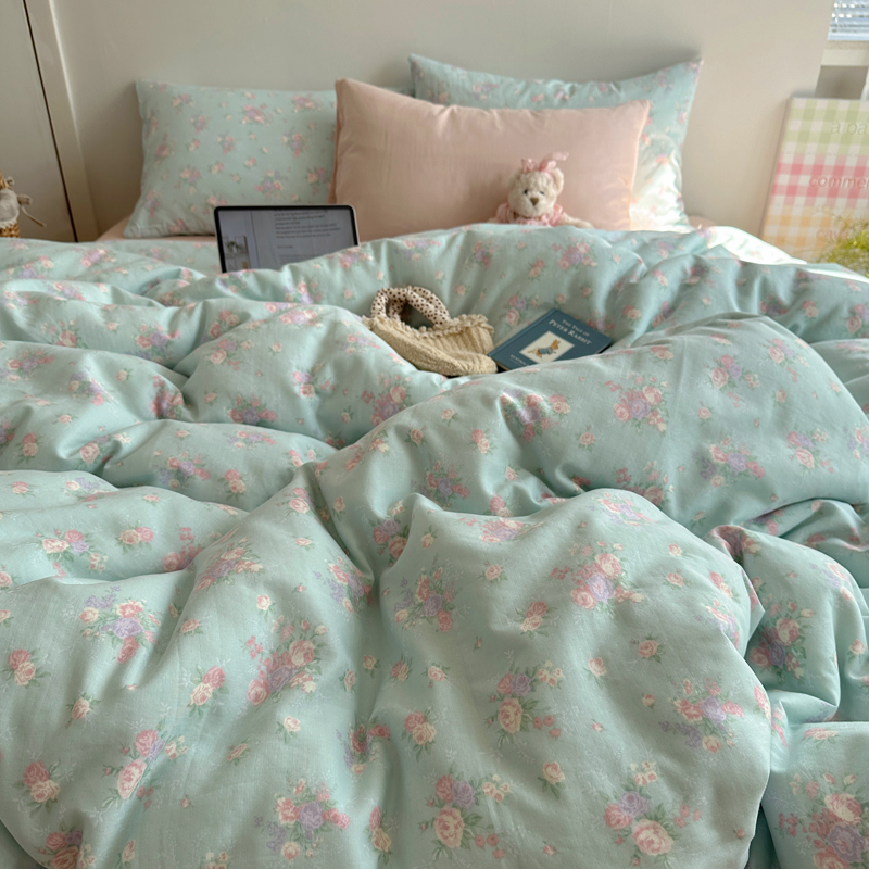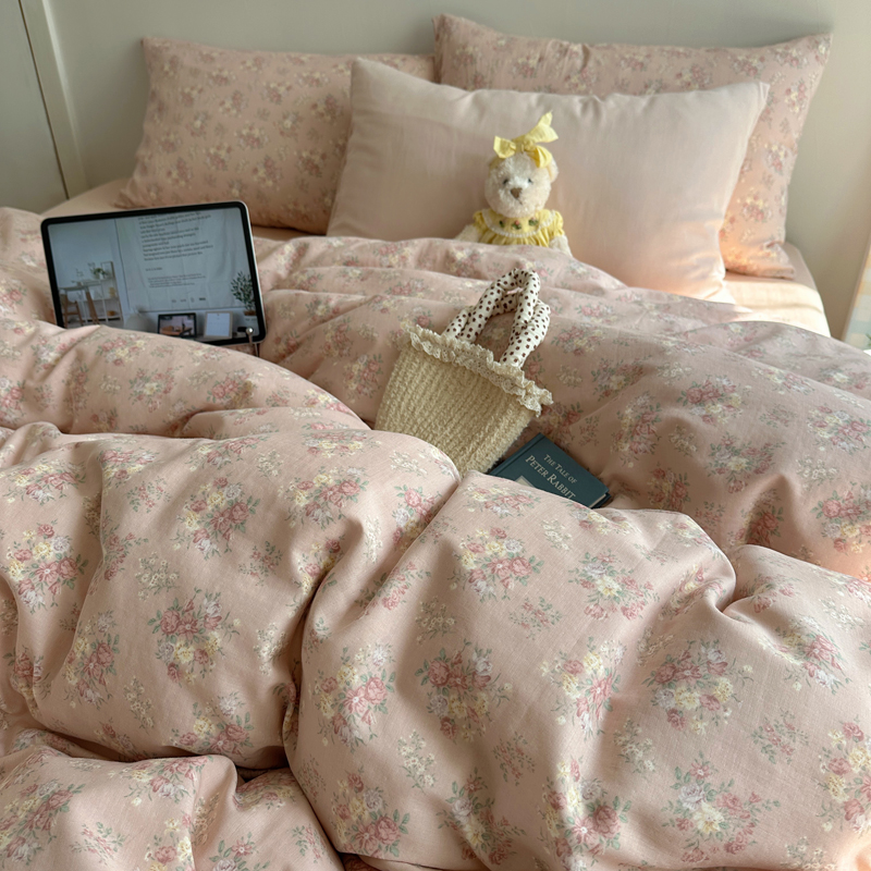 商品名称:桃喜 2025新款春夏全棉双层纱碎花系列四件套 黑粉樱桃
