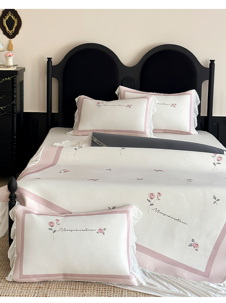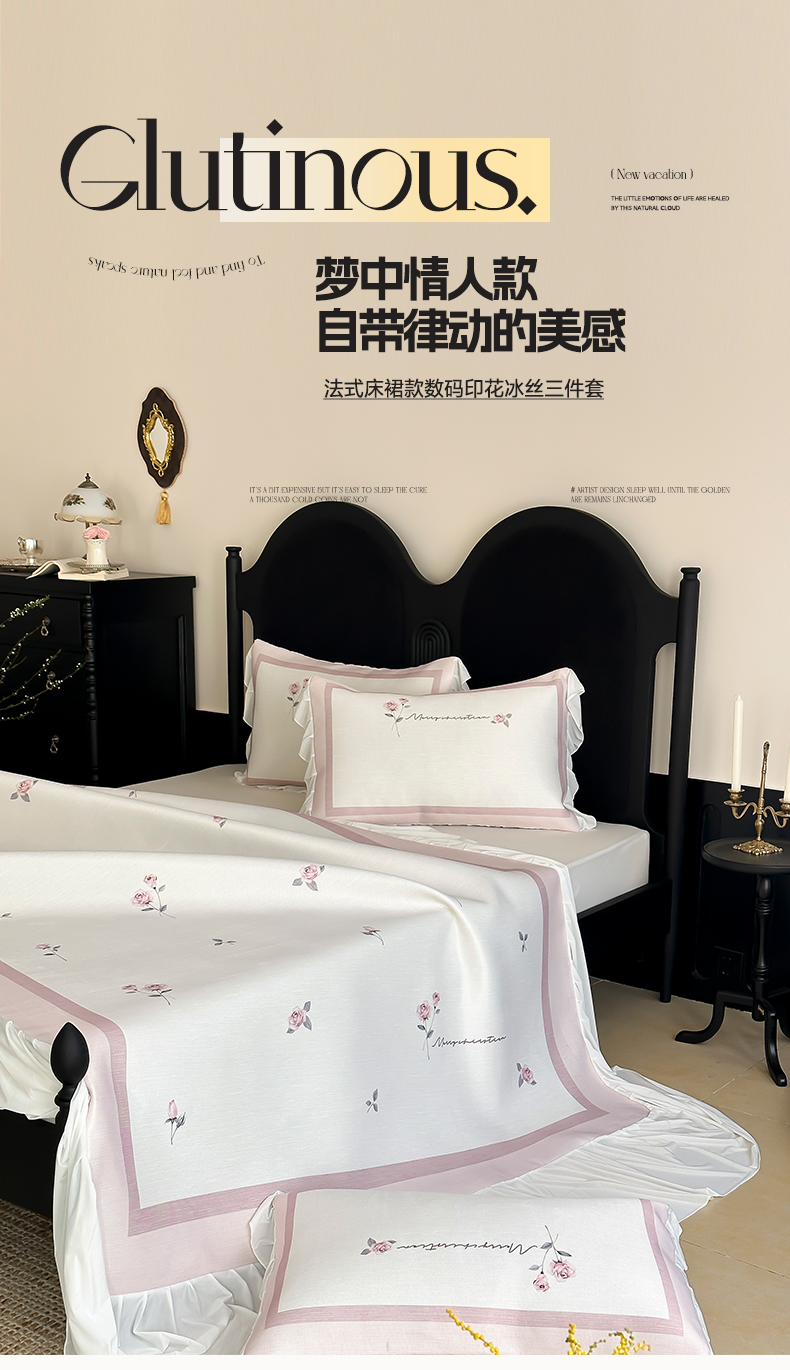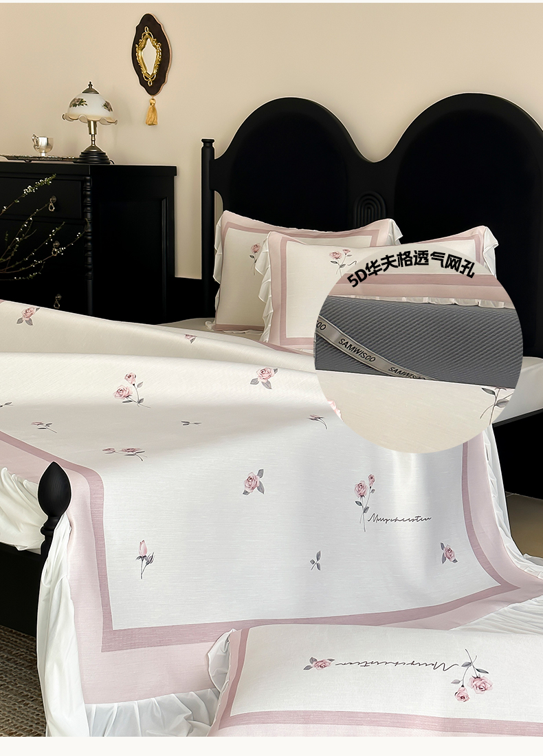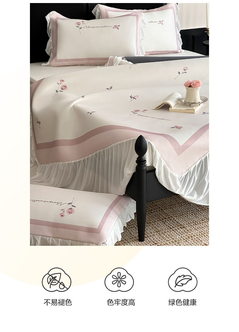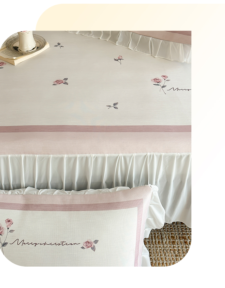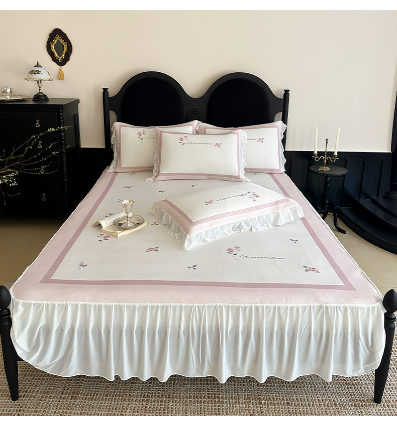 商品名称:三味舒屋 2025新款法式床裙款数码印花冰丝凉席三件套 床裙-米蕾粉