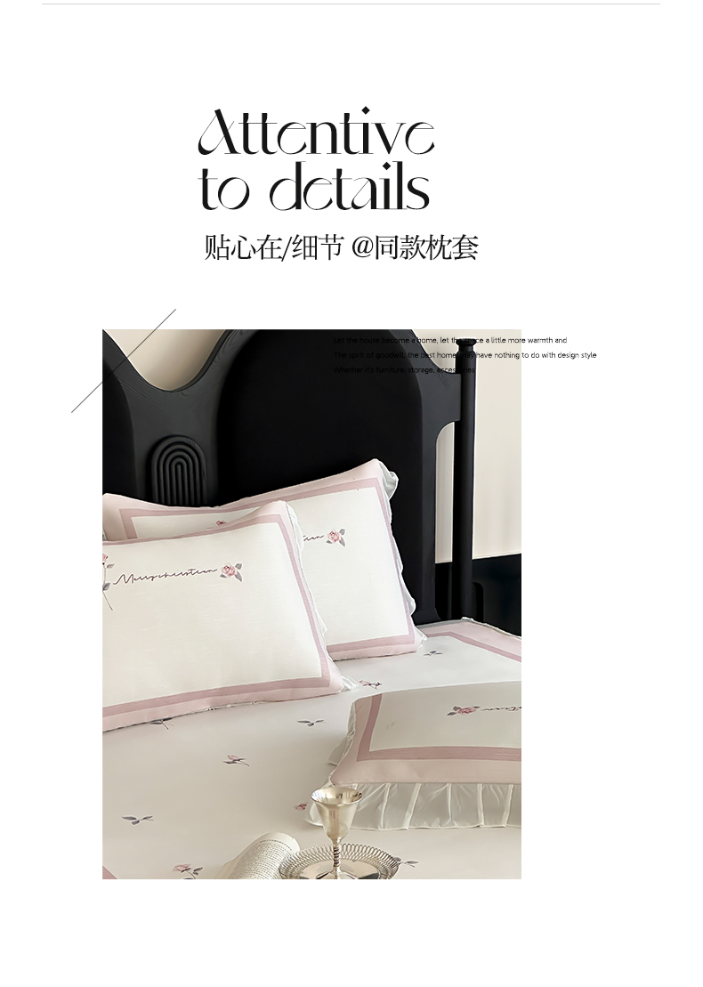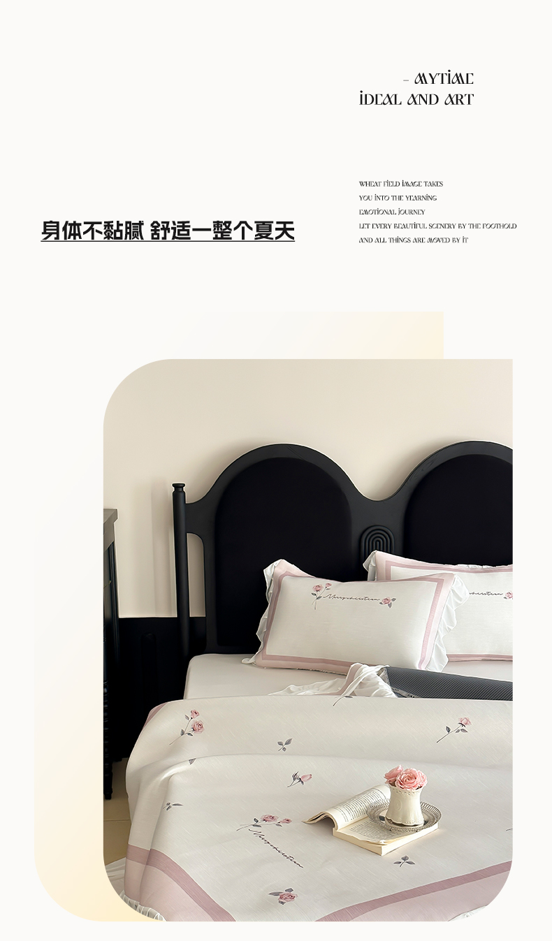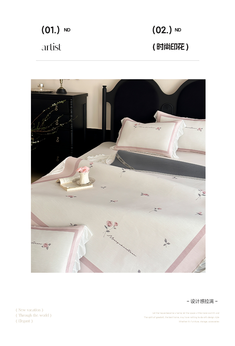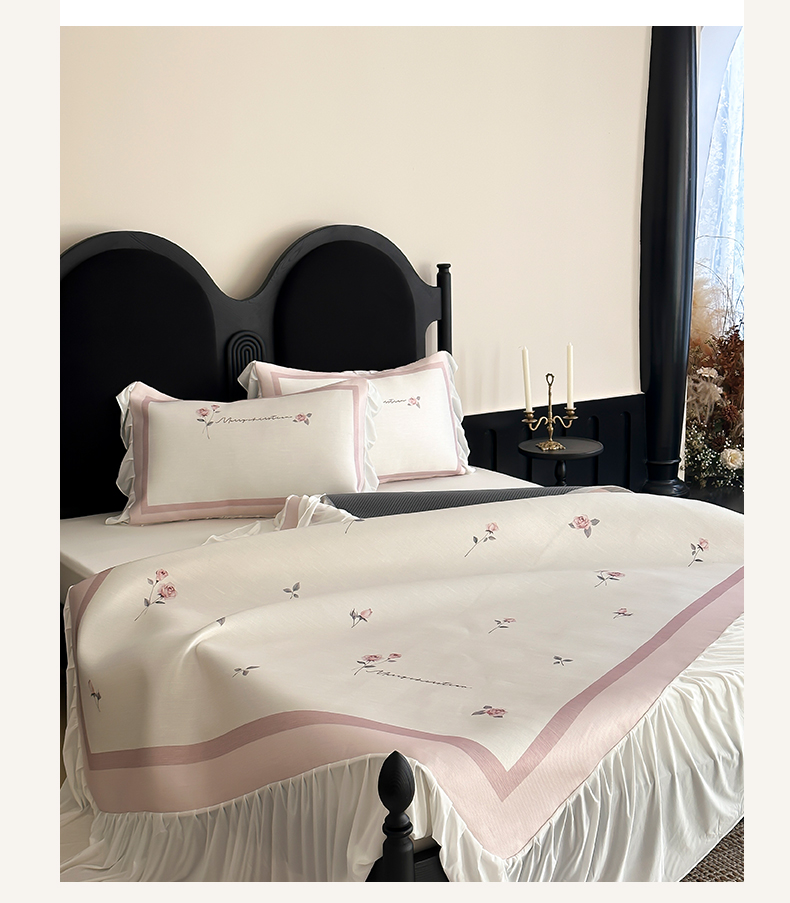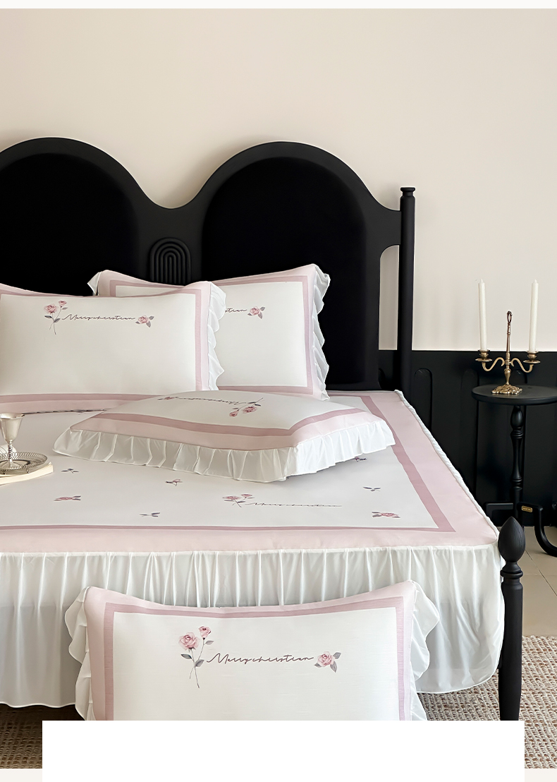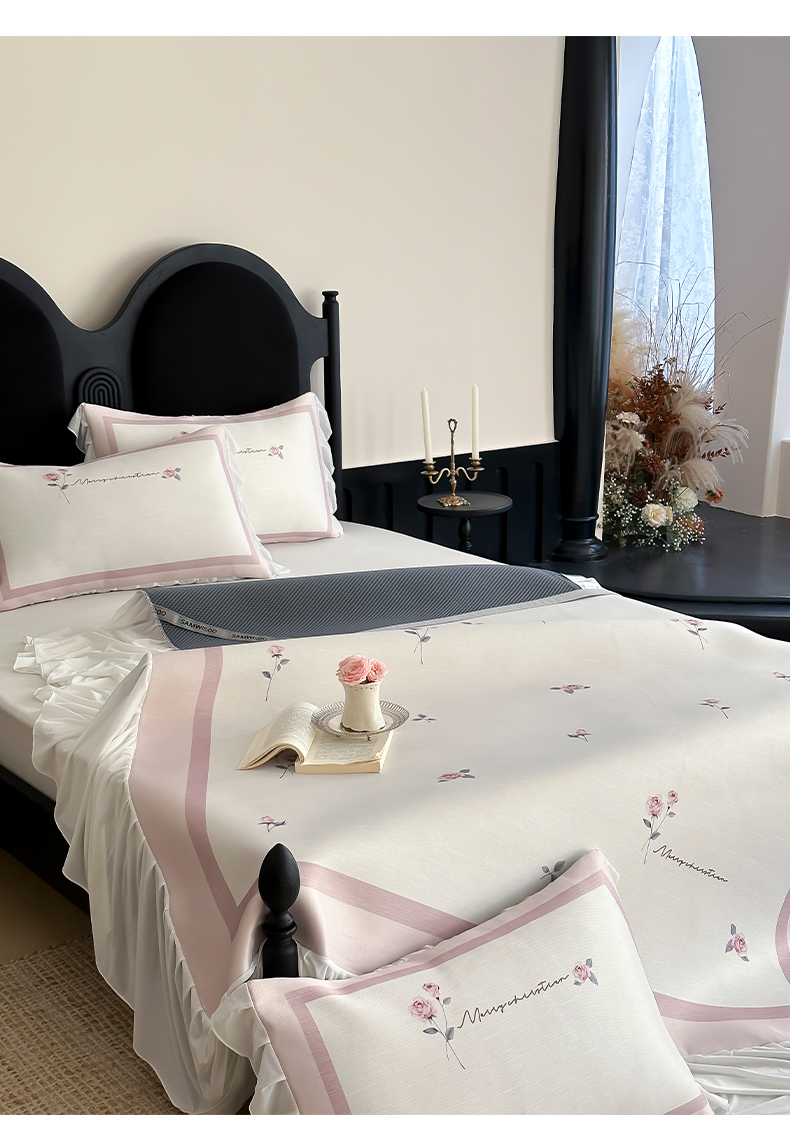 商品名称:三味舒屋 2025新款法式床裙款数码印花冰丝凉席三件套 床裙-米蕾粉