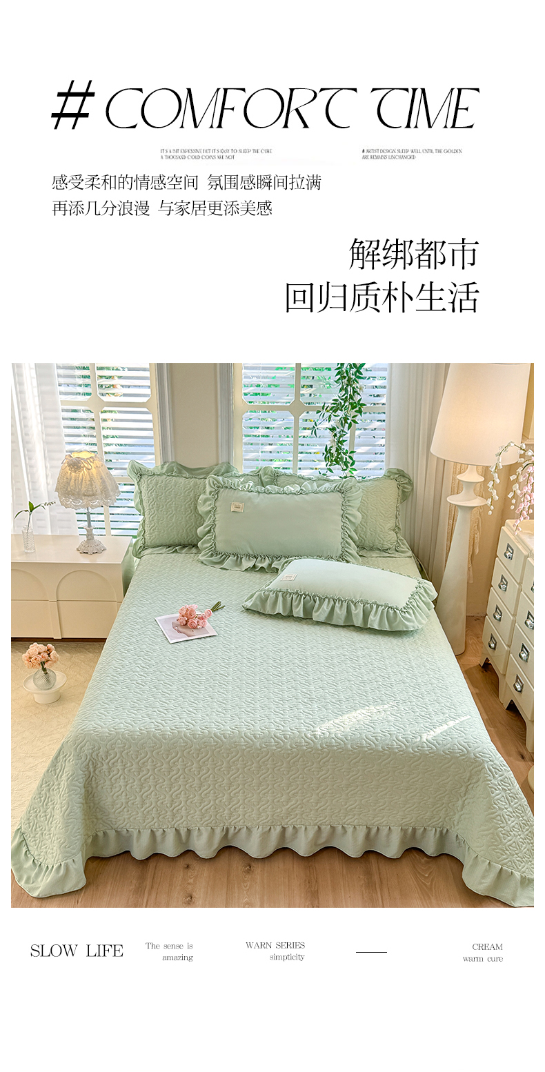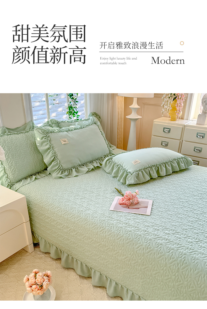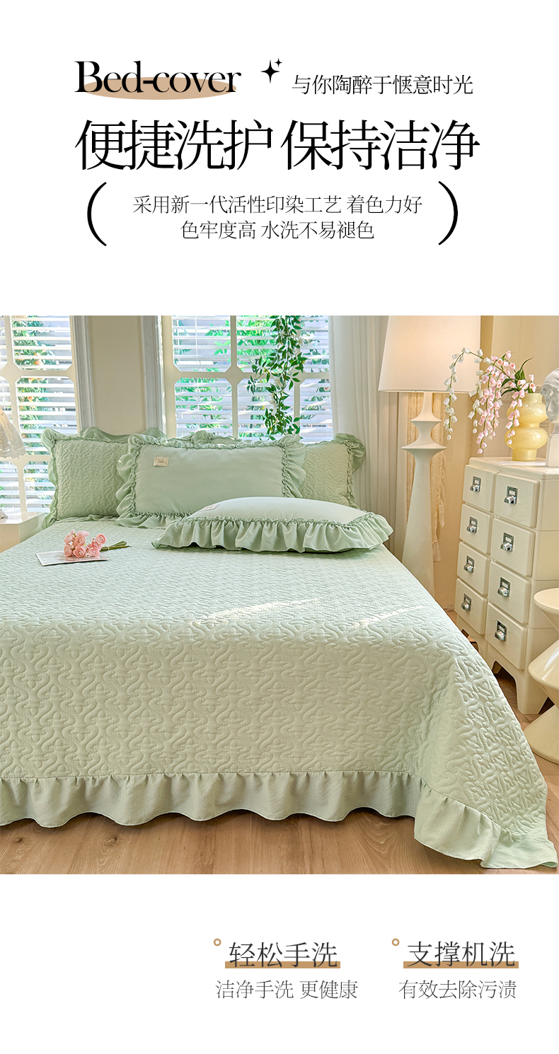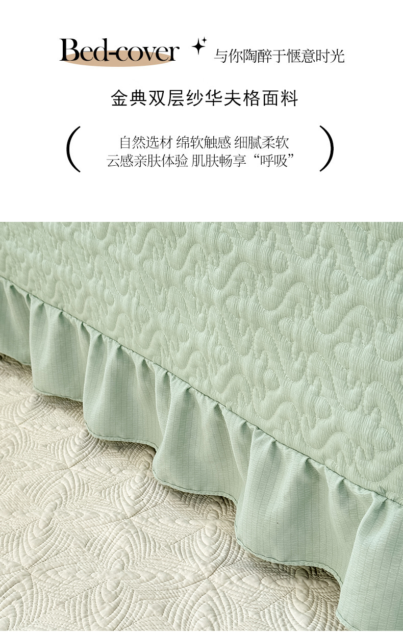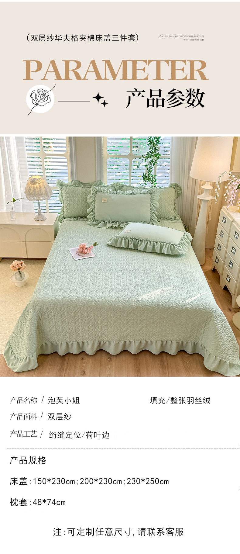 当前位置: 91家纺网 > 商品网购 > 床品套件 > 三件套 > 花香四季家纺 2025新款泡芙小姐双层纱华夫格柔棉夹棉绗缝床盖床垫子单件三件套 泡芙小姐-绿