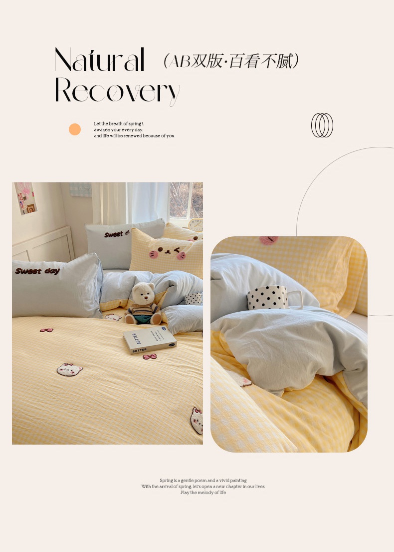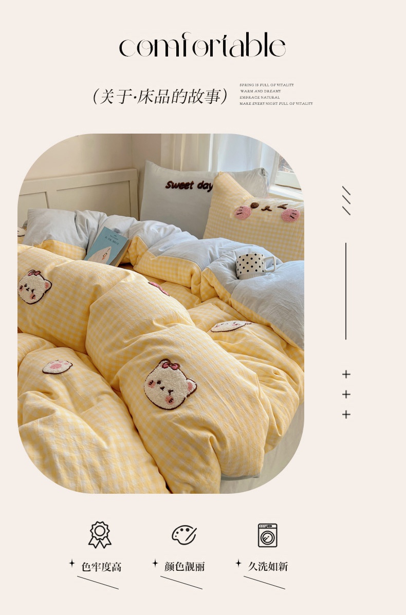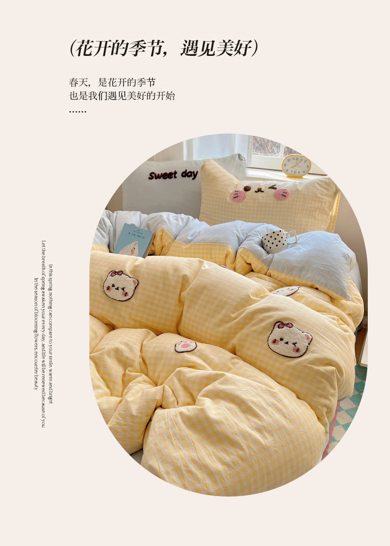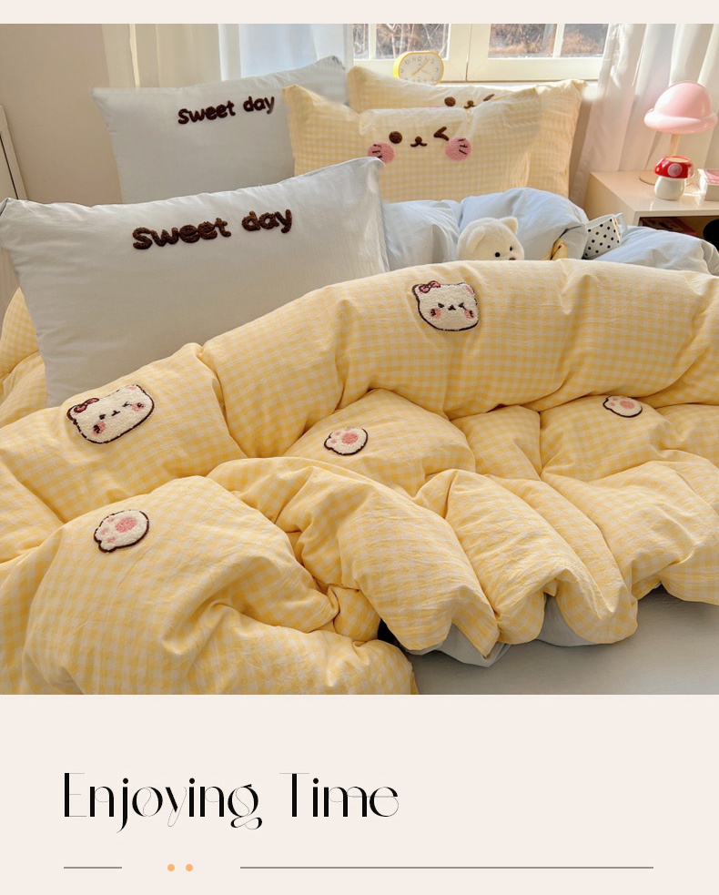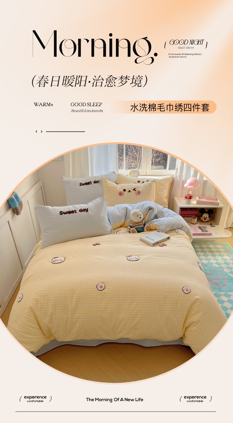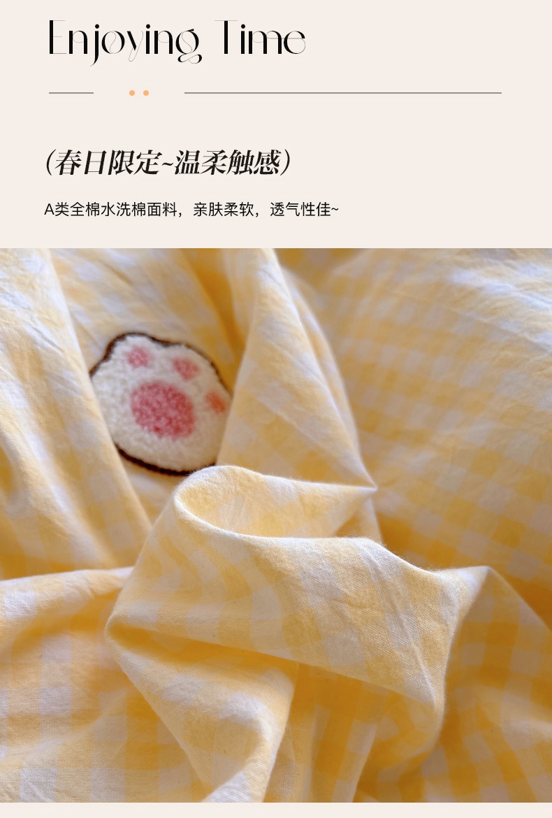 当前位置: 91家纺网 > 商品网购 > 床品套件 > 四件套 > 全棉普通四件套 > 丽涵家纺 2025新款色织水洗棉毛巾绣四件套-甜心小猫系列 甜心小猫-黄格-简单款