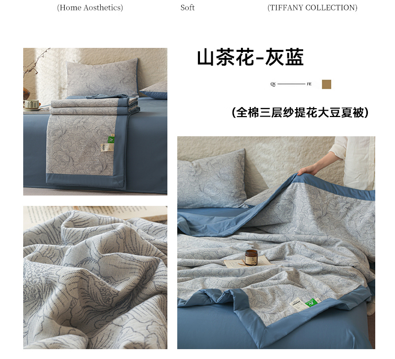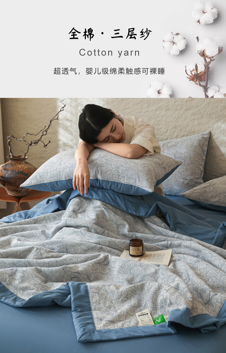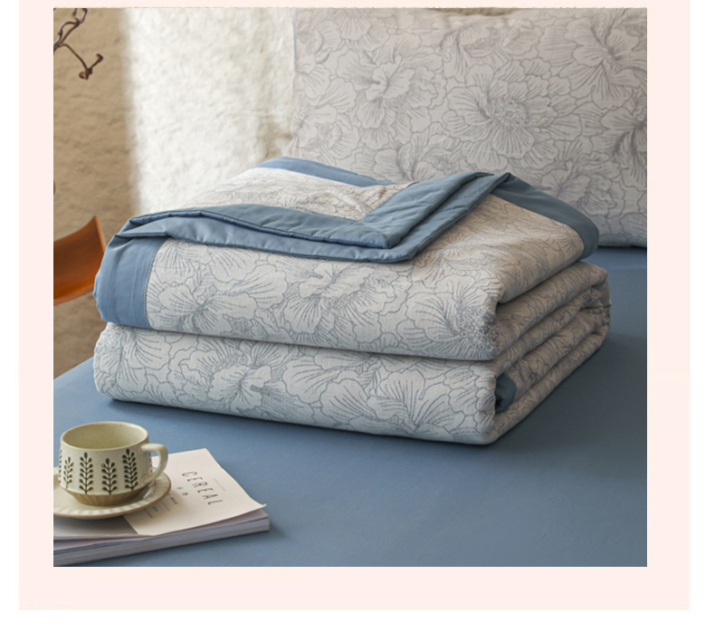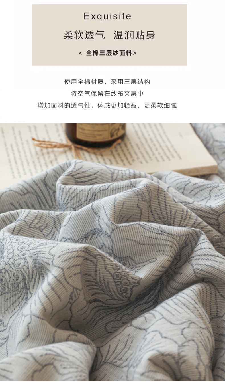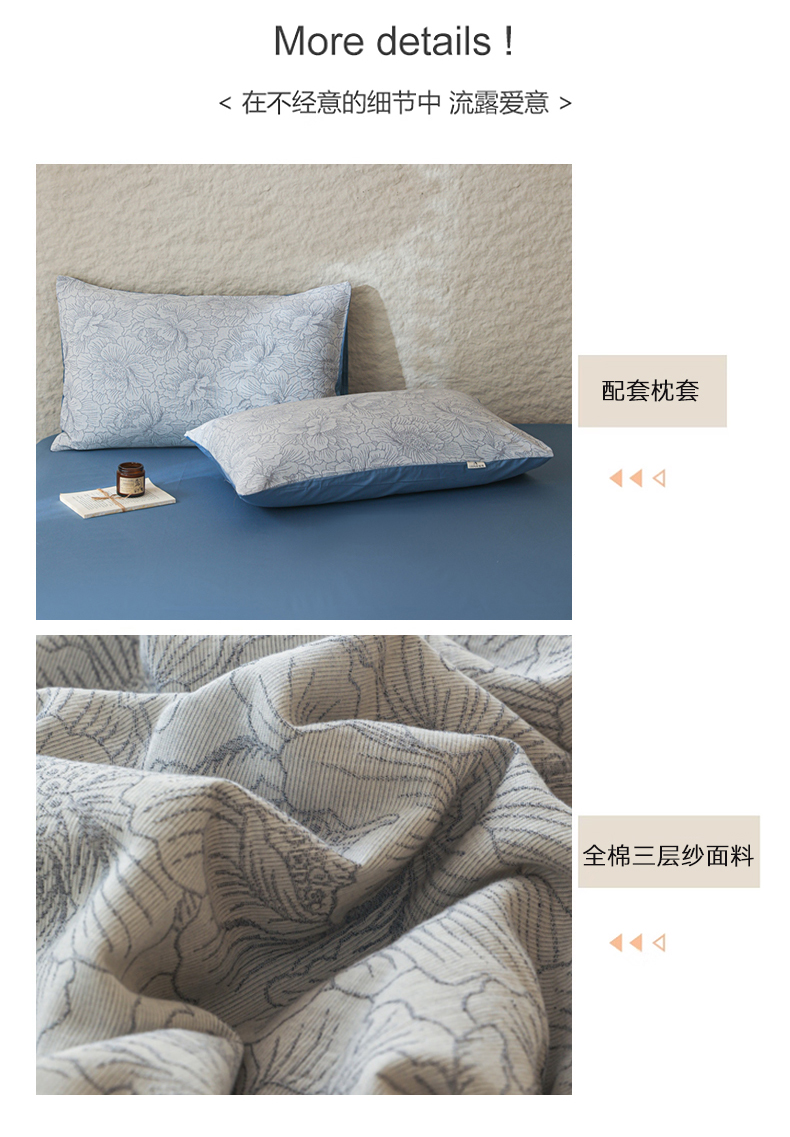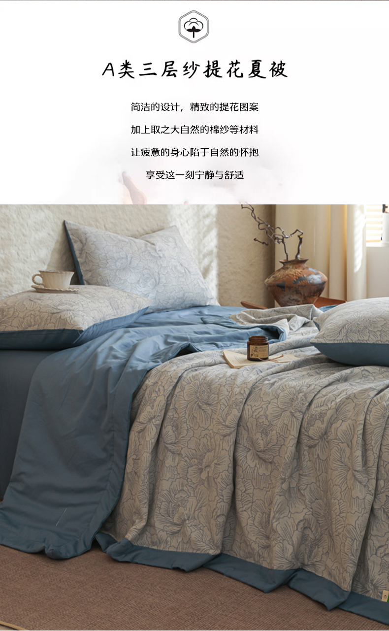 当前位置: 91家纺网 > 商品网购 > 床品套件 > 四件套 > 提花四件套 > 眠博士 2025新款A类全棉包边三层纱提花夏被四件套 包边三层纱夏被-山茶花-灰蓝