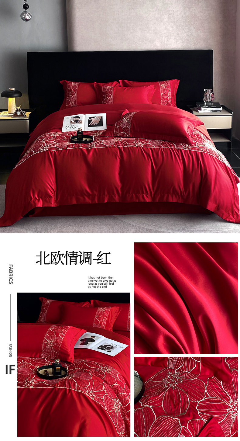 商品名称:优悦 2025新款冰丝简奢绣花四件套 北欧情调-红