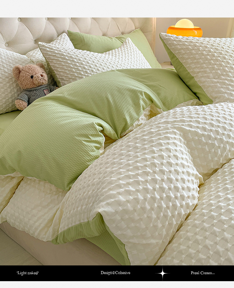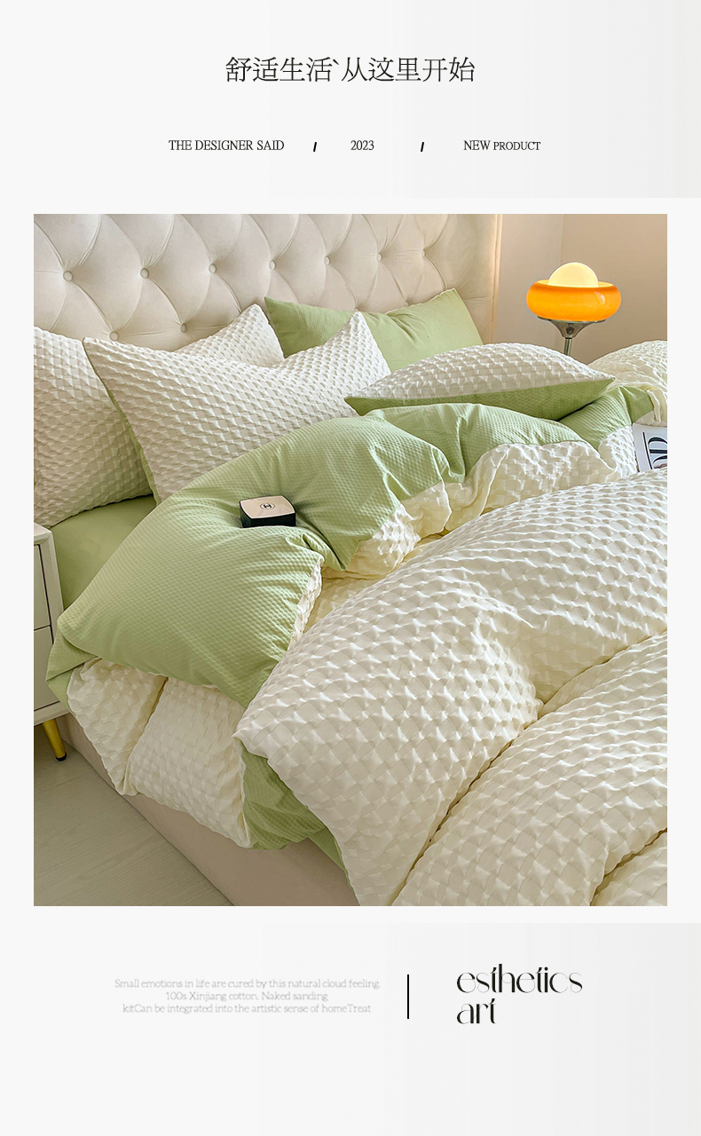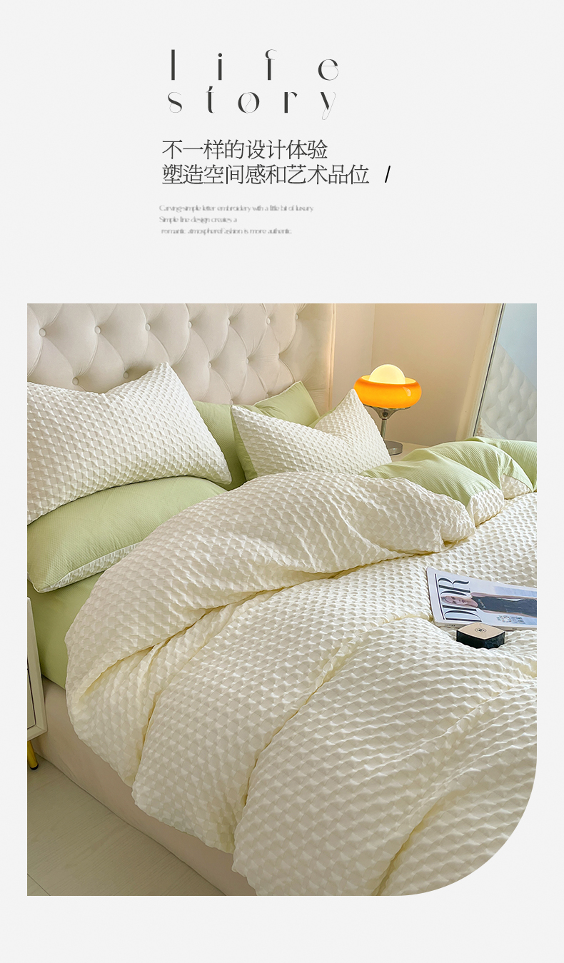 悦织湾家纺 2025新款色织提花立体四件套 提花水立方奶白果绿
