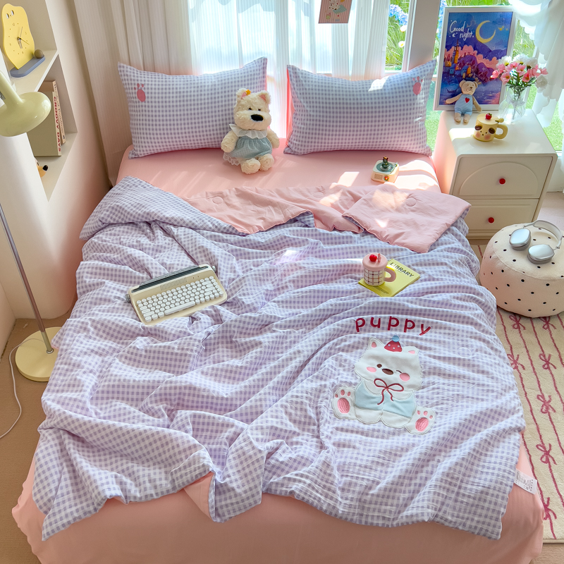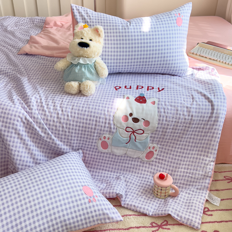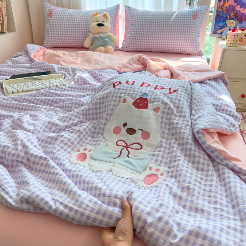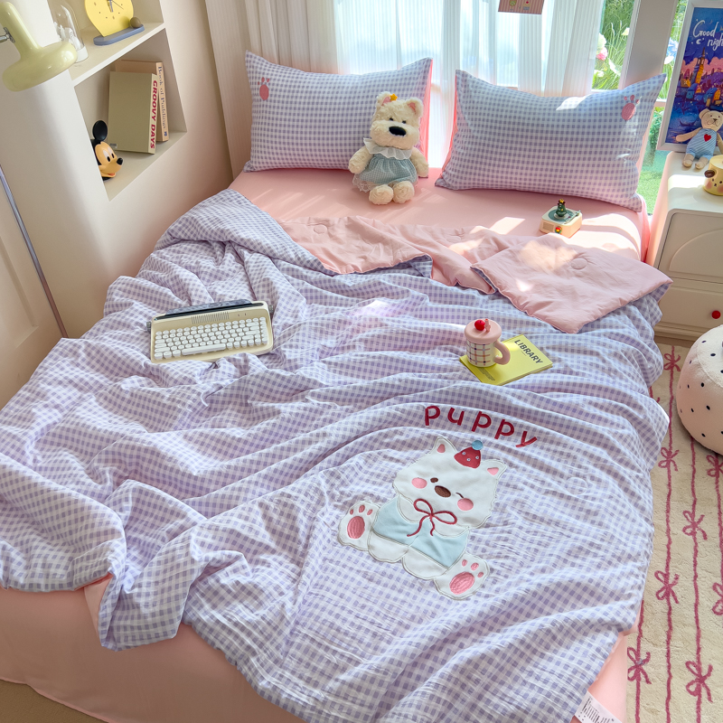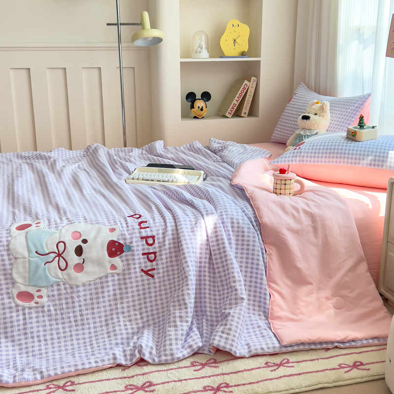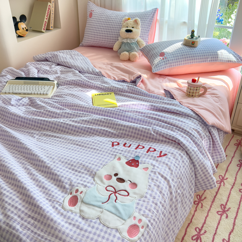 商品名称:N先生+V 13814689556 发大图/买家秀 2025新款超柔水洗棉贴布绣夏被夏凉被空调被-微笑狗狗系列 微笑狗狗夏被-紫格