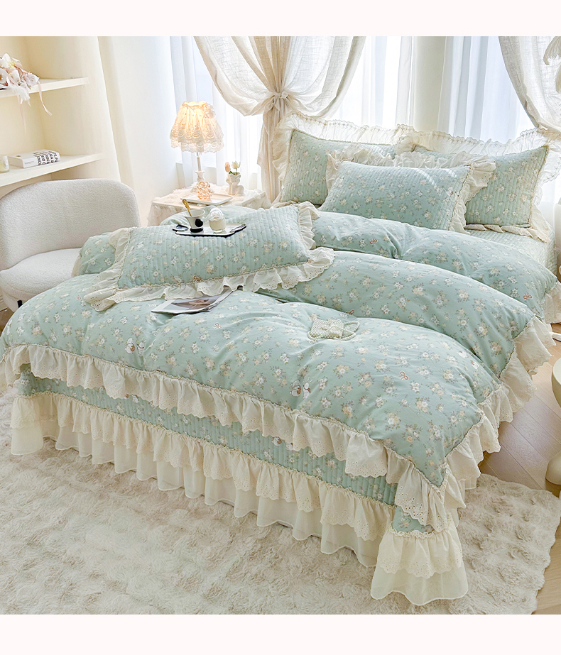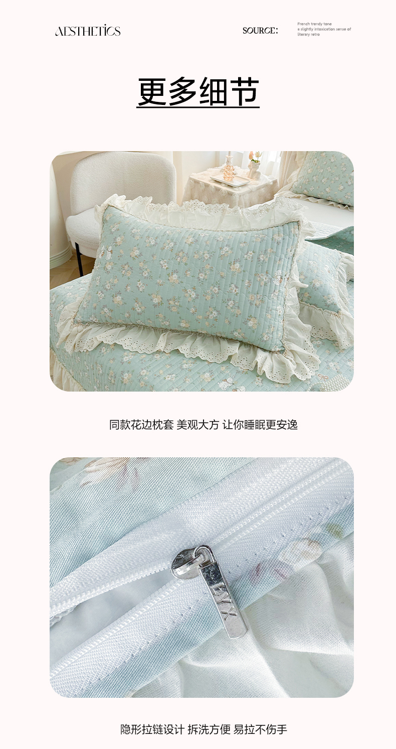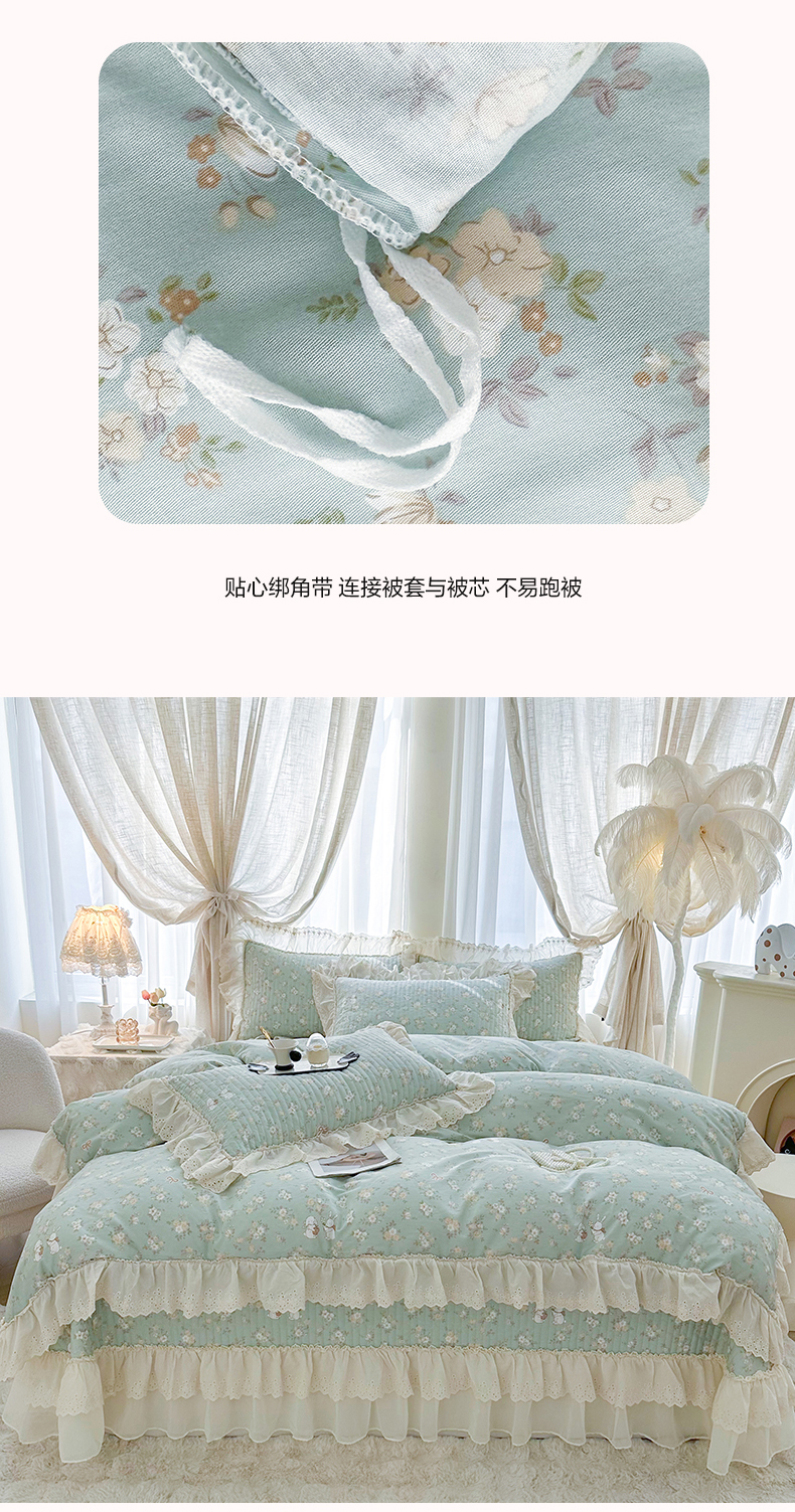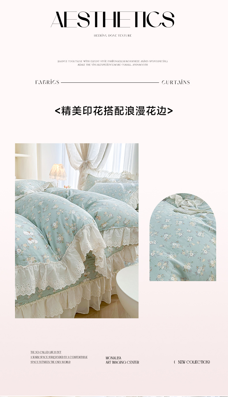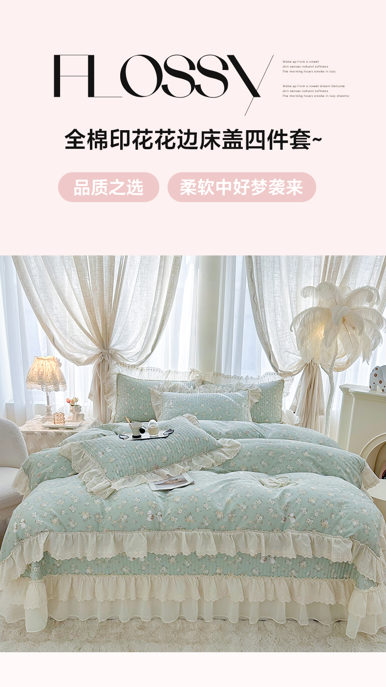 当前位置: 91家纺网 > 商品网购 > 床品套件 > 四件套 > 全棉普通四件套 > 罗艺轩 2025新款全棉印花花边床盖四件套 花蜜-绿