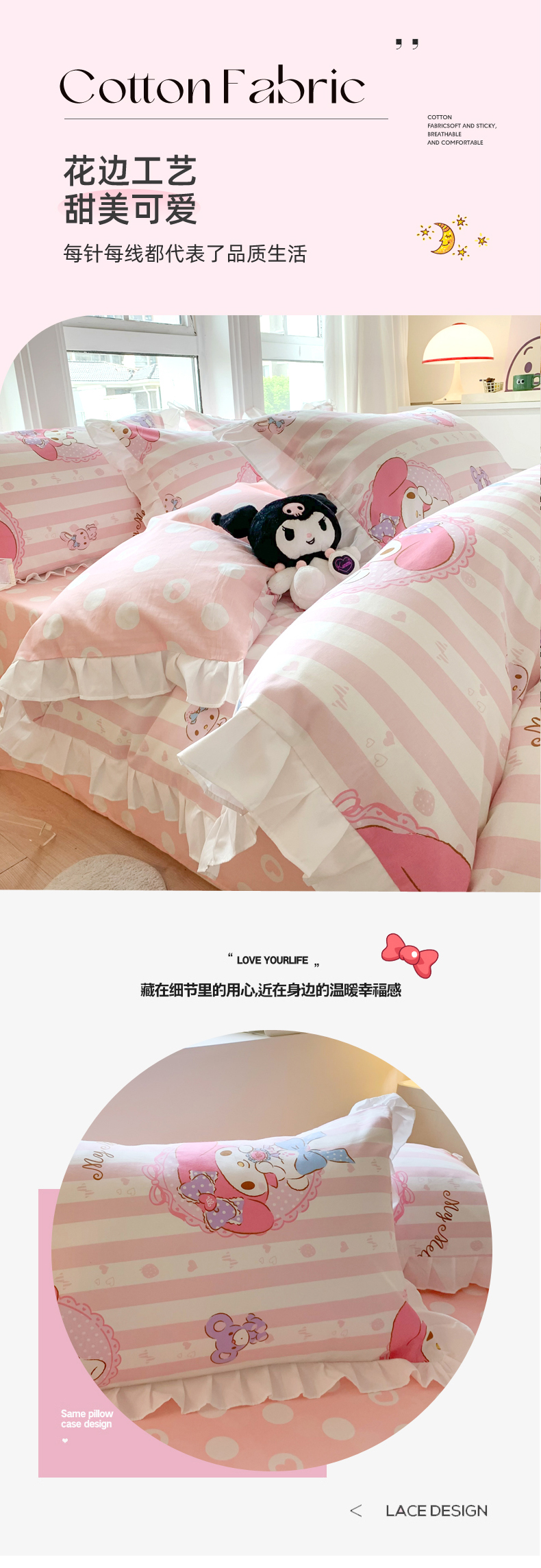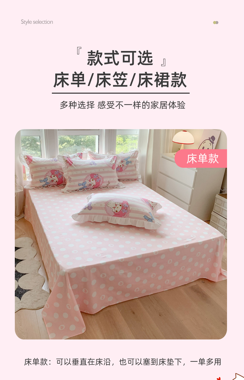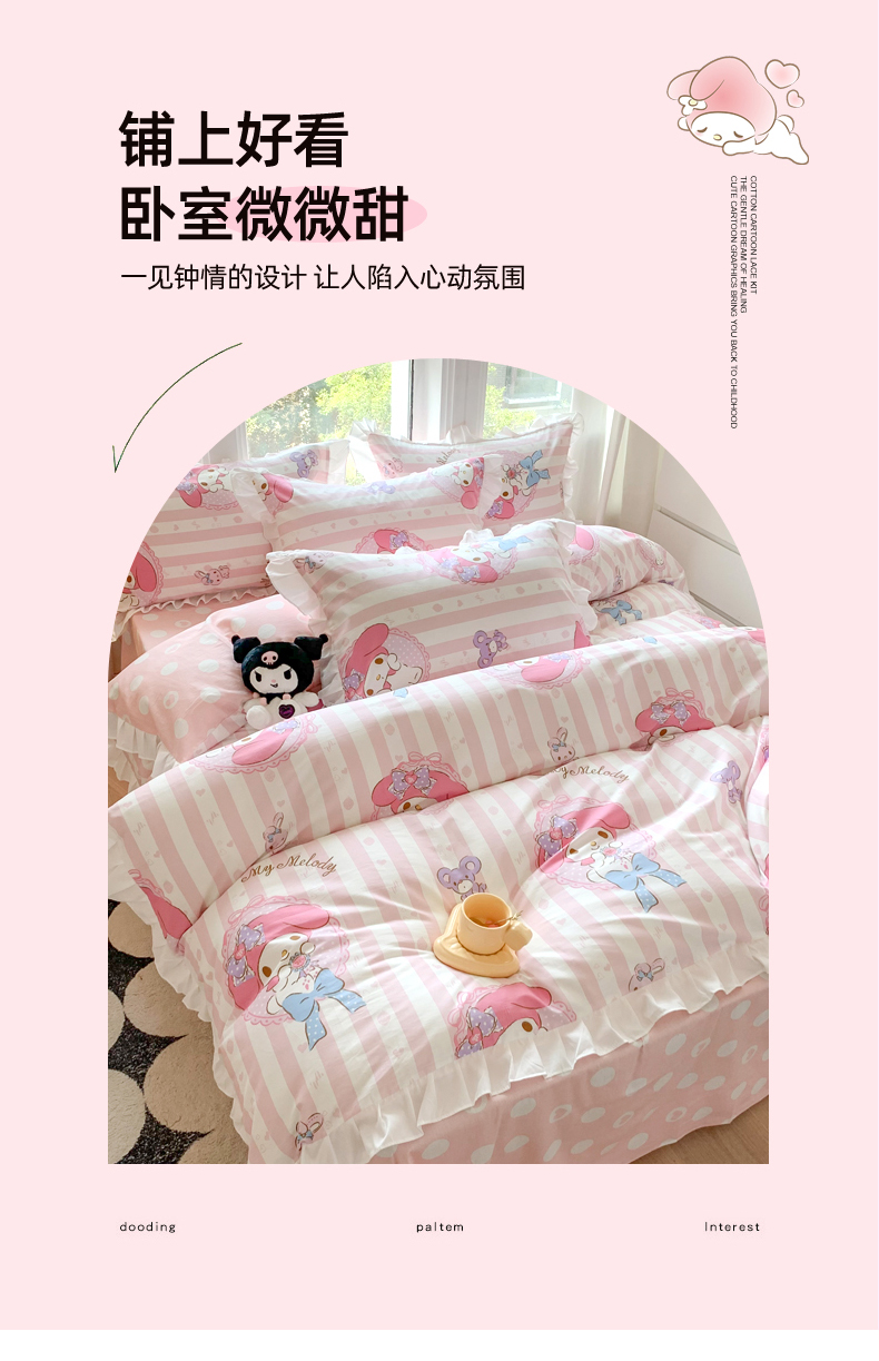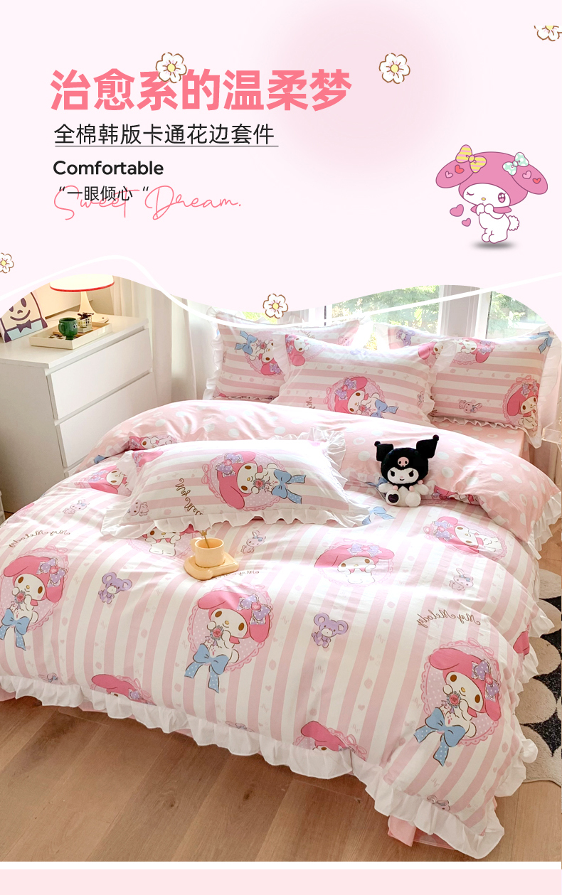 当前位置: 91家纺网 > 商品网购 > 床品套件 > 四件套 > 全棉普通四件套 > 玉元坊 2025年5月新品 三丽鸥花边被套全棉床单纯棉床裙床笠三四件套-美乐蒂系列 甜甜美乐蒂【花边款】
