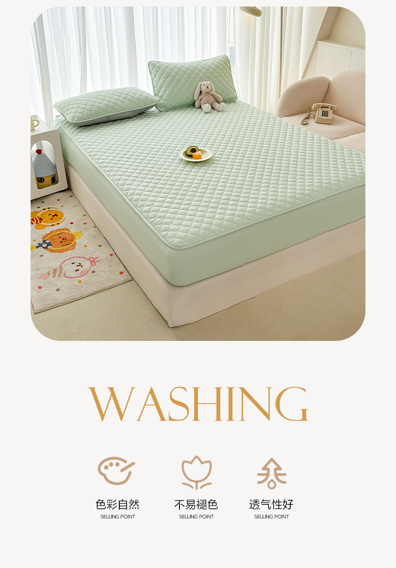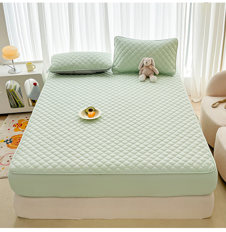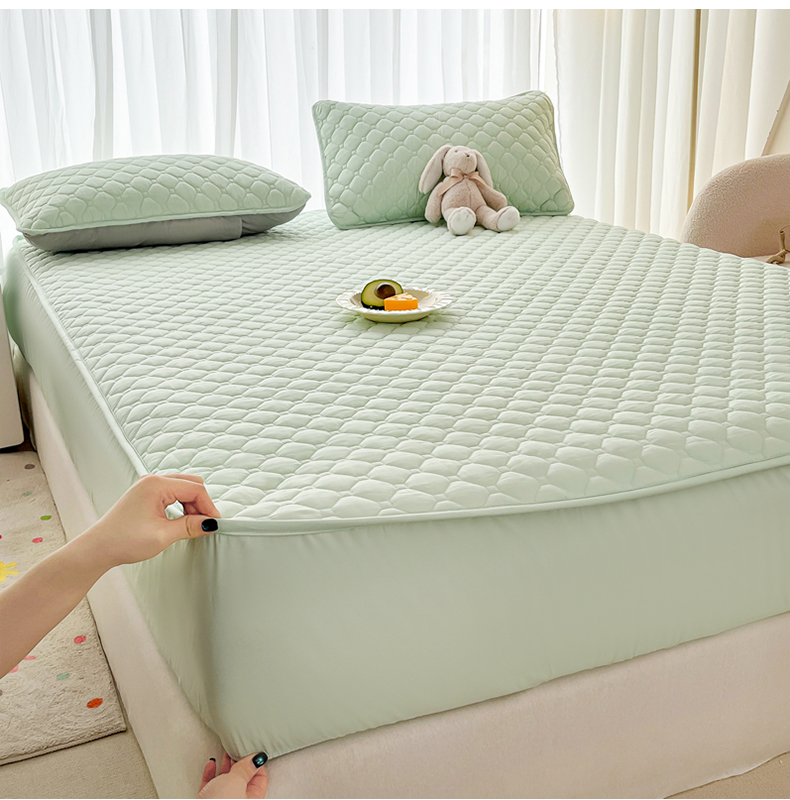 • 91家纺网 家纺一手货源 找家纺 欧邦 2025新款四季款纯色水洗棉夹棉床笠床垫保护罩 磨毛方格-浅绿