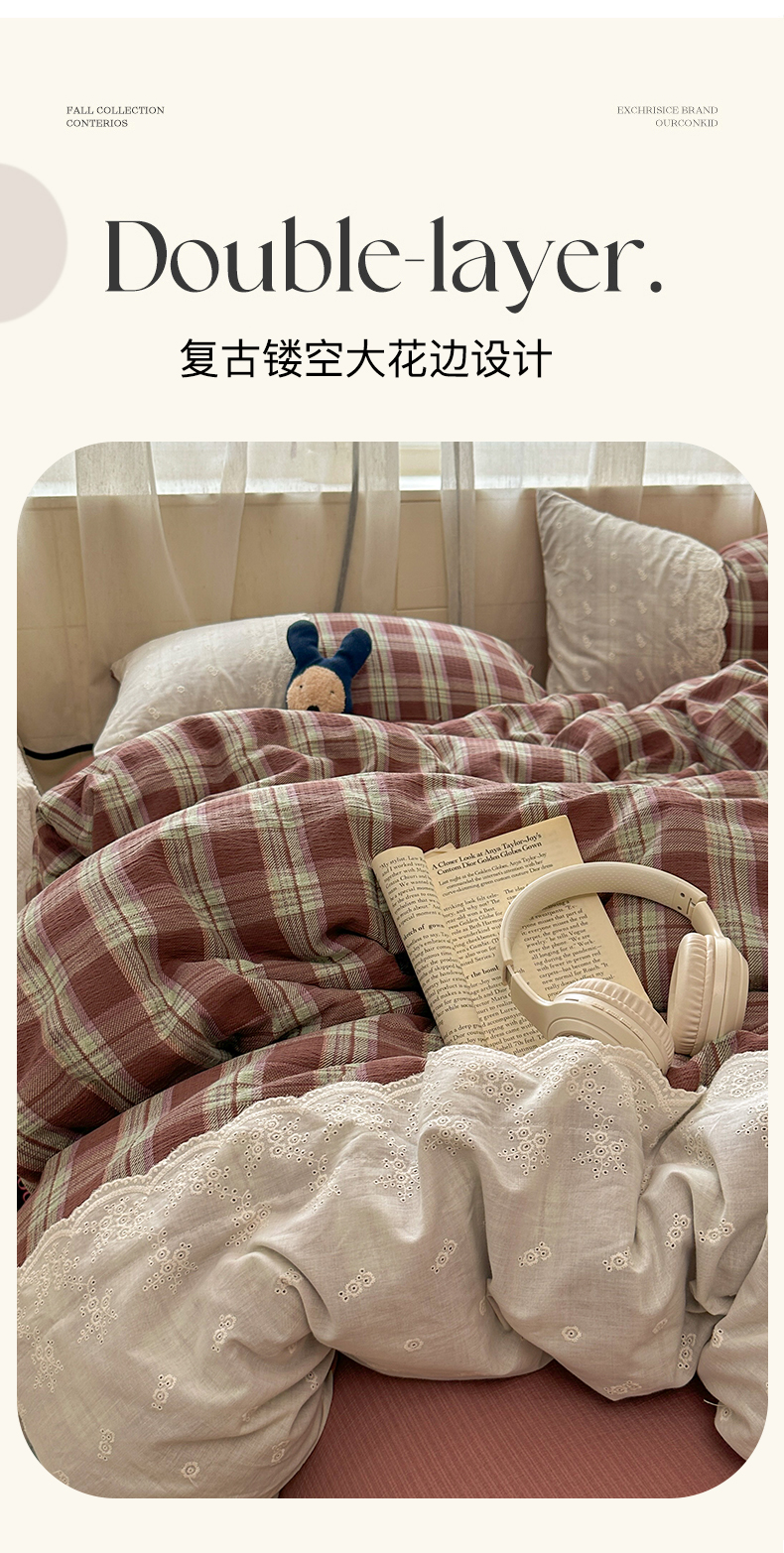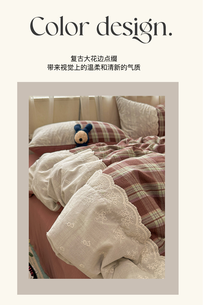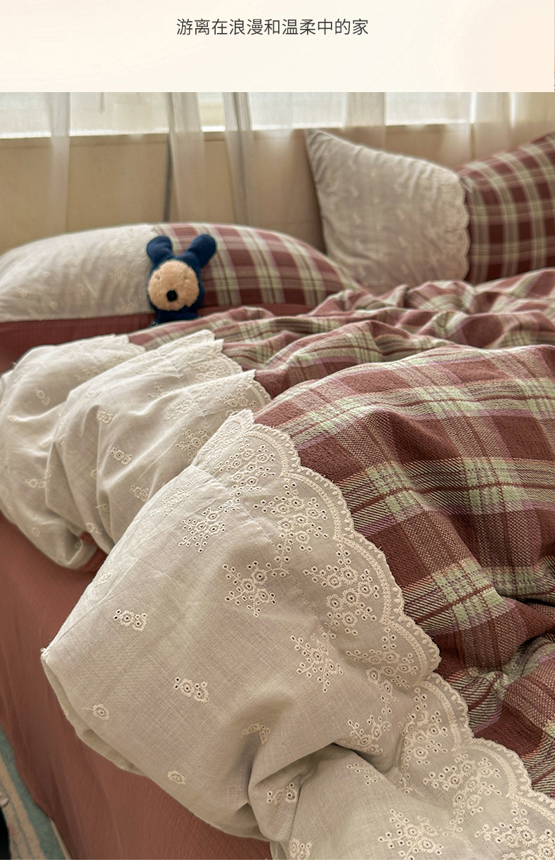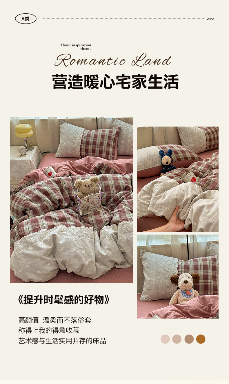当前位置: 91家纺网 > 商品网购 > 床品套件 > 四件套 > 其它四件套 > 晚爱家纺(原晚安家居) 2025新款韩系少女风蕾丝花边四件套云感木棉双层纱-苏菲 苏菲·深咖格