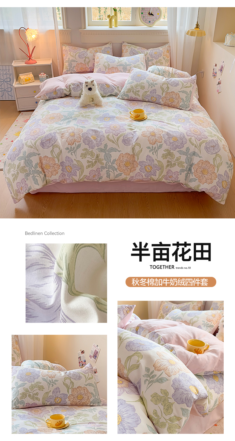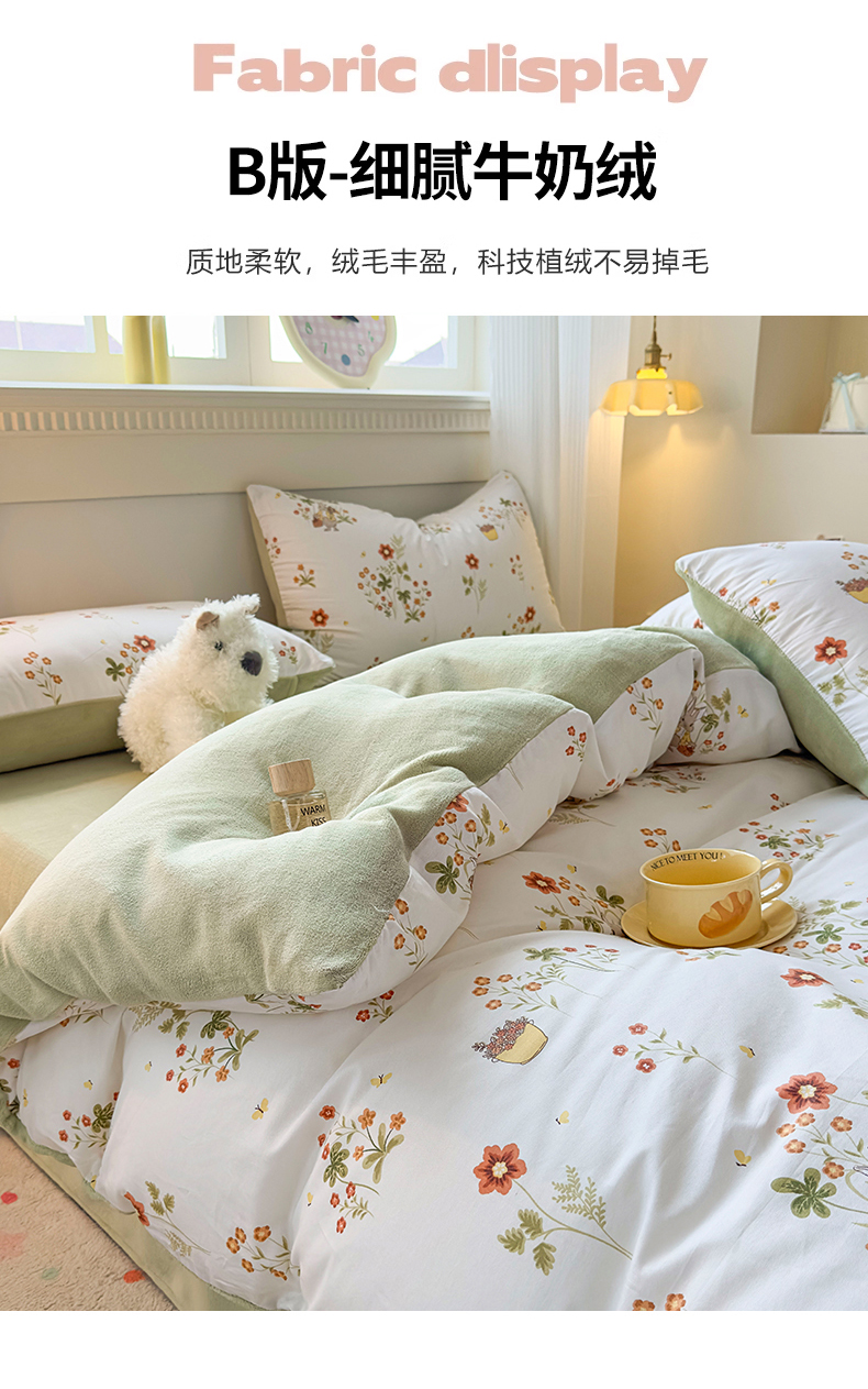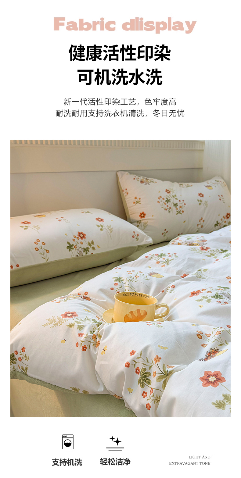 商品名称:KA家纺 2025新款秋冬A棉B绒纯棉牛奶绒棉加绒四件套 花间小趣