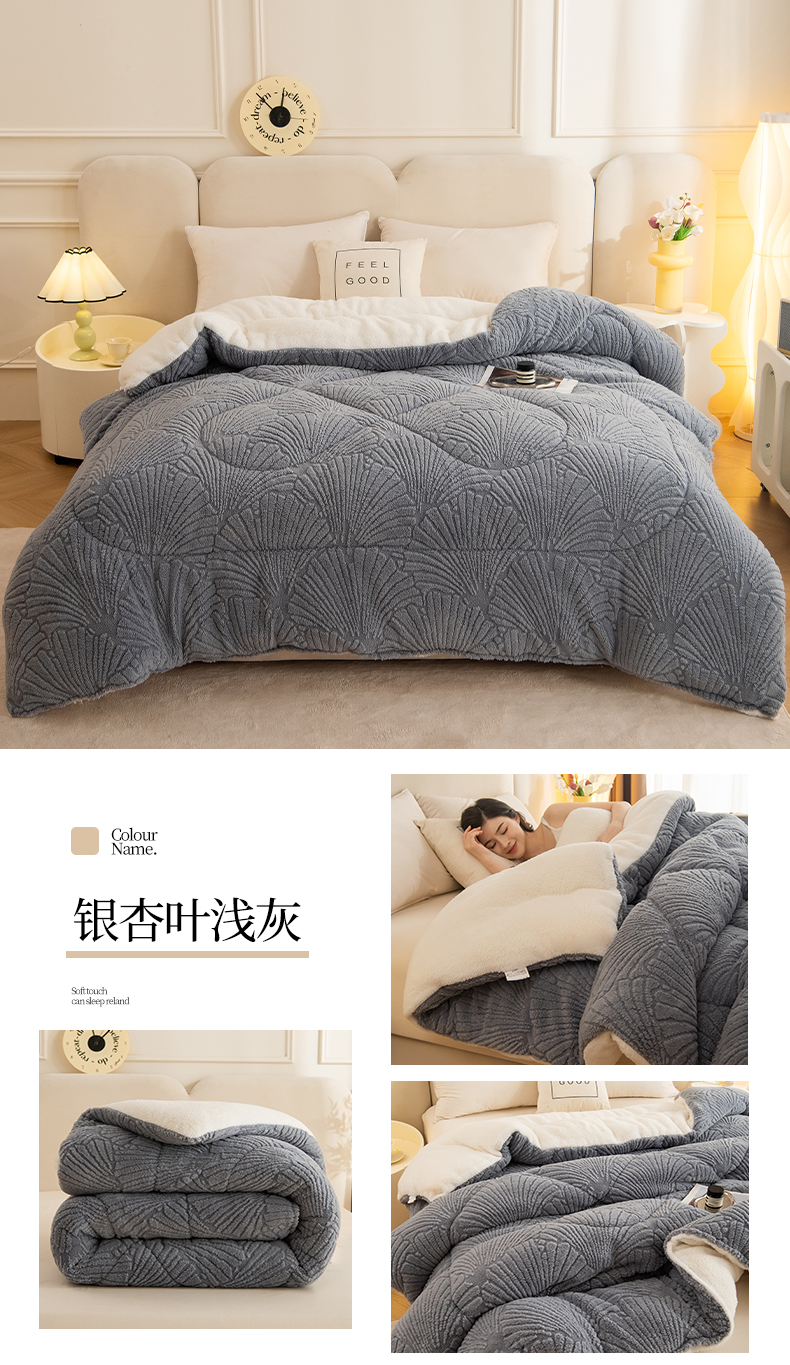 商品名称:畅销被业 2025新款跨境外贸塔芙绒羊羔绒提花系列冬被子被芯 银杏叶深灰