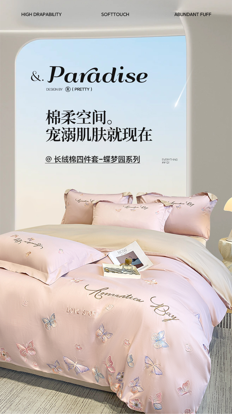 (总)桃园 新款纯棉全棉长绒棉磨毛不掉毛四件套高端礼盒-蝶町系列(包含买家秀),白粉,飘蓝,香芋紫,轻奢粉