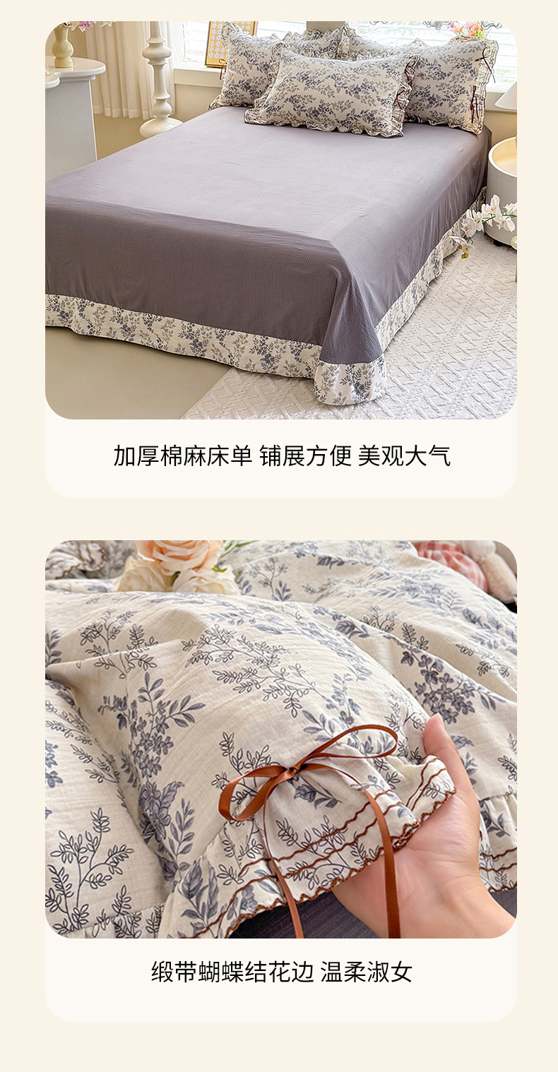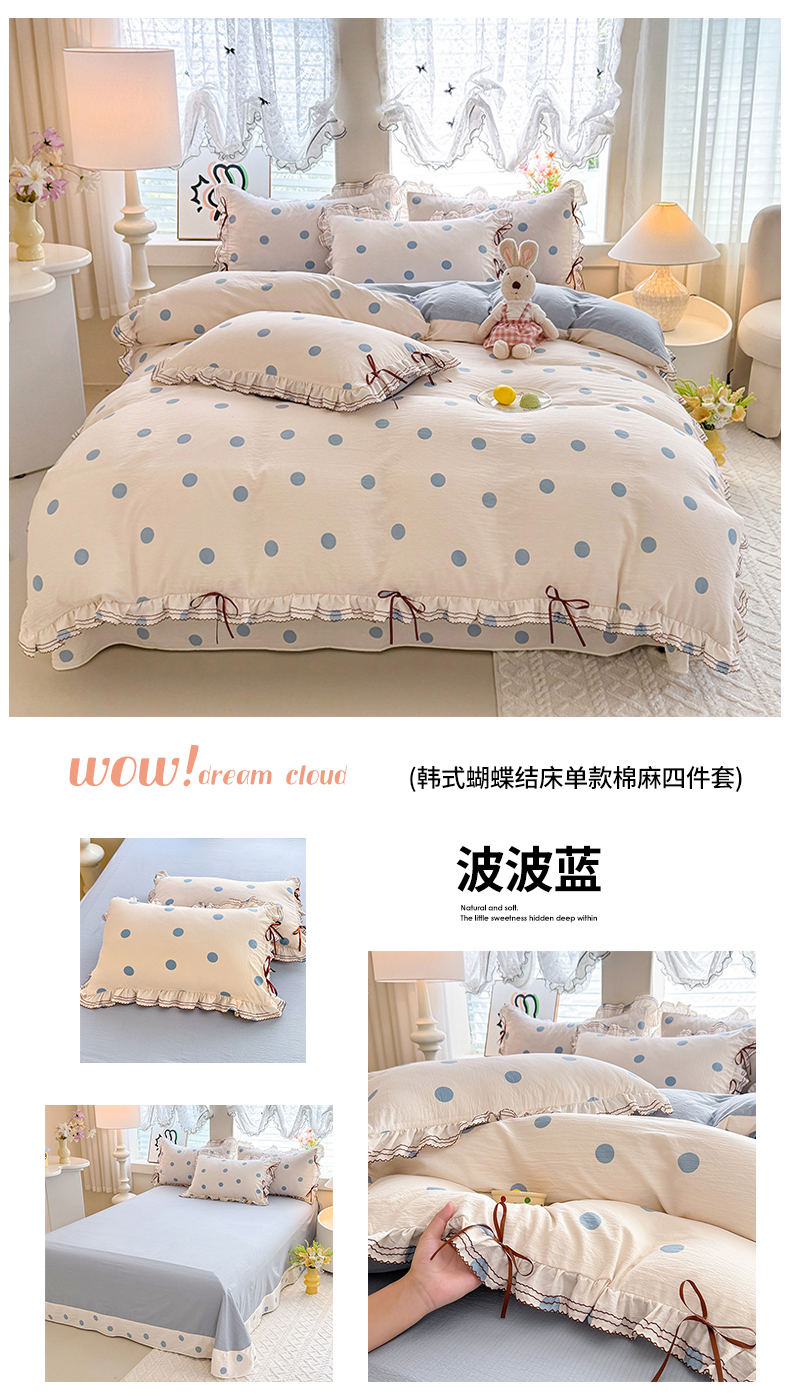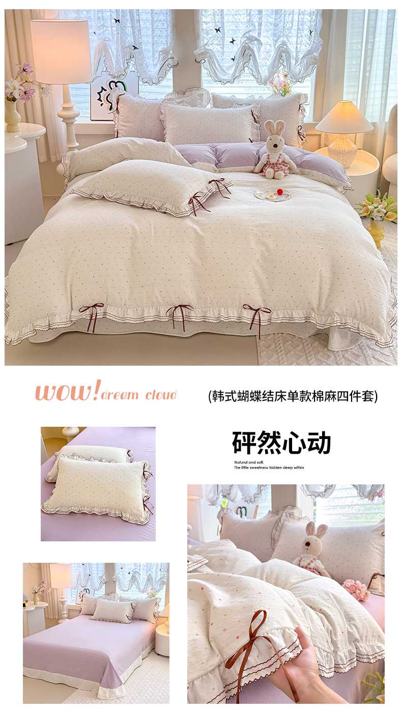 商品名称:韩约家纺 2025新款1韩式蝴蝶结加厚床单款棉麻四件套 心动