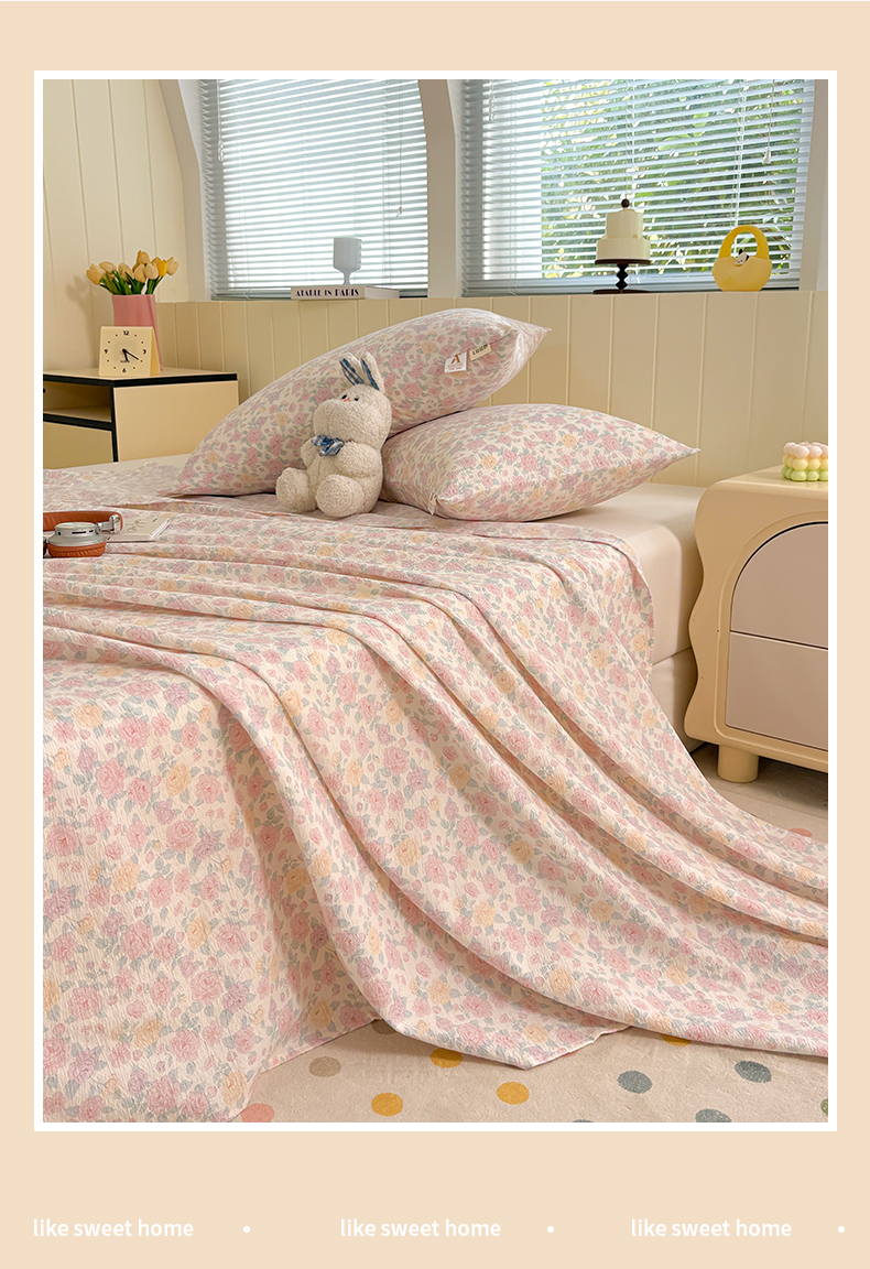(总)青泽家纺 2025新款水洗棉皱皱纱双层纱床单三件套,芝士奶酪,半亩花田,田园女孩,疏影之心,南瓜派对,萌兔兔,萌宠乐园,梨花落,花园小兔,花间序语,海盐耶耶,乖乖象,格子小狗,豆蔻年华,花轻舞,半岛红茶