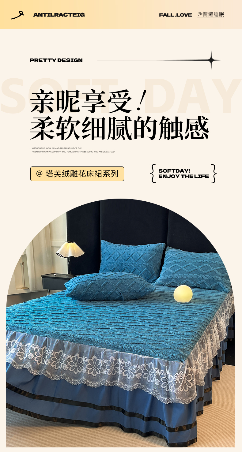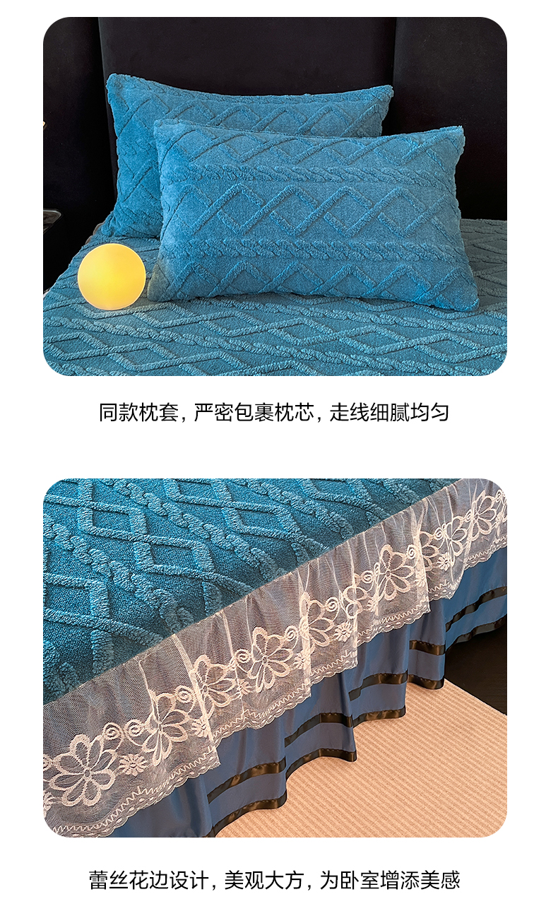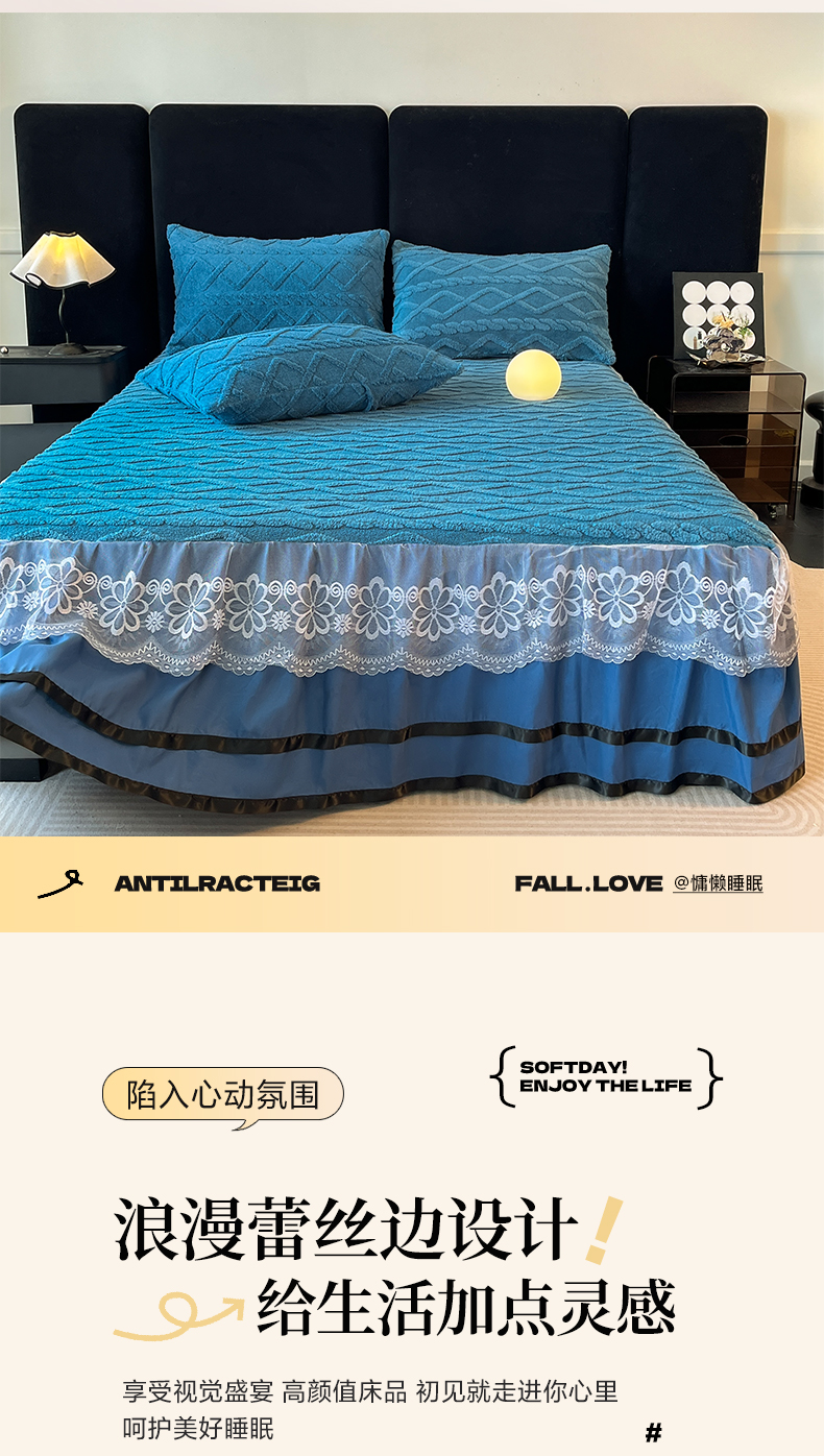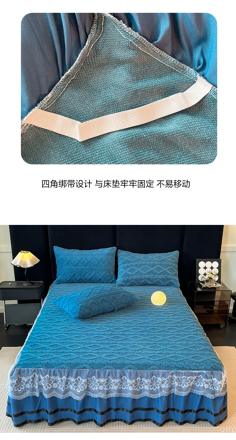 • 91家纺网 家纺一手货源 找家纺 米瑞娜  2025新款塔芙绒雕花蕾丝床裙跨境外贸 宝蓝
