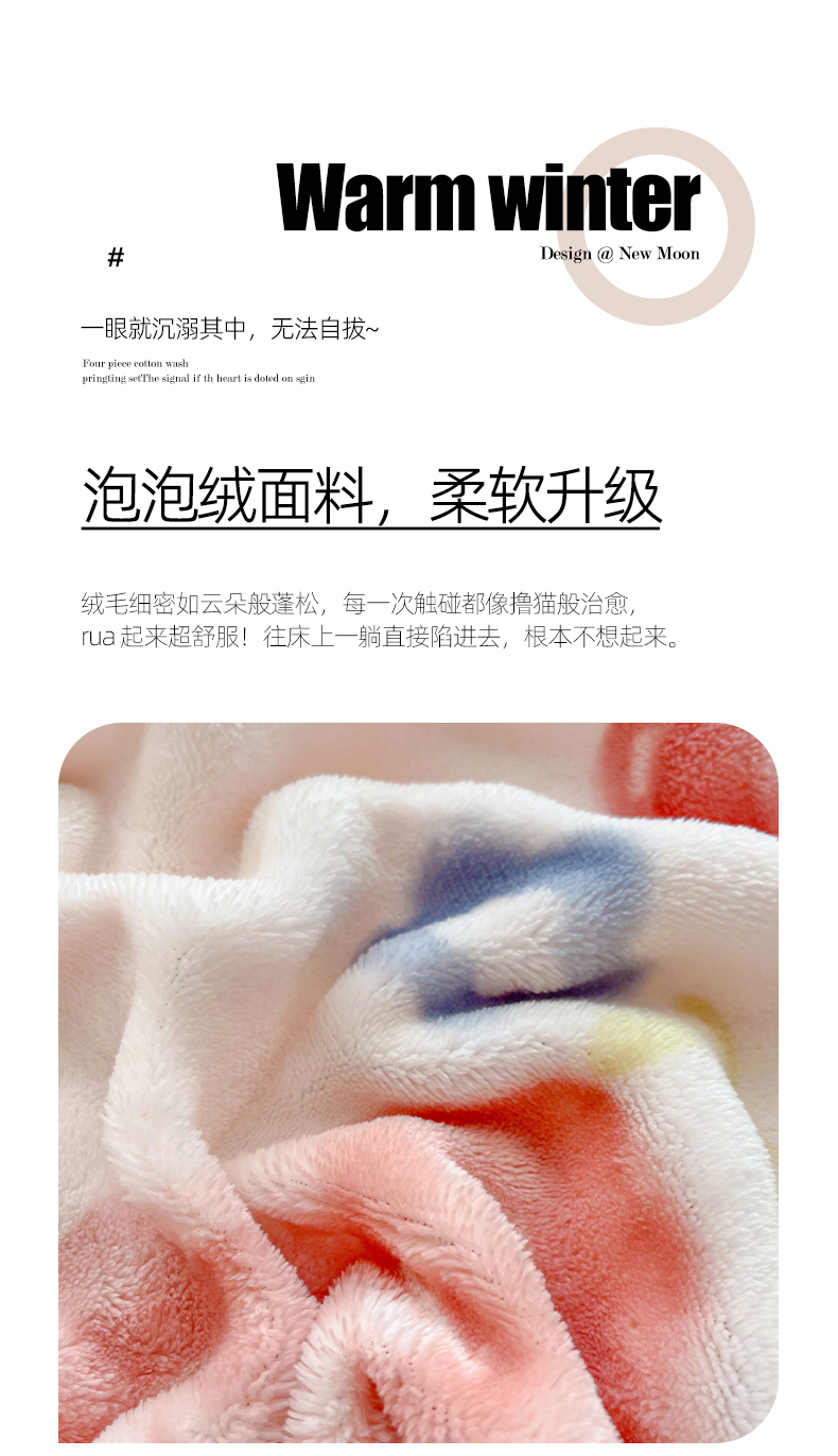 (总)慕梵家居 2024新款雪花绒四件套牛奶绒法莱绒套件,爱心兔,彩虹,草莓兔,繁花似锦,欢乐花朵,恐龙蓝,毛球,绅士熊,太空熊,泰迪熊,桃子少女,小波浪,小恐龙,小萝卜,小南瓜,心想事橙,星星熊,樱桃女孩,枝繁叶茂,字母熊