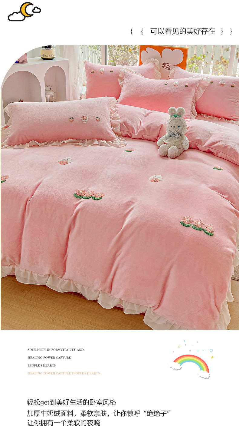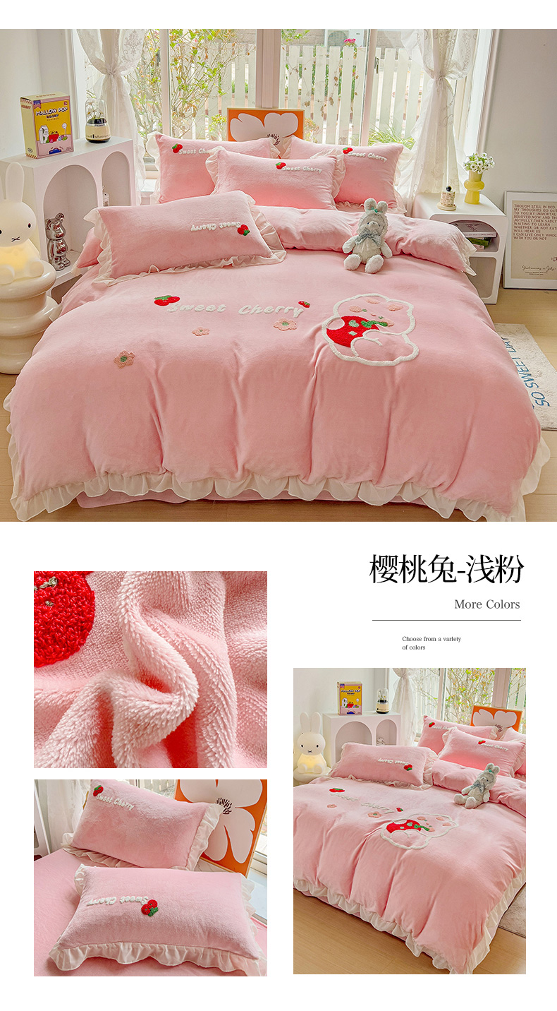 当前位置: 91家纺网 > 商品网购 > 床品套件 > 四件套 > 牛奶绒四件套 > 眷恋家纺 2025新款韩版毛巾绣小蕾丝荷叶边牛奶绒四件套迷你兔+樱桃兔系列 樱桃兔-浅蓝
