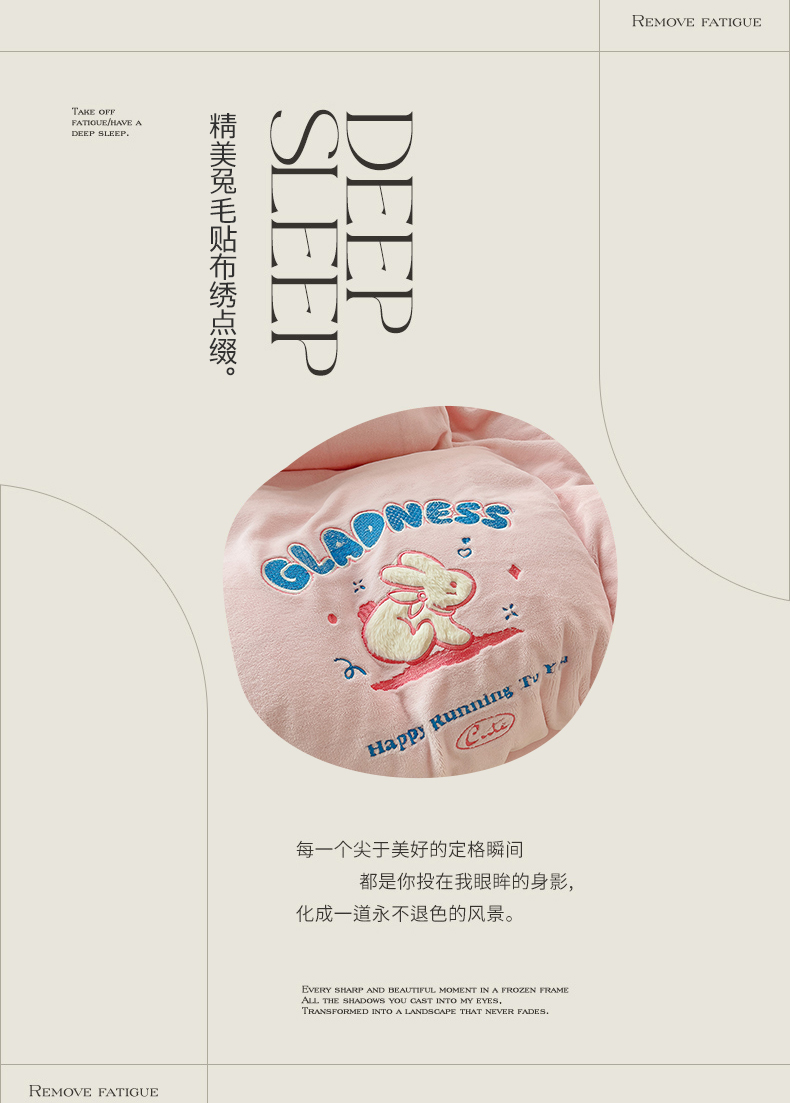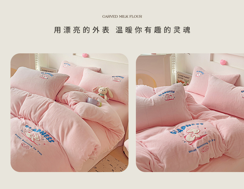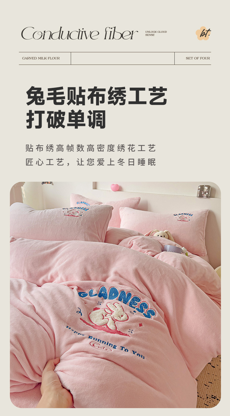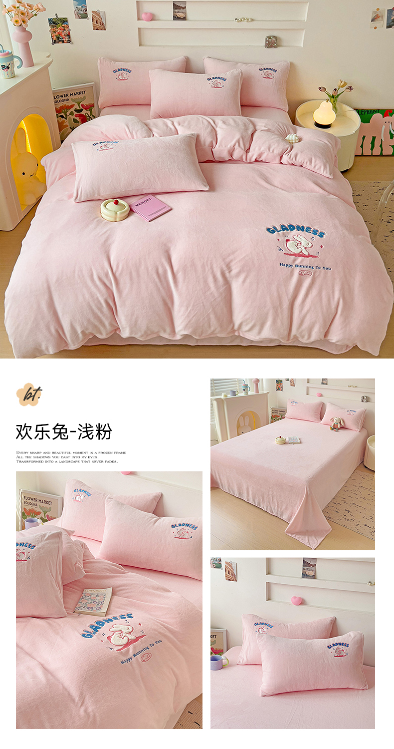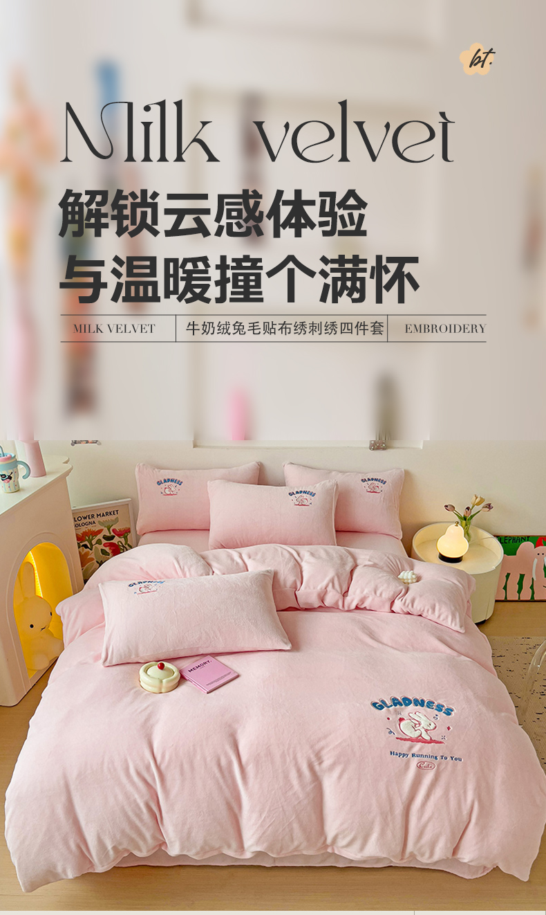 当前位置: 91家纺网 > 商品网购 > 床品套件 > 四件套 > 牛奶绒四件套 > 眷恋家纺 2025新款牛奶绒毛巾绣四件套 欢乐兔-浅粉