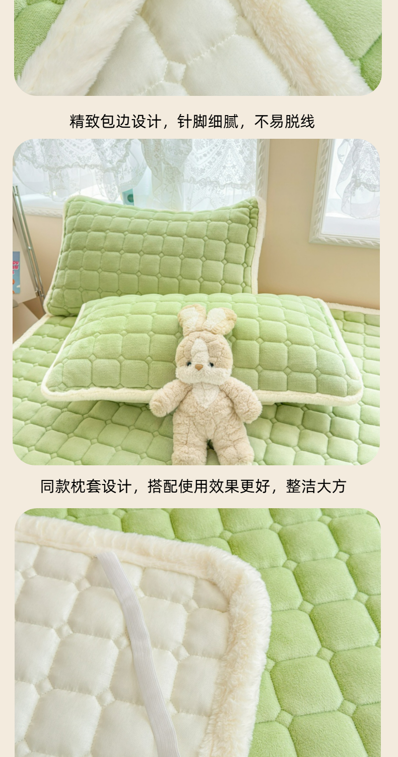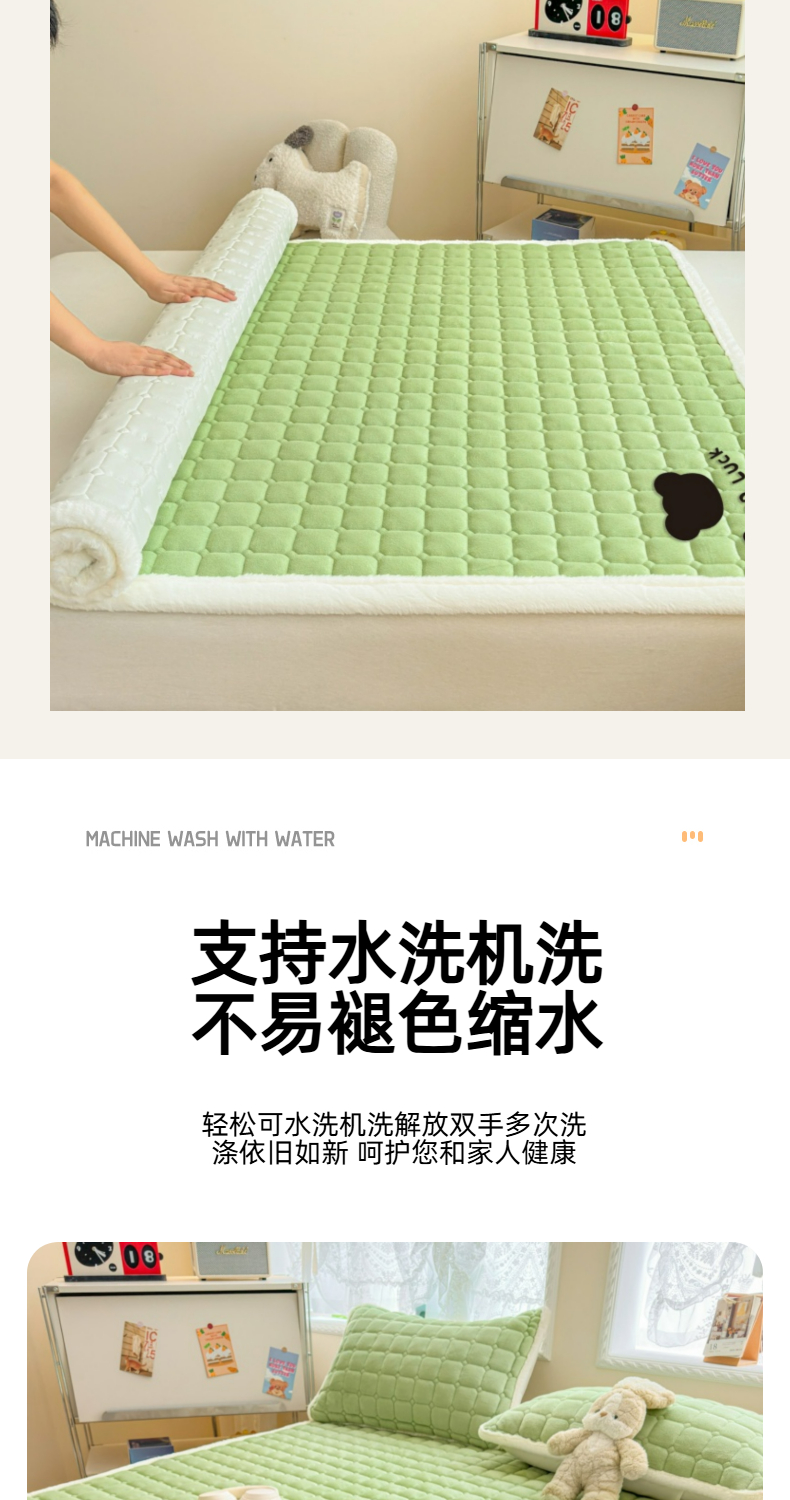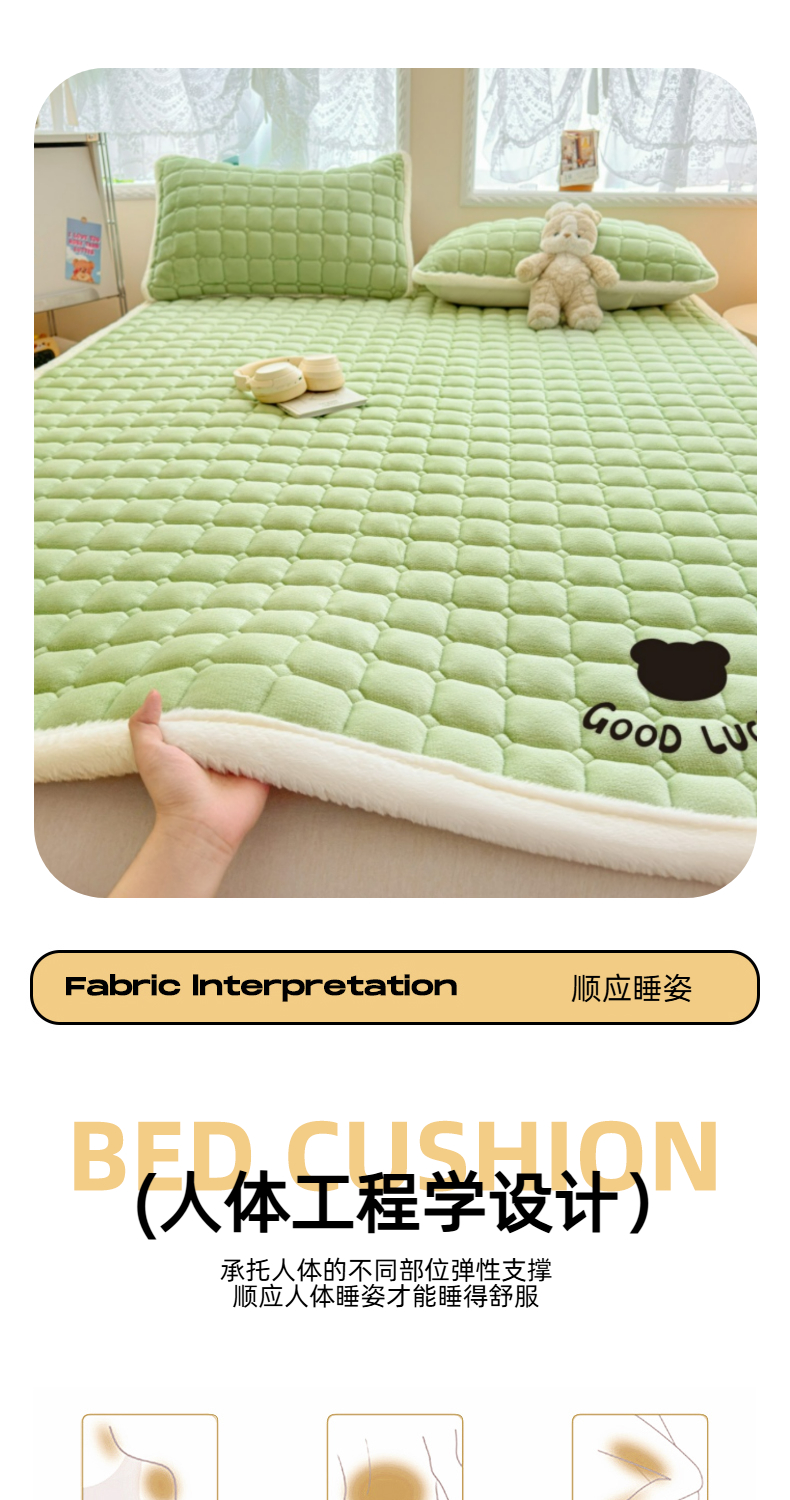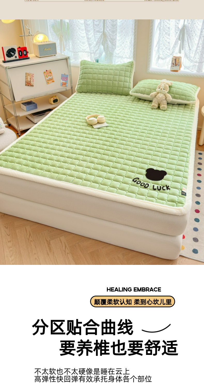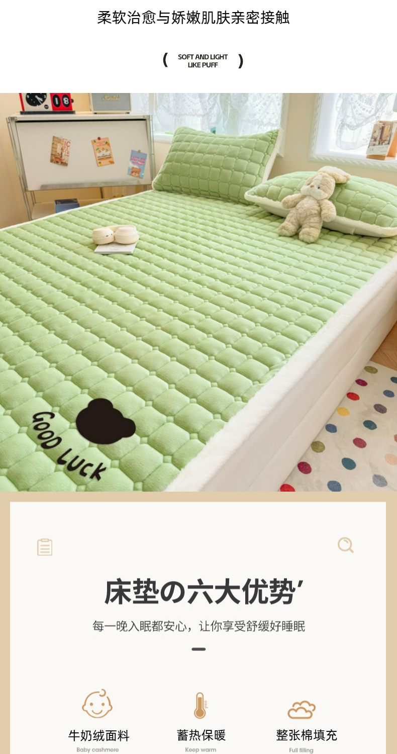 当前位置: 91家纺网 > 商品网购 > 床垫/床褥 > 普通床垫 > 爱屋及屋 2025新款牛奶绒纯色床护垫-好运熊大床系列 草绿