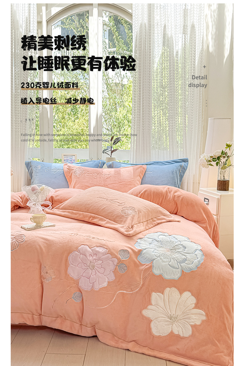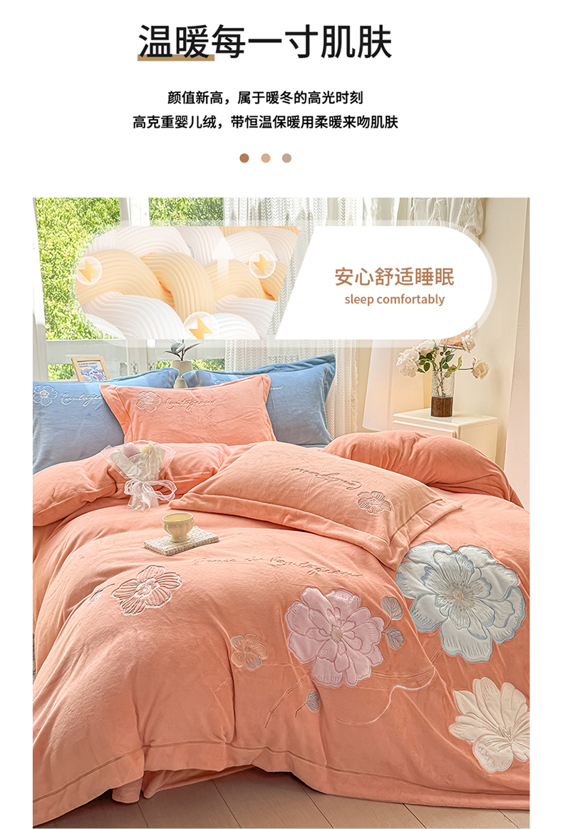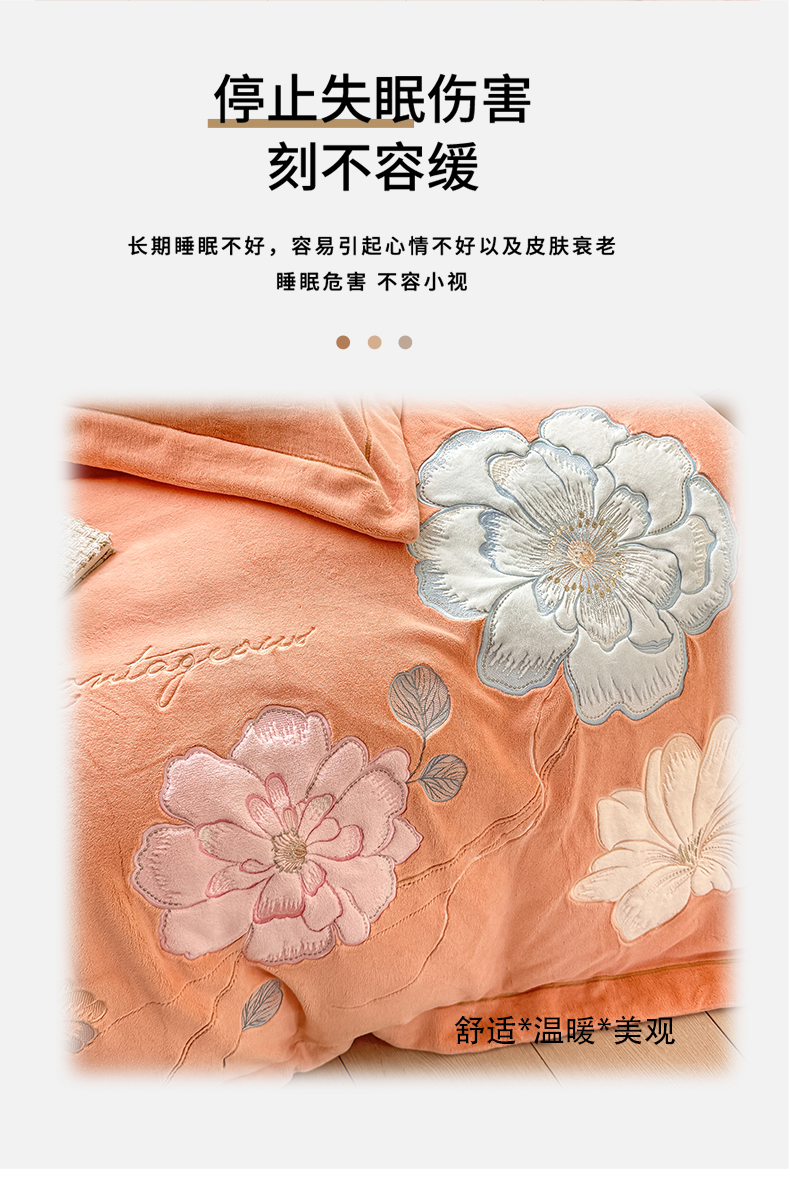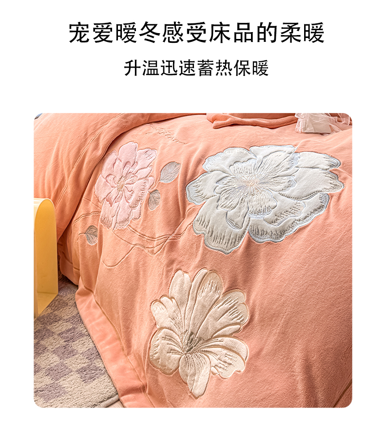 商品名称:悦织湾家纺 2025新款9斤重牛奶绒四件套纯色贴布绣人件富贵系列240克重高密保暖轻奢时尚床上用品4件套 黛西-暖玉