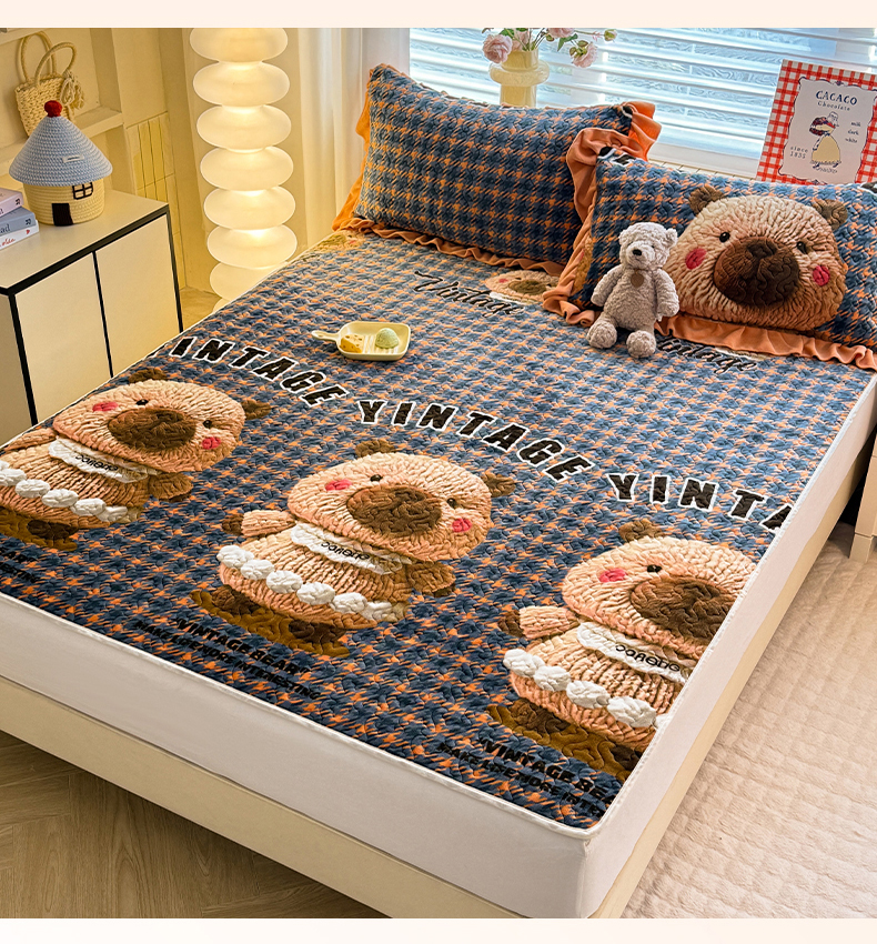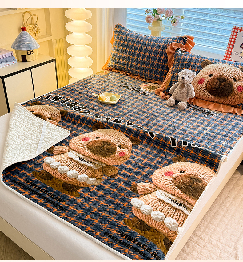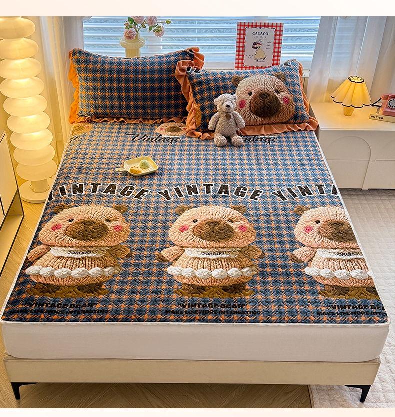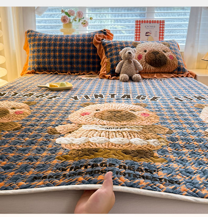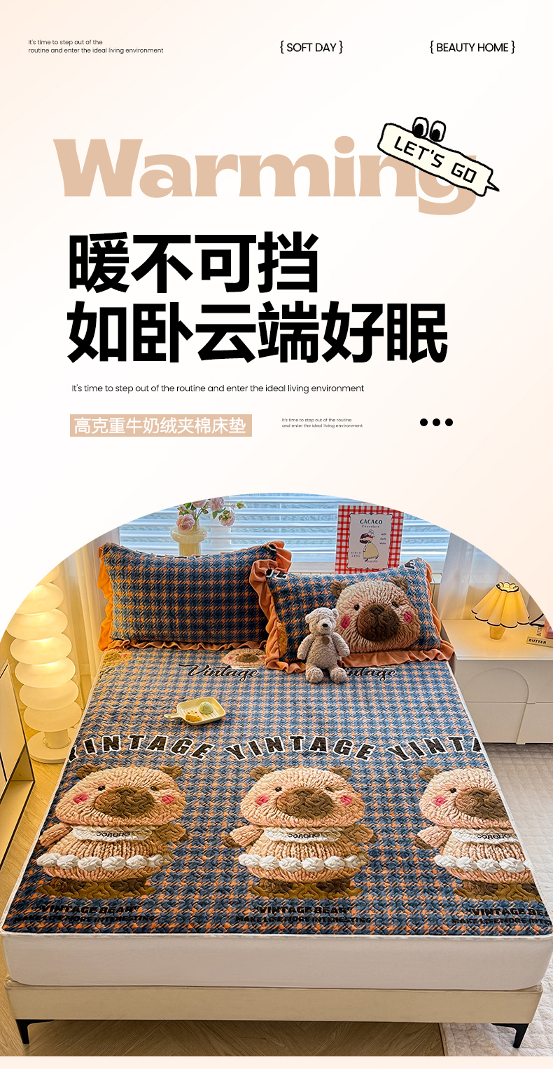 美达家纺 2025新款高克重牛奶绒夹棉床垫 格子萌熊