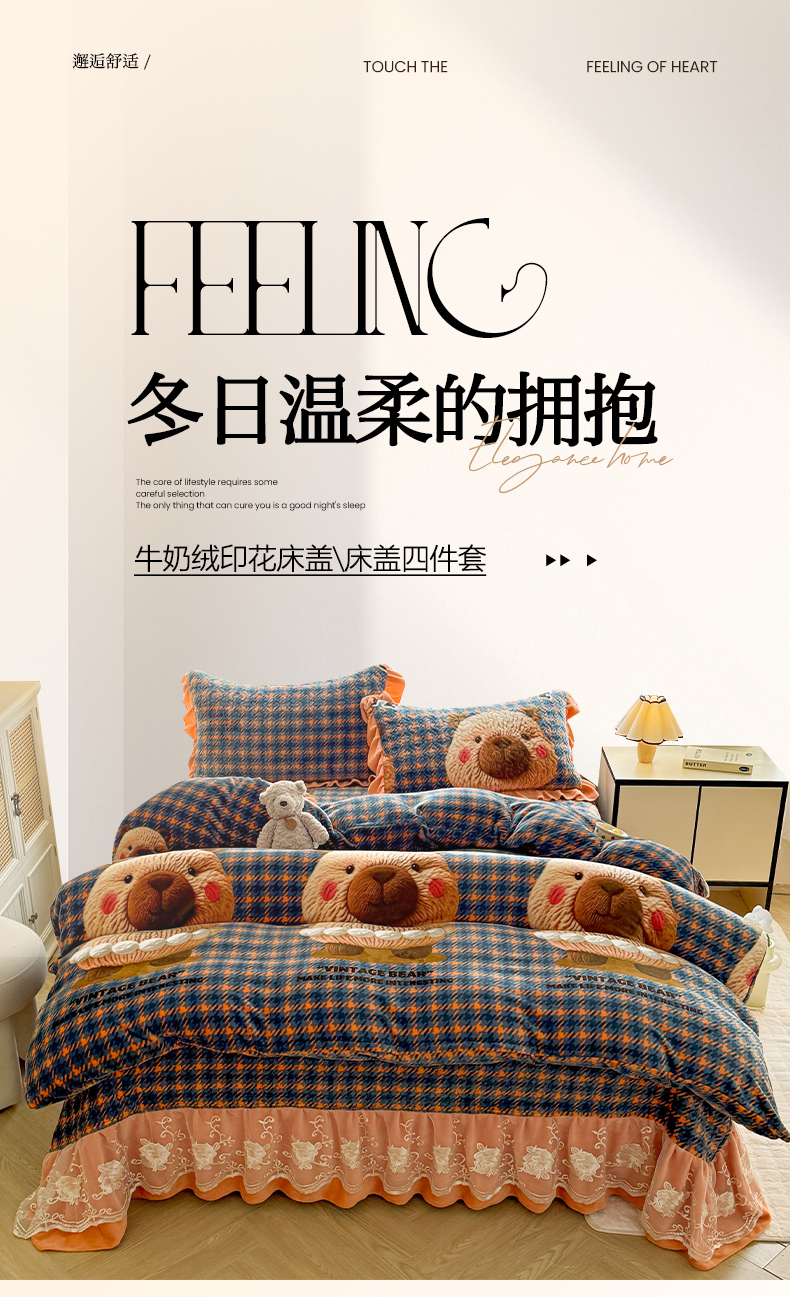 (总)美达家纺 2025新款卡通牛奶绒印花床盖四件套,巴拉巴拉,格子萌熊,恐龙星球,梦蝶,时来运转,甜蜜奶吧,微笑熊,针织熊