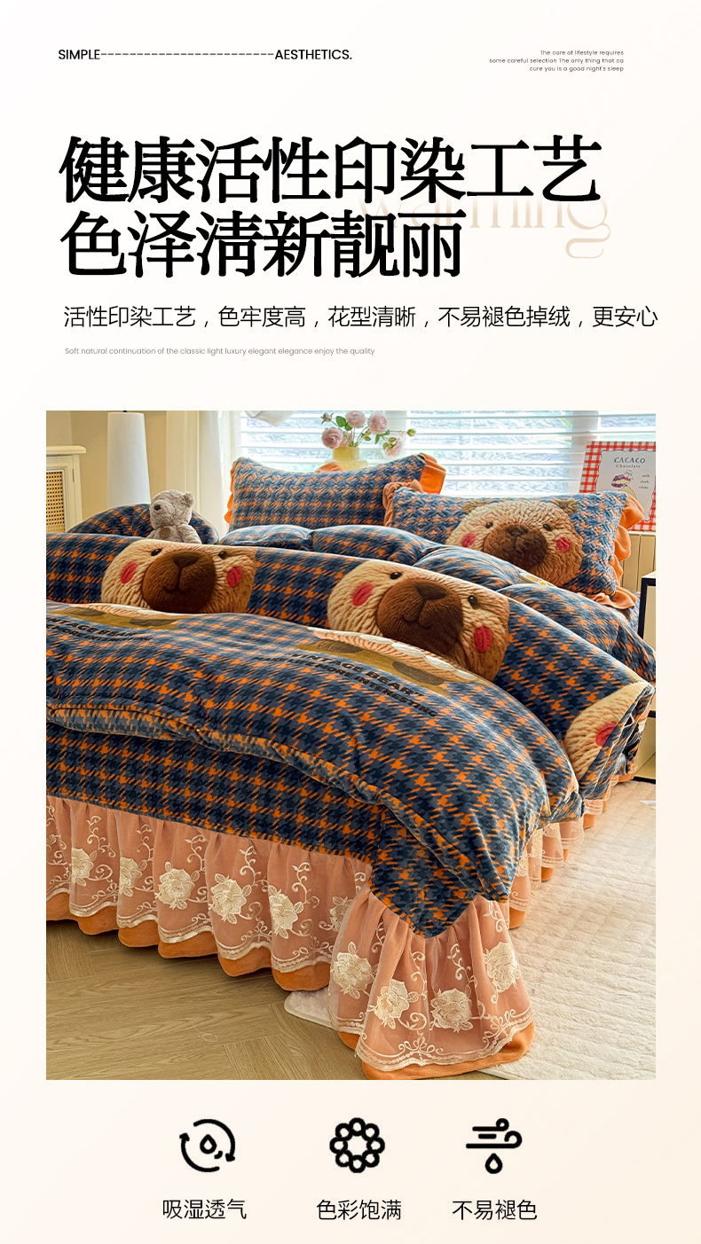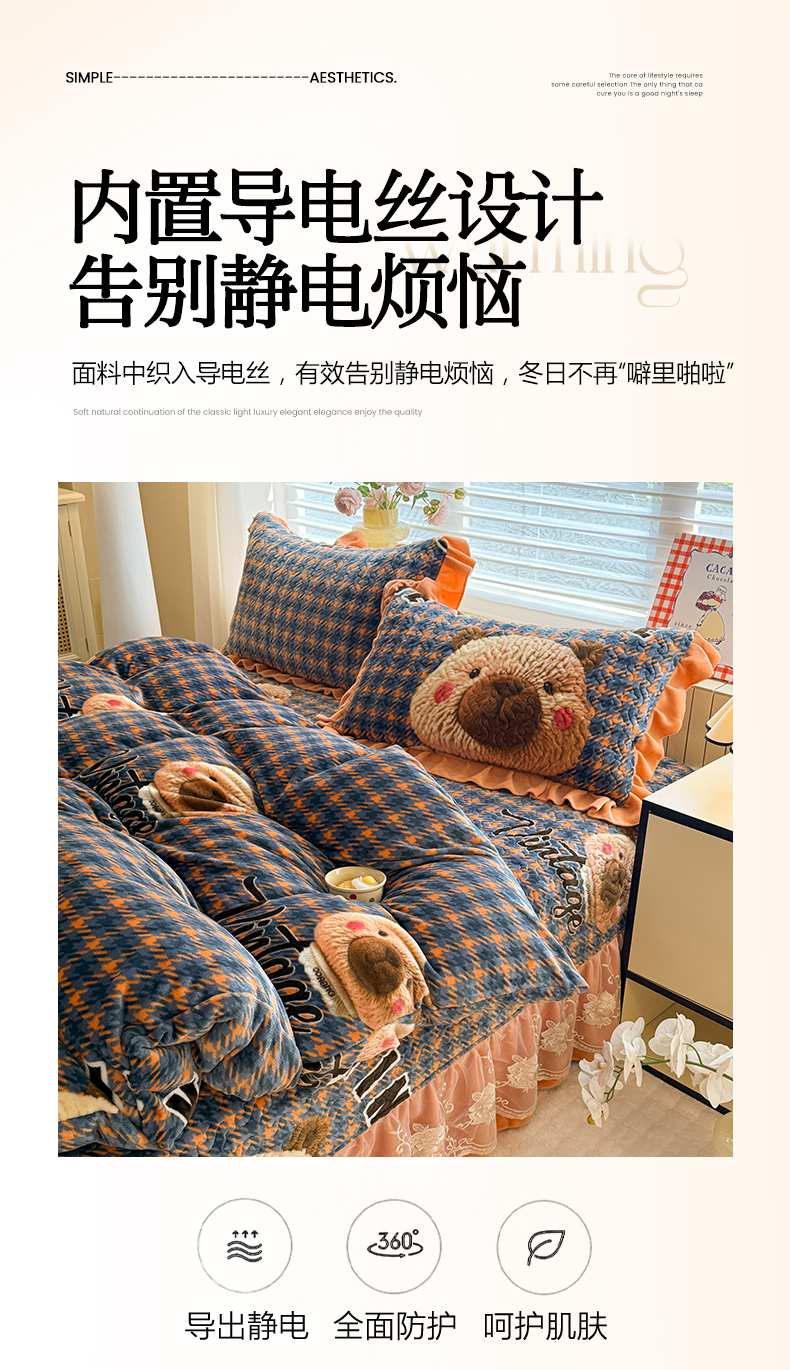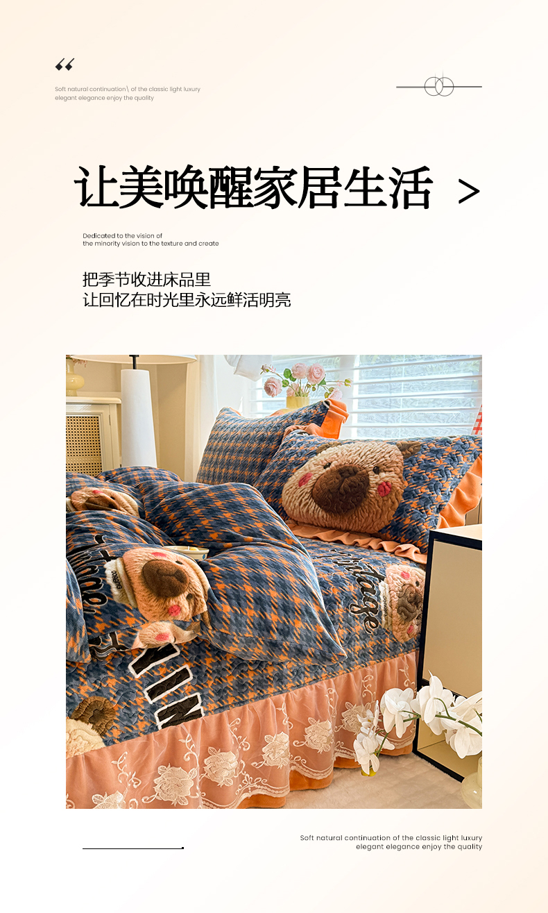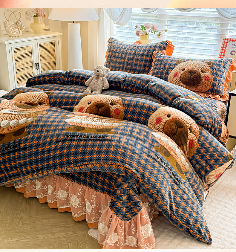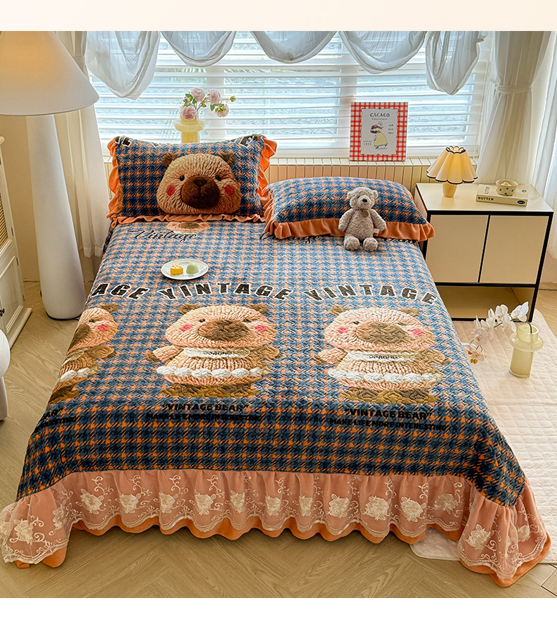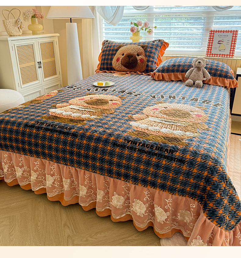 商品名称:美达家纺 2025新款卡通牛奶绒印花床盖四件套 格子萌熊