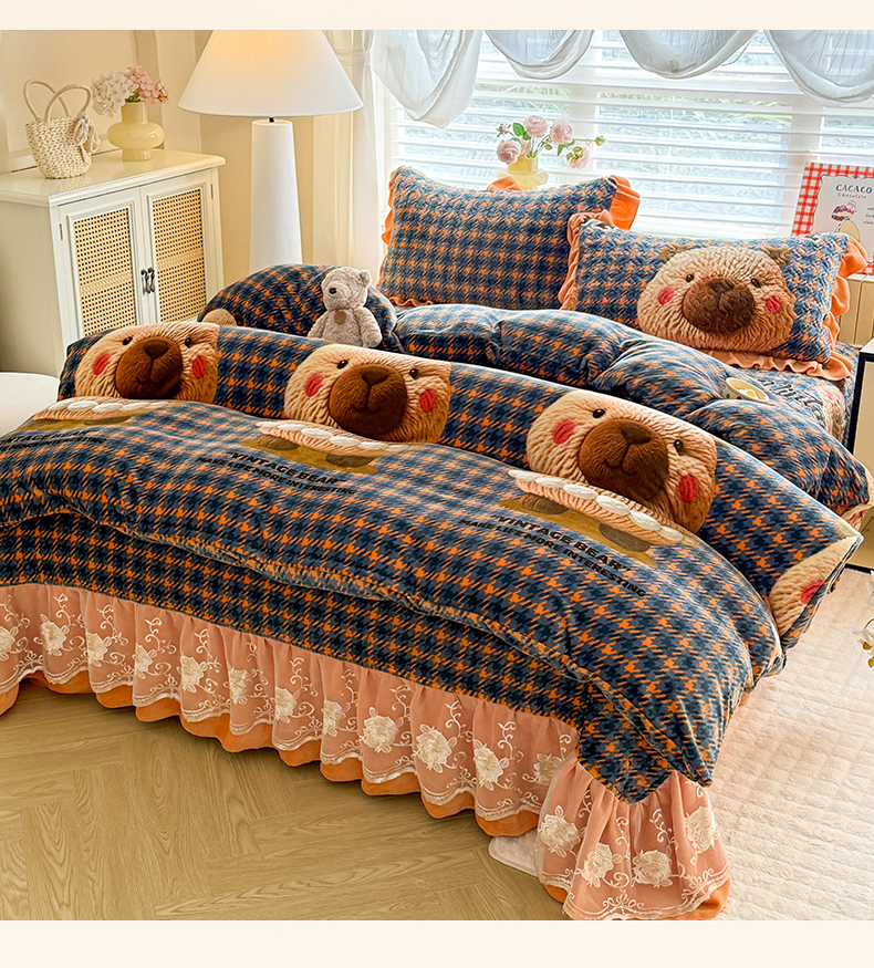 美达家纺 2025新款卡通牛奶绒印花床盖四件套 格子萌熊