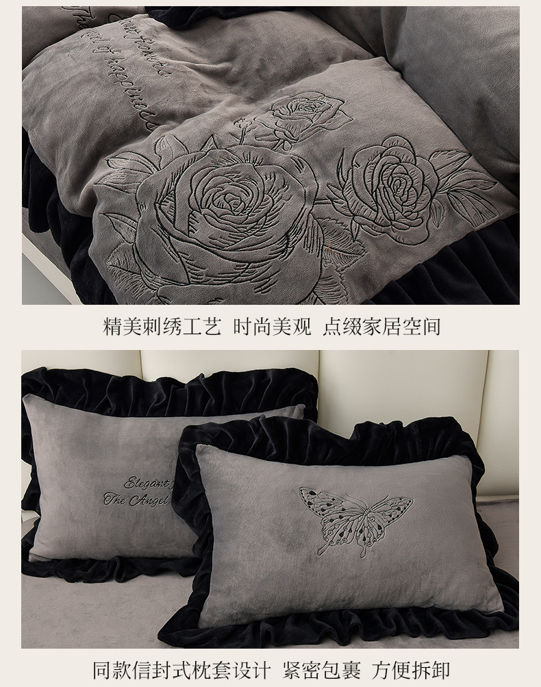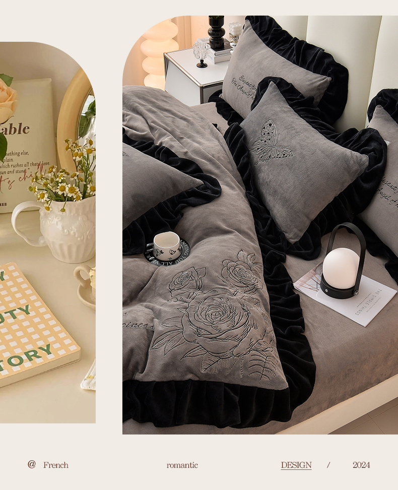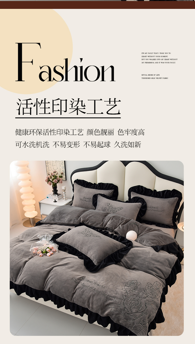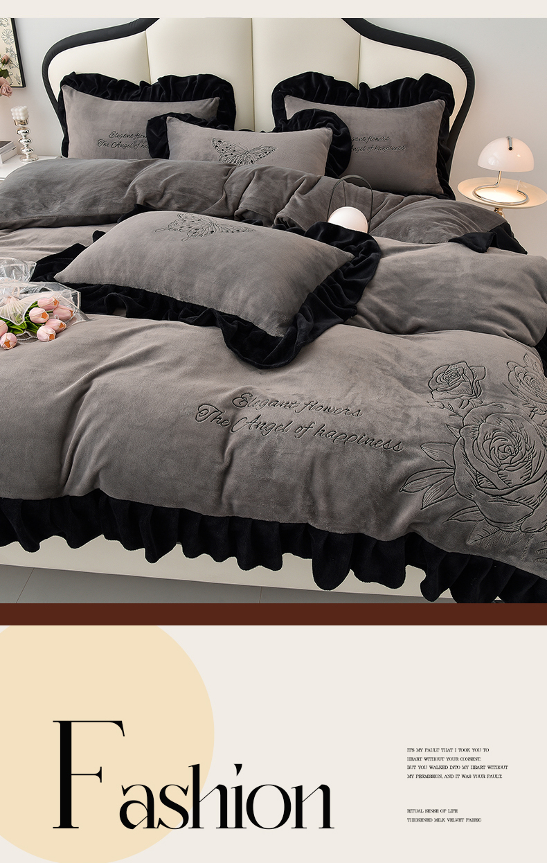 炫拼家纺 2025新款刺绣黑花边高克重牛奶绒四件套-法式玫瑰 法式玫瑰-绅士灰
