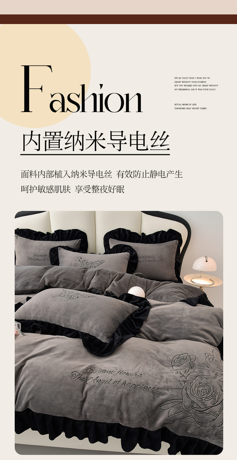 商品名称:炫拼家纺 2025新款刺绣黑花边高克重牛奶绒四件套-法式玫瑰 法式玫瑰-绅士灰