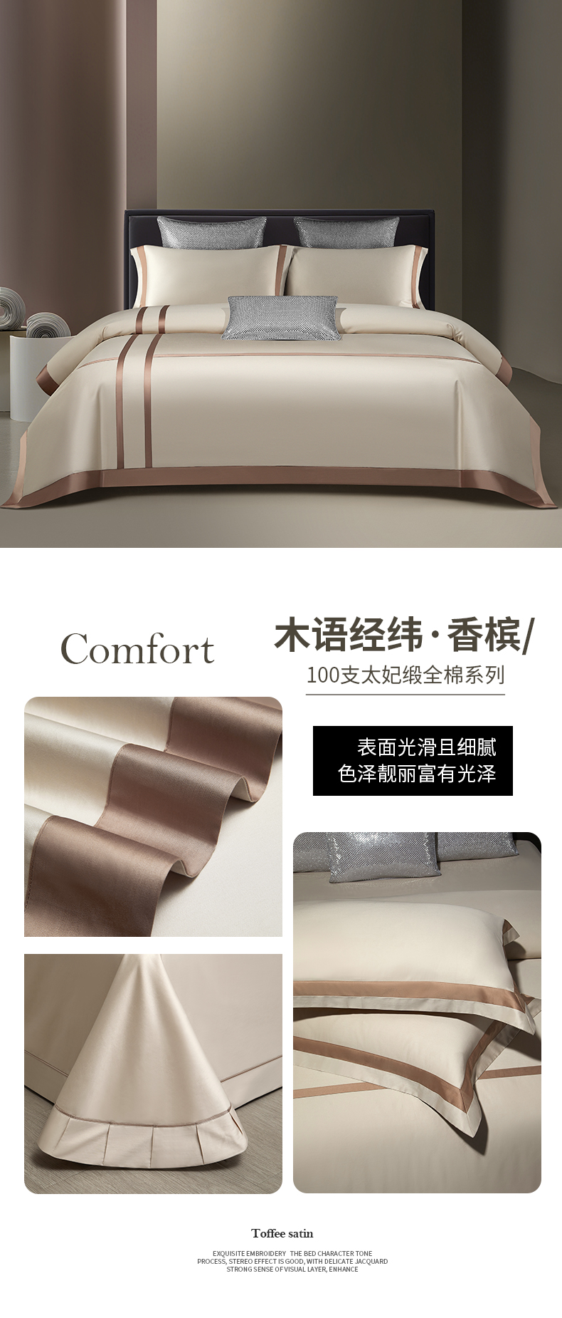 100支100S全棉太妃缎纯色拼色四件套可选多件套可定制长绒棉直播爆款 木语经纬灰