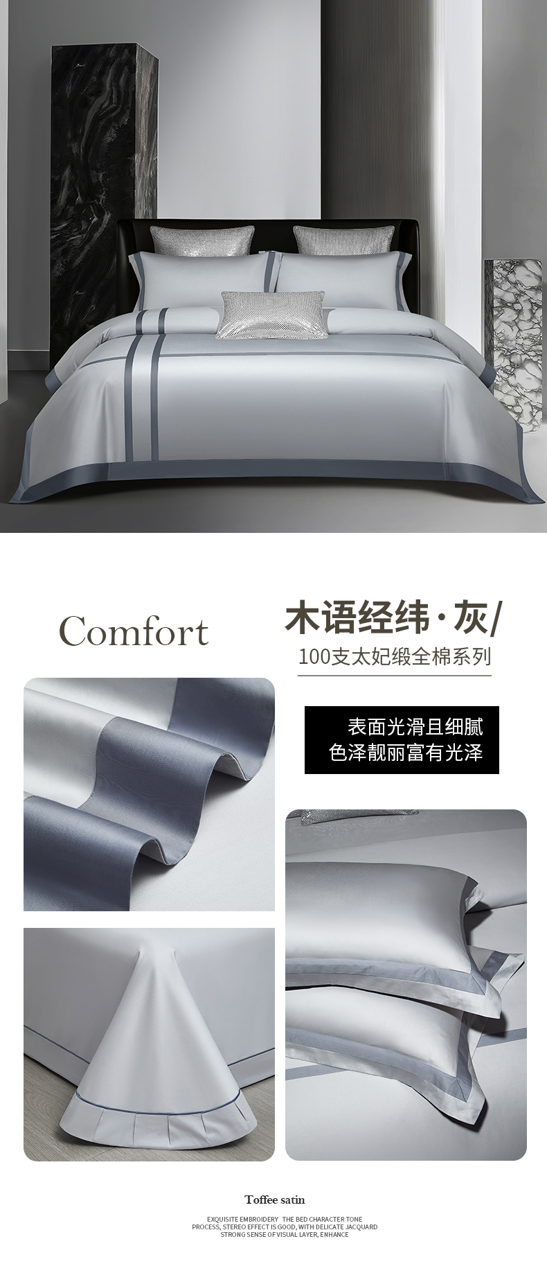 商品名称:100支100S全棉太妃缎纯色拼色四件套可选多件套可定制长绒棉直播爆款 木语经纬灰