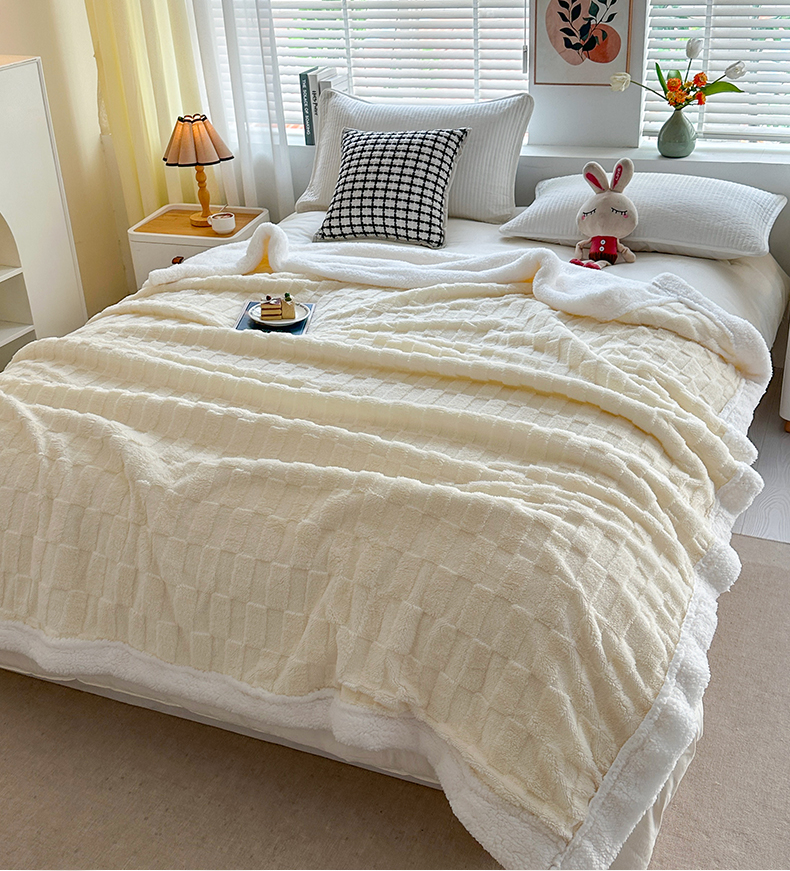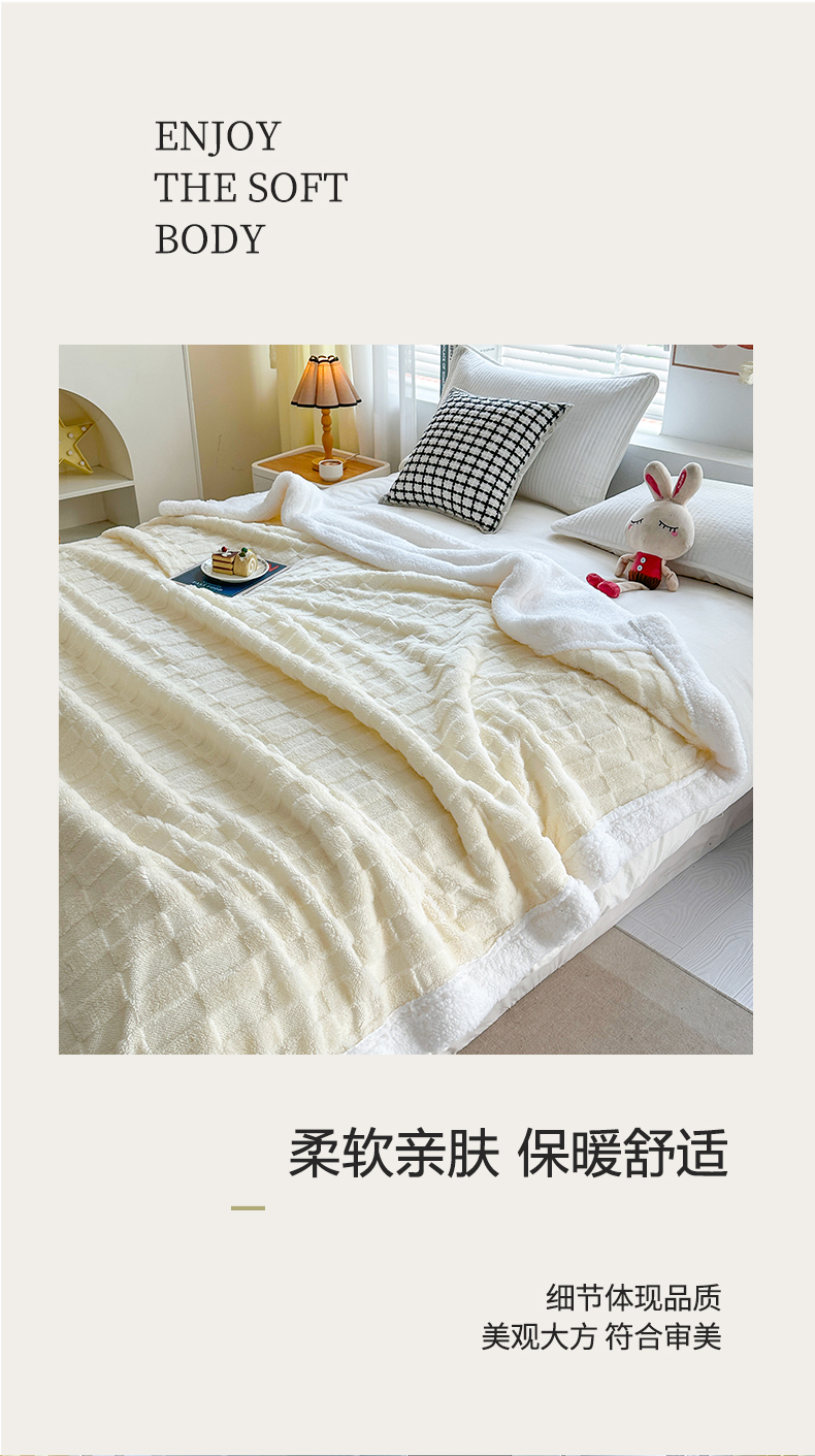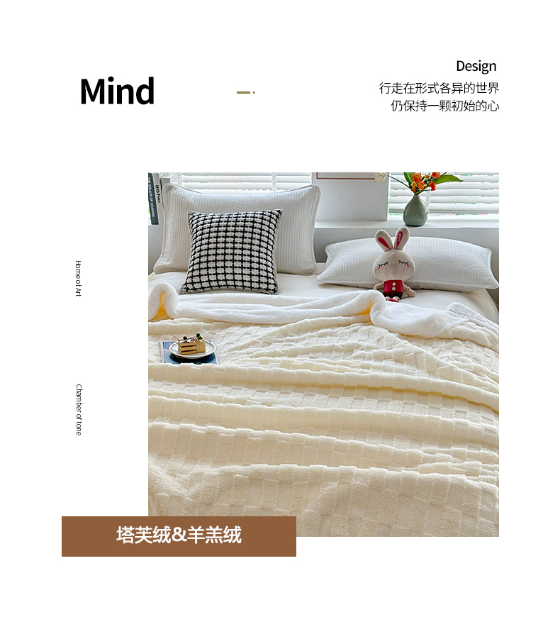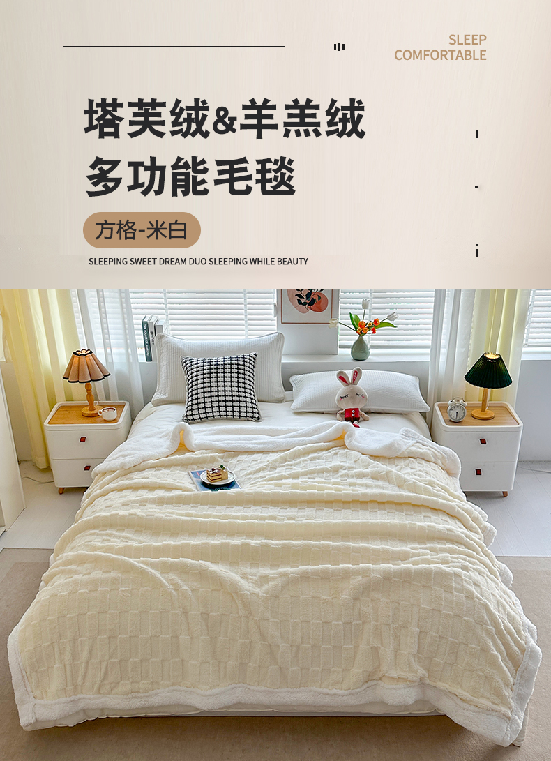 悦织湾家纺 2025新款塔芙绒羊羔绒舒棉绒毛毯方格系列 方格米白
