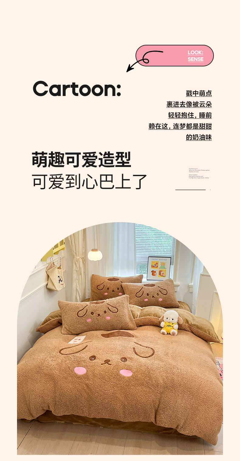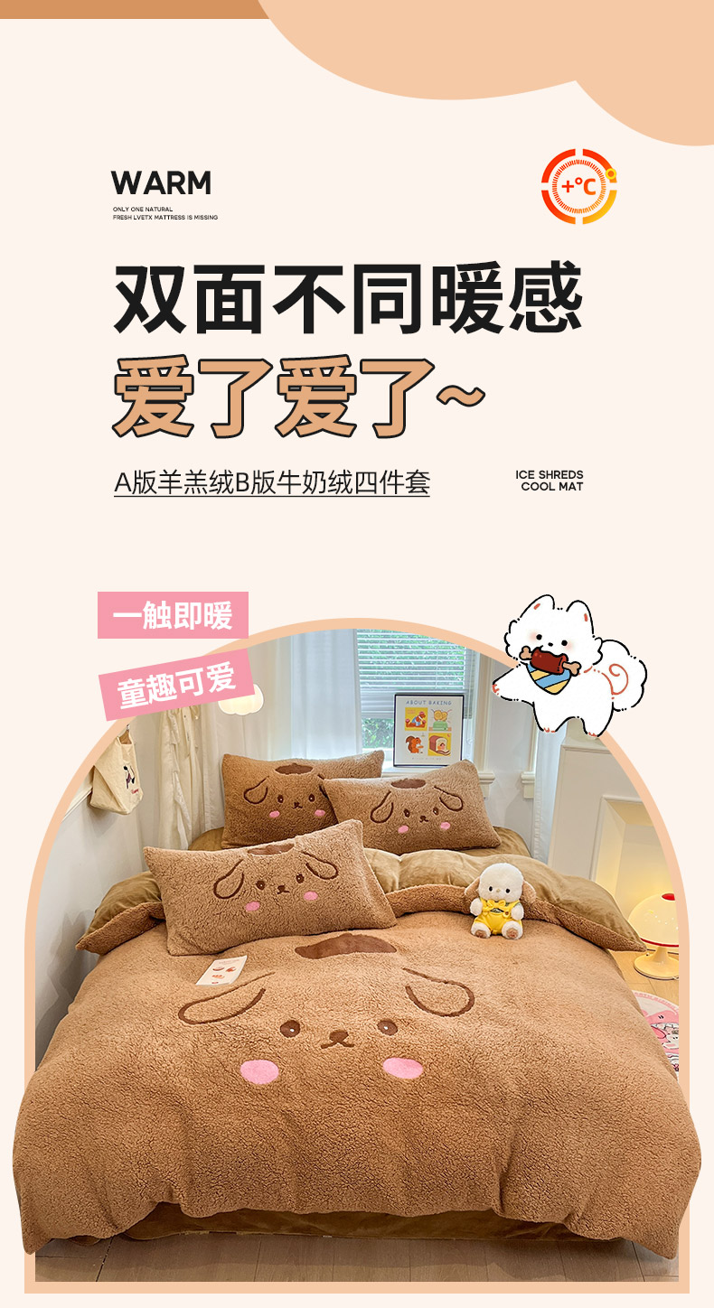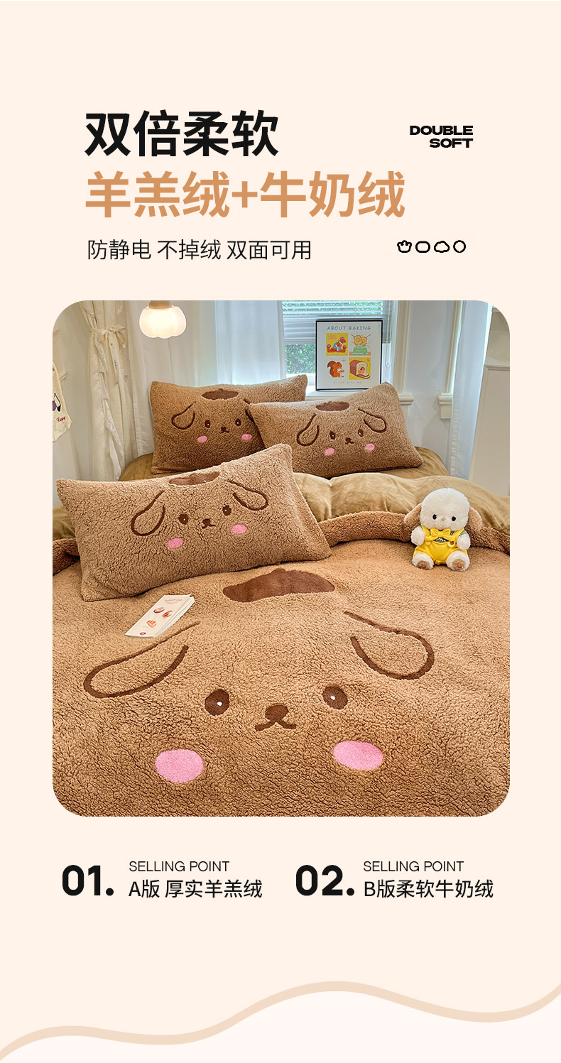 商品名称:梓之赫 2025新款大版羊羔绒牛奶绒卡通四件套冬季加厚保暖 晚安狗-咖