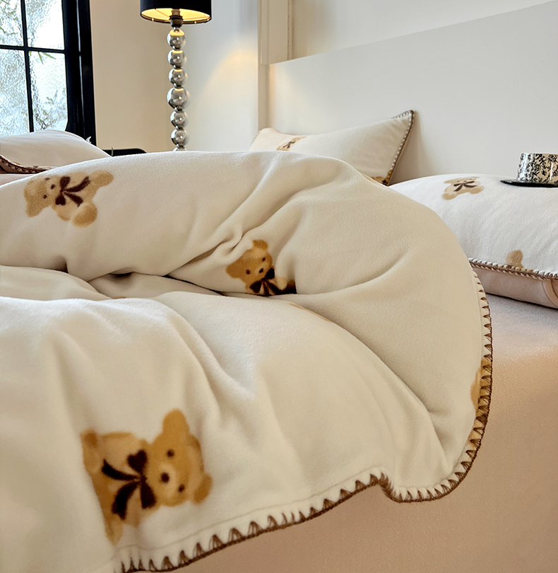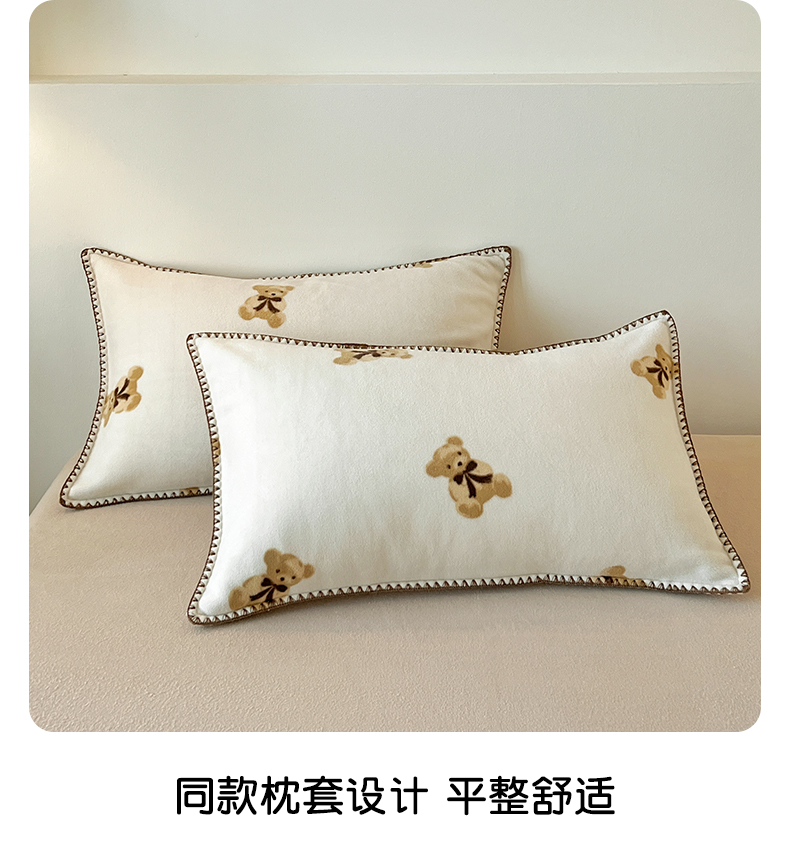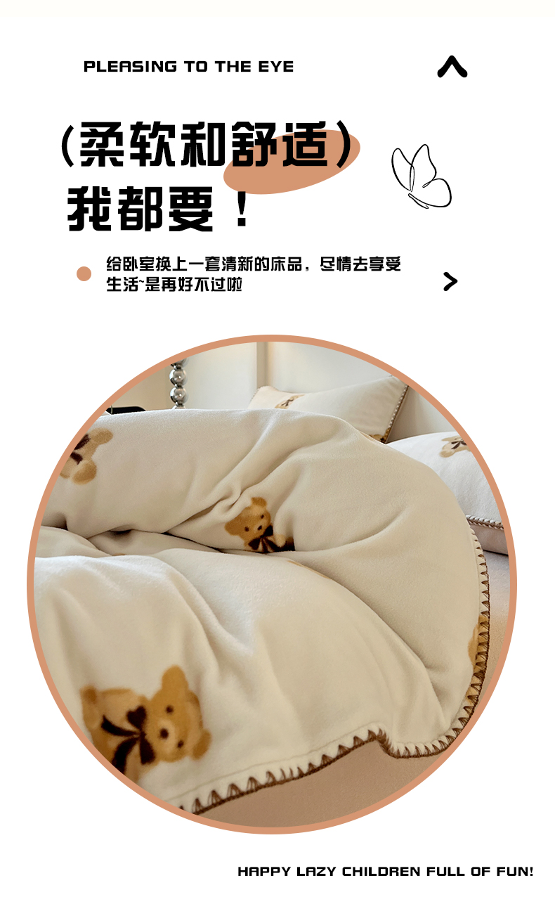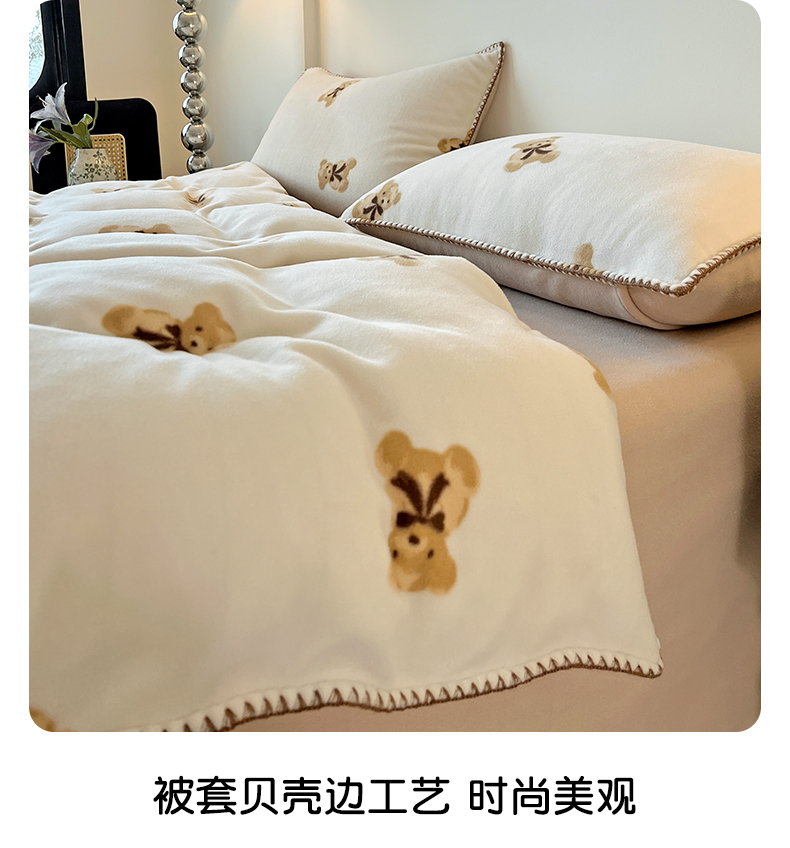 商品名称:品乐家纺 2025秋冬新款糯米绒缇肤绒印花贝壳边四件套 开心熊-米