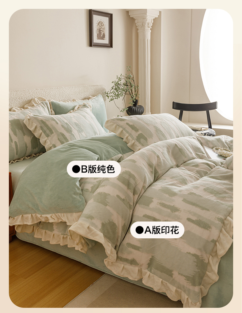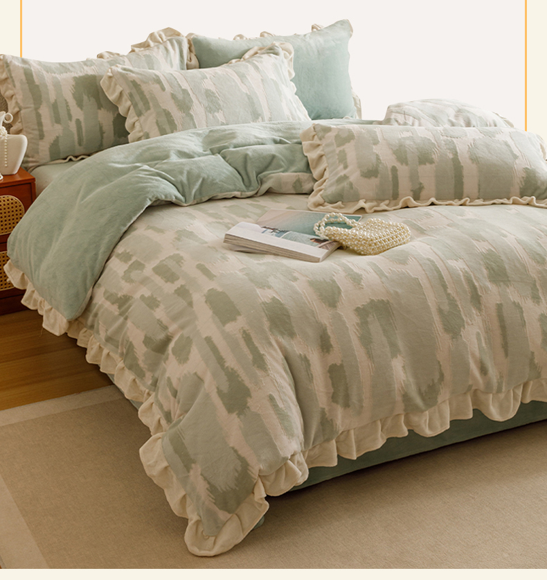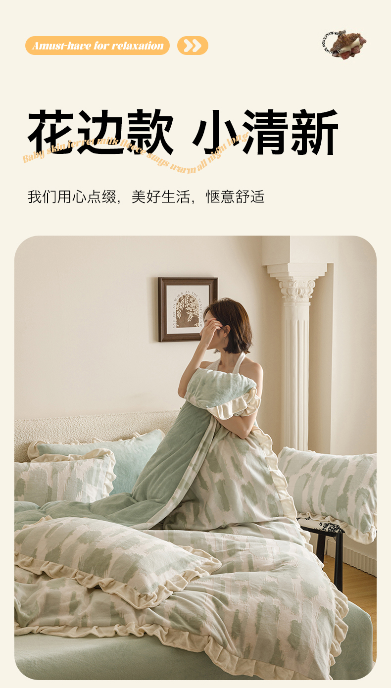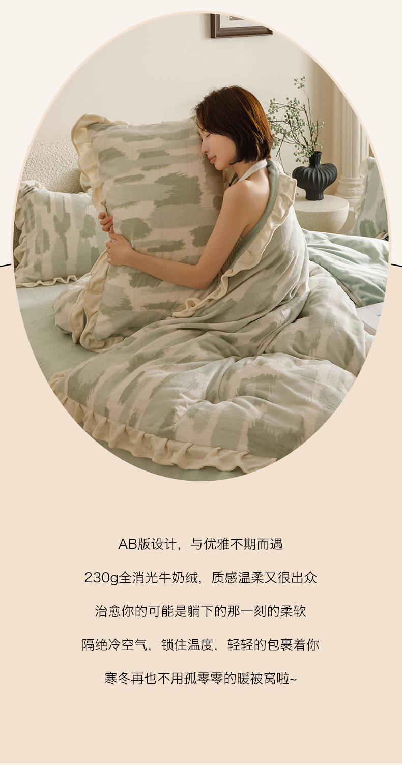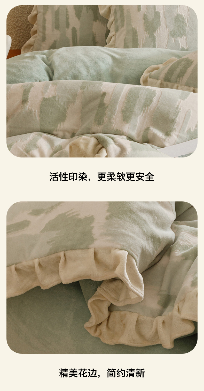 当前位置: 91家纺网 > 商品网购 > 床品套件 > 四件套 > 牛奶绒四件套 > 恬思语家纺 2025新款亲肤舒适韩风小清新花边牛奶绒四件套 奇想-绿