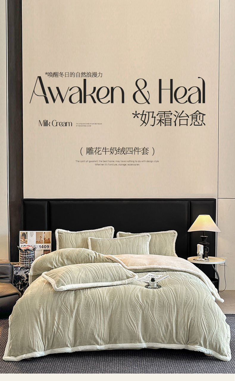 (总)涵宸家纺 2025新款雕花牛奶绒四件套,蝶舞纷飞-咖,和春-米,绿茵-粉,秋日花语,拾光-绿,怡然居- 绿,雨蝶-灰,雨蝶-卡其