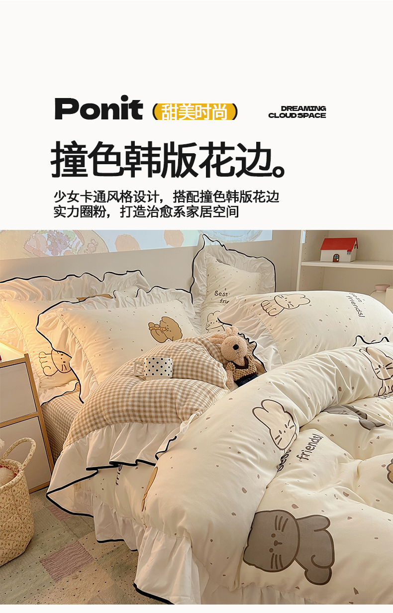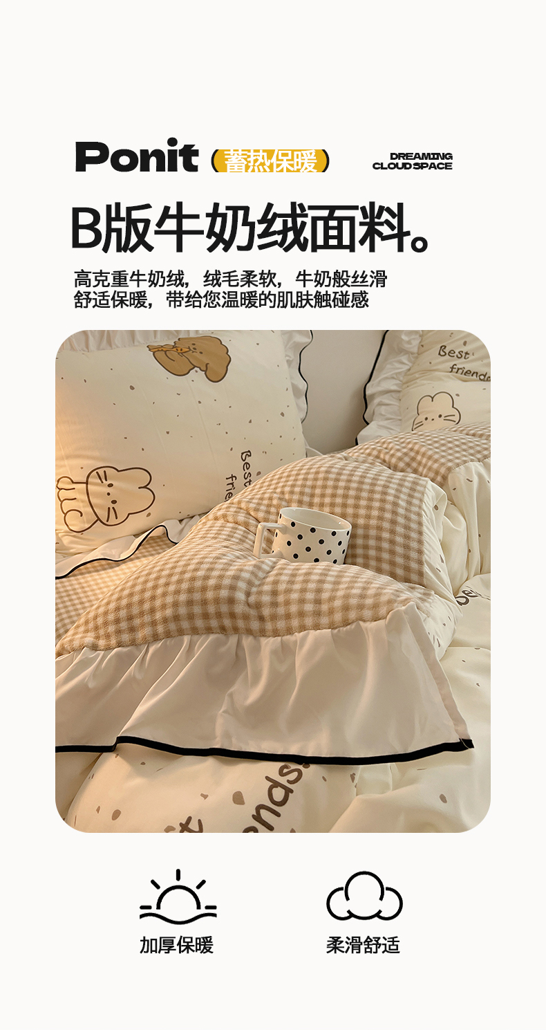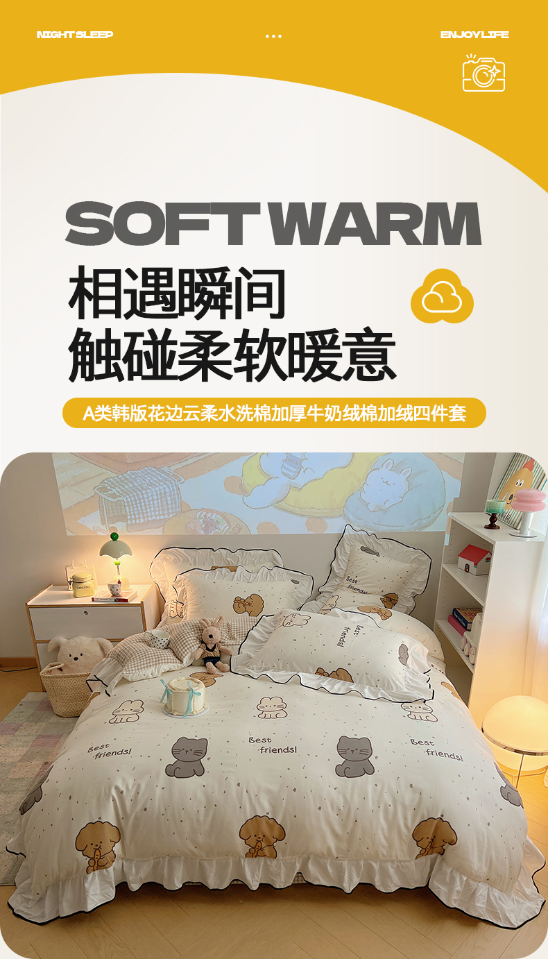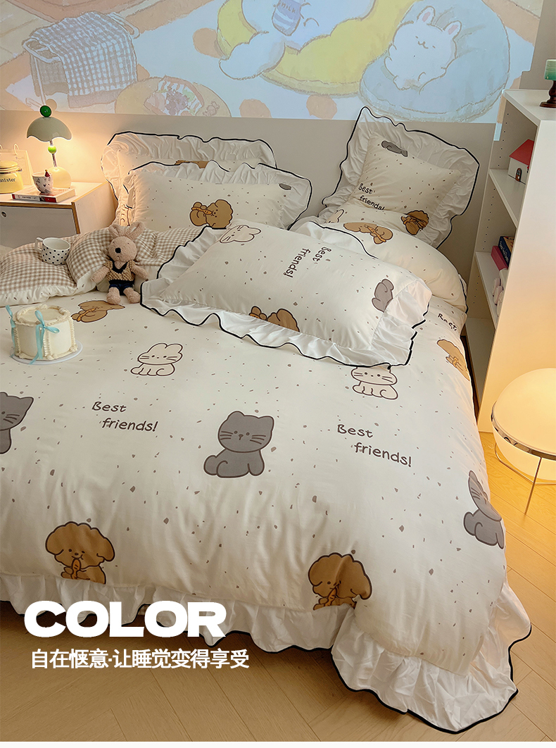 当前位置: 91家纺网 > 商品网购 > 床品套件 > 四件套 > 牛奶绒四件套 > 桃心家居 2025新款A类韩版花边撞色云柔水洗棉加厚牛奶绒少女猫咪棉绒四件套系列 绒花边-快乐时光