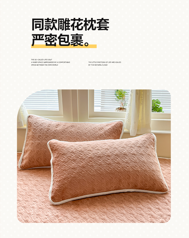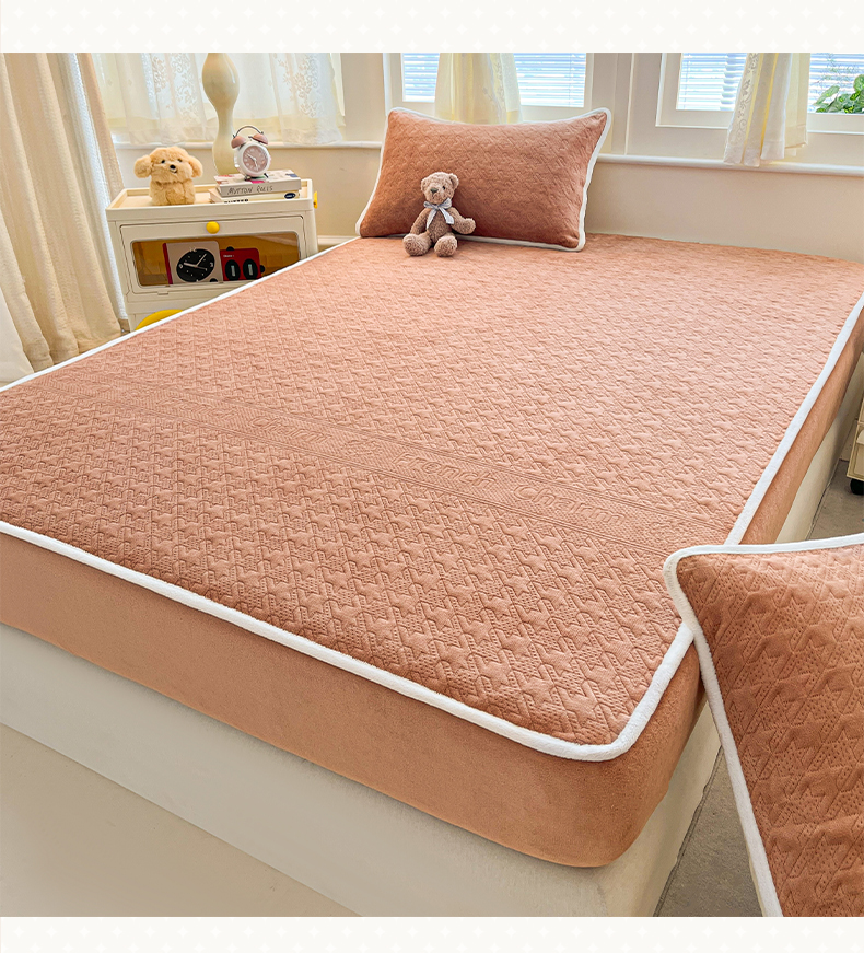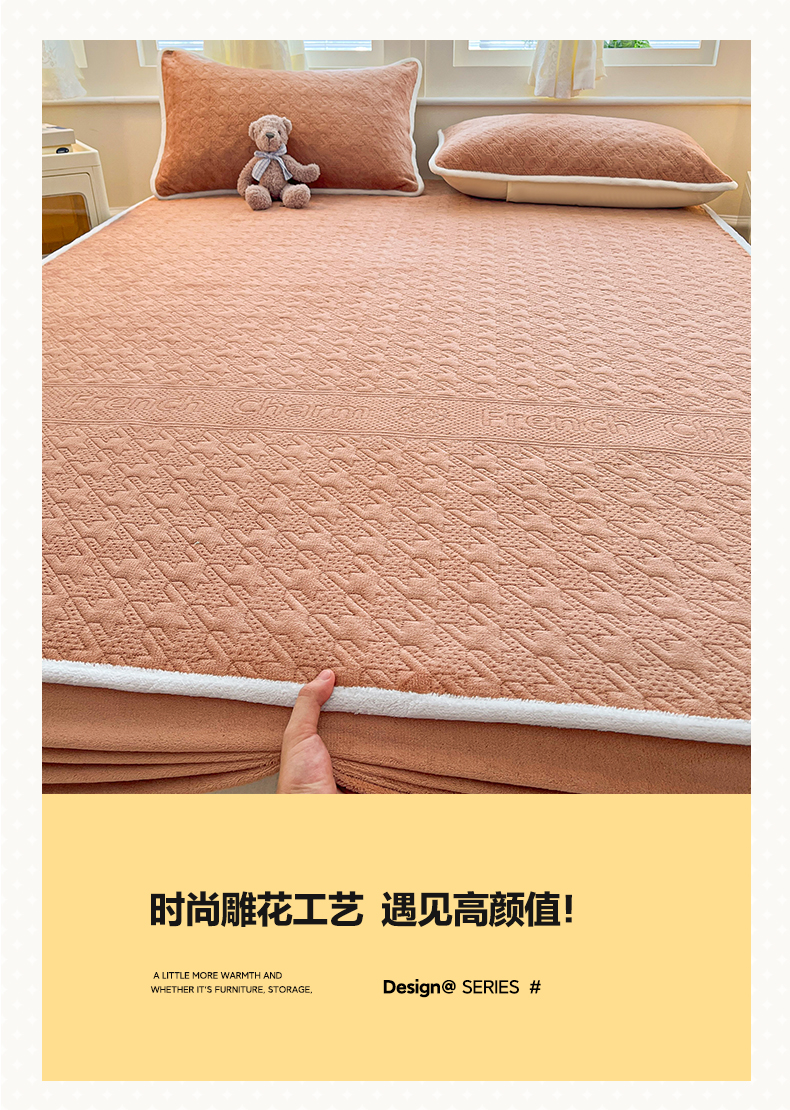 • 91家纺网 家纺一手货源 找家纺 卡伦家纺 2025新款抗菌雕花牛奶绒千鸟格夹棉床笠系列 千鸟格床笠-暖橙