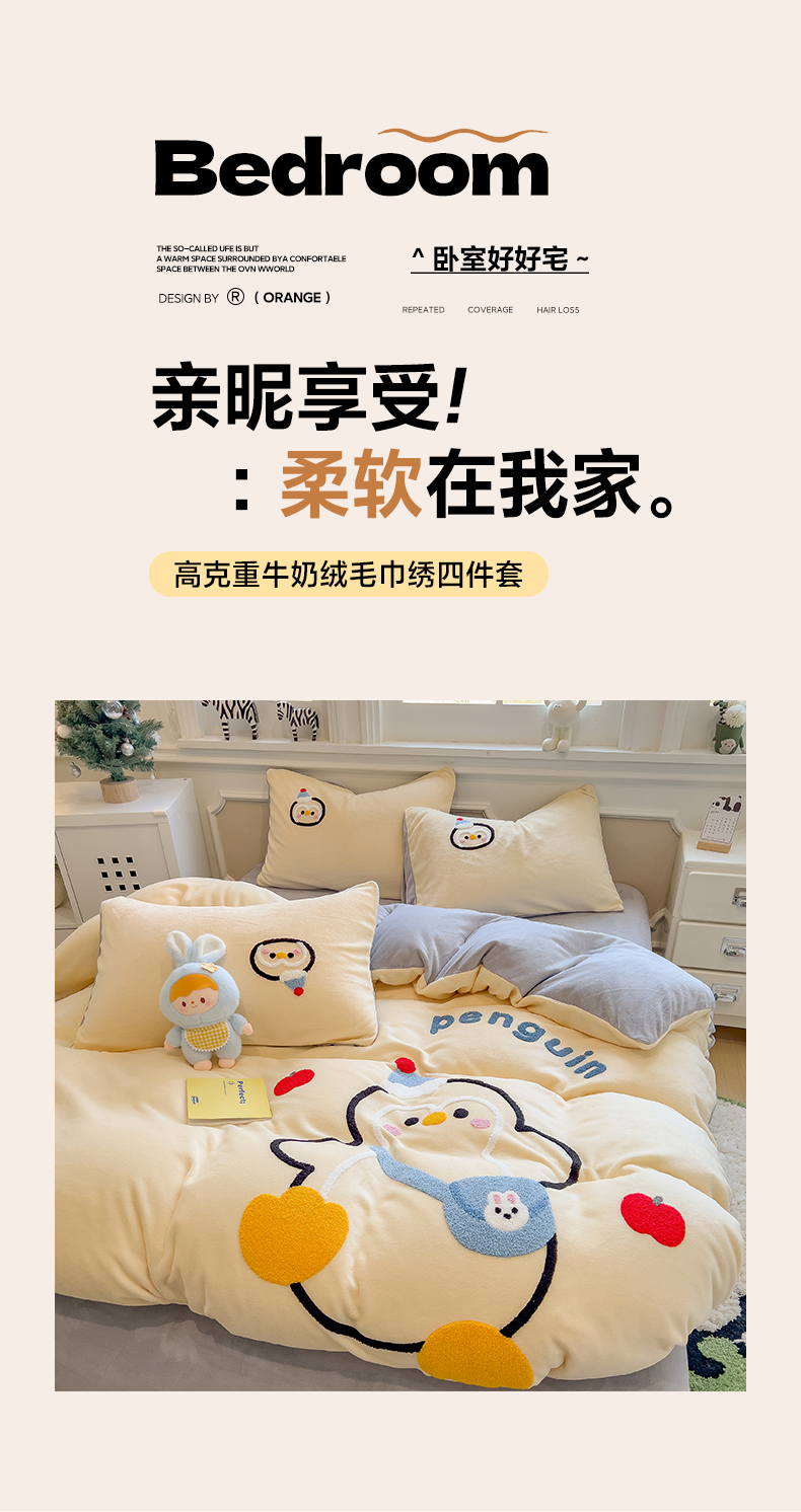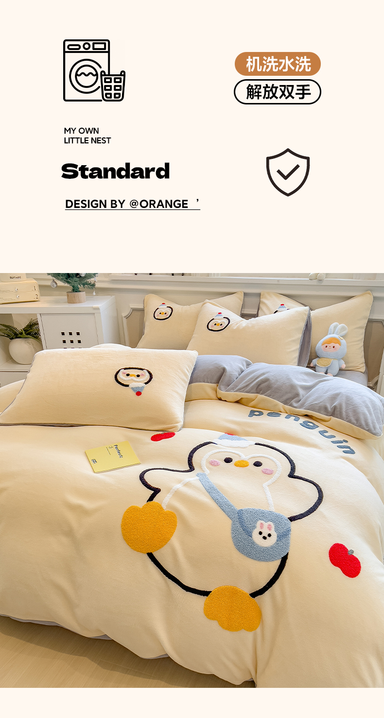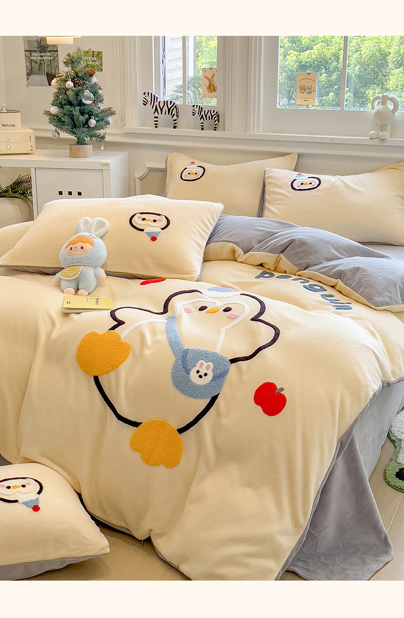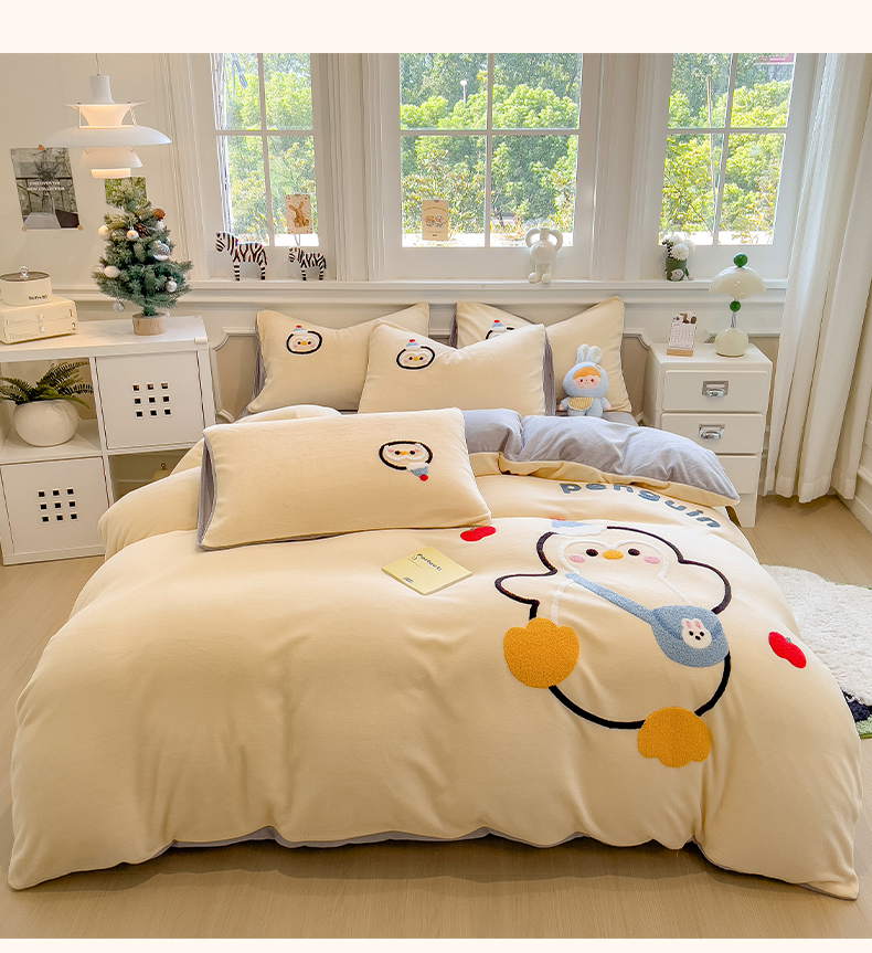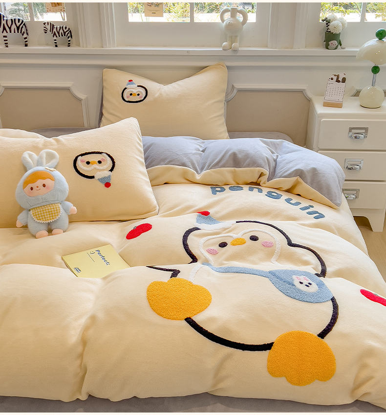 当前位置: 91家纺网 > 商品网购 > 床品套件 > 四件套 > 牛奶绒四件套 > 悦织语 2025新款加厚200克高克重毛巾绣牛奶绒四件套 快乐企鹅-奶黄