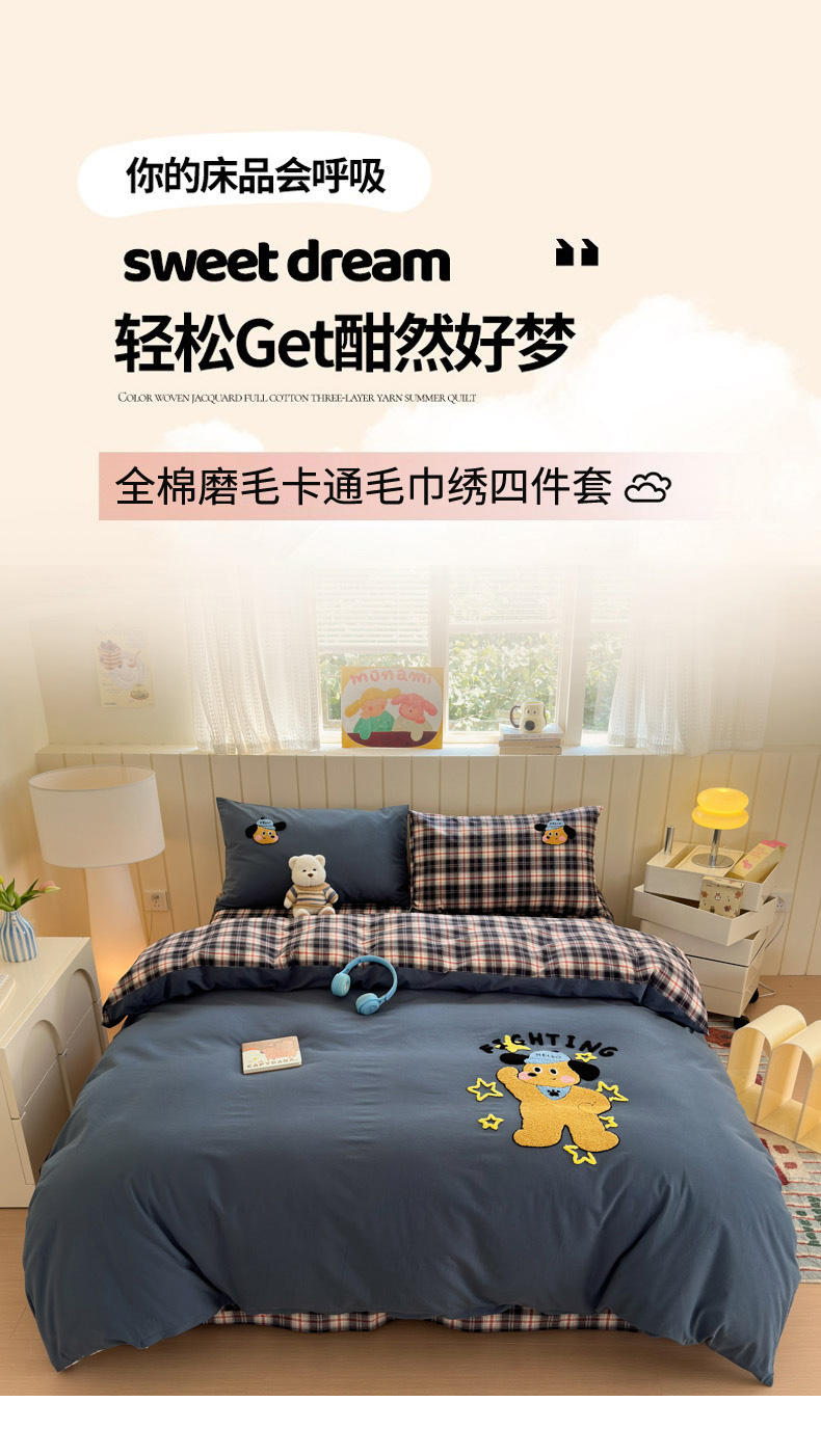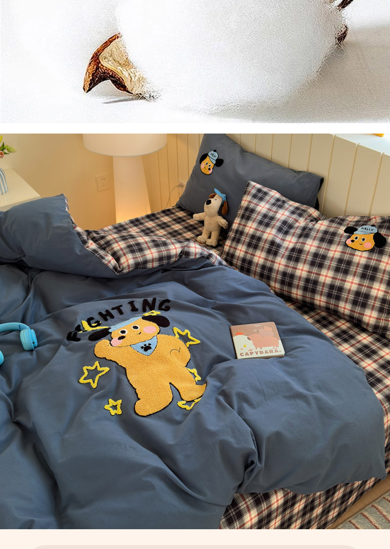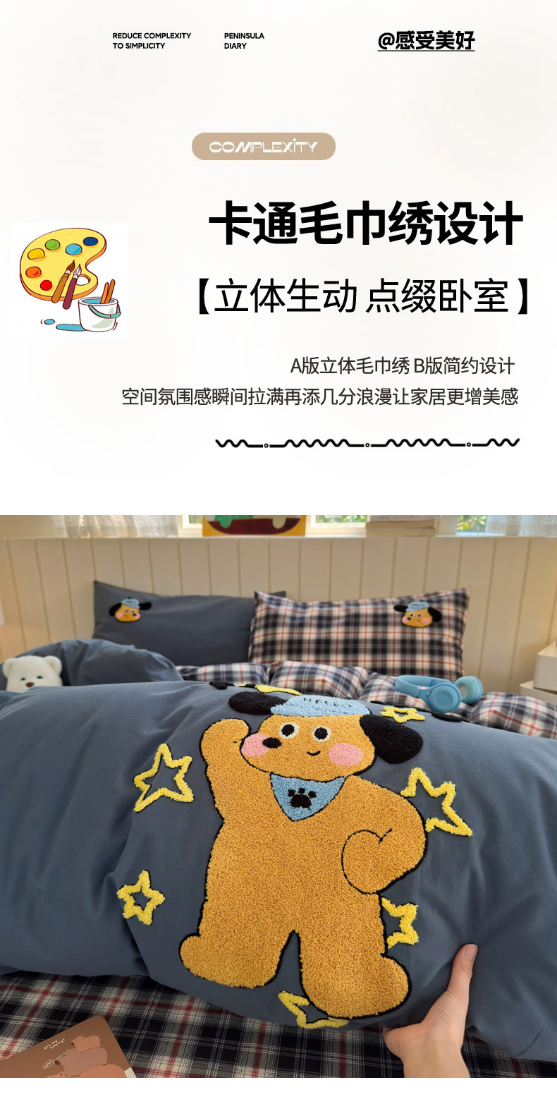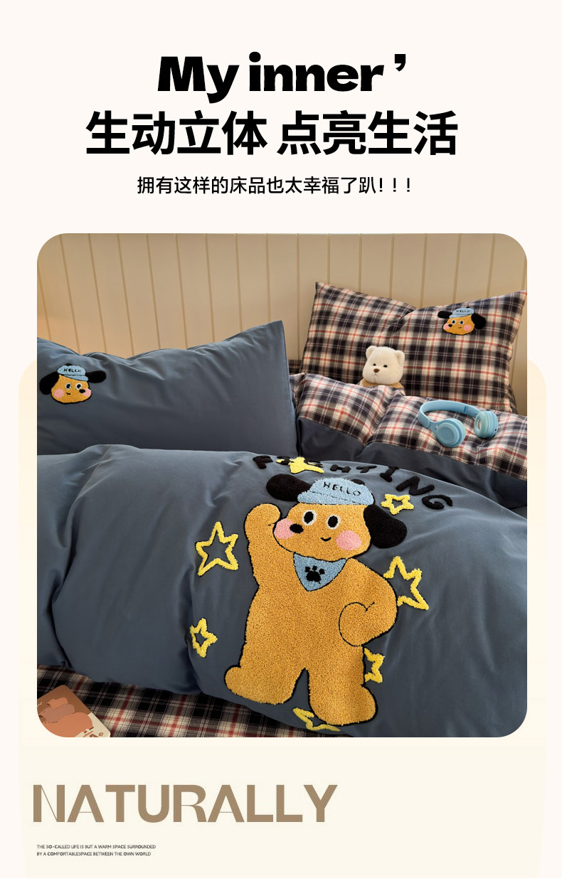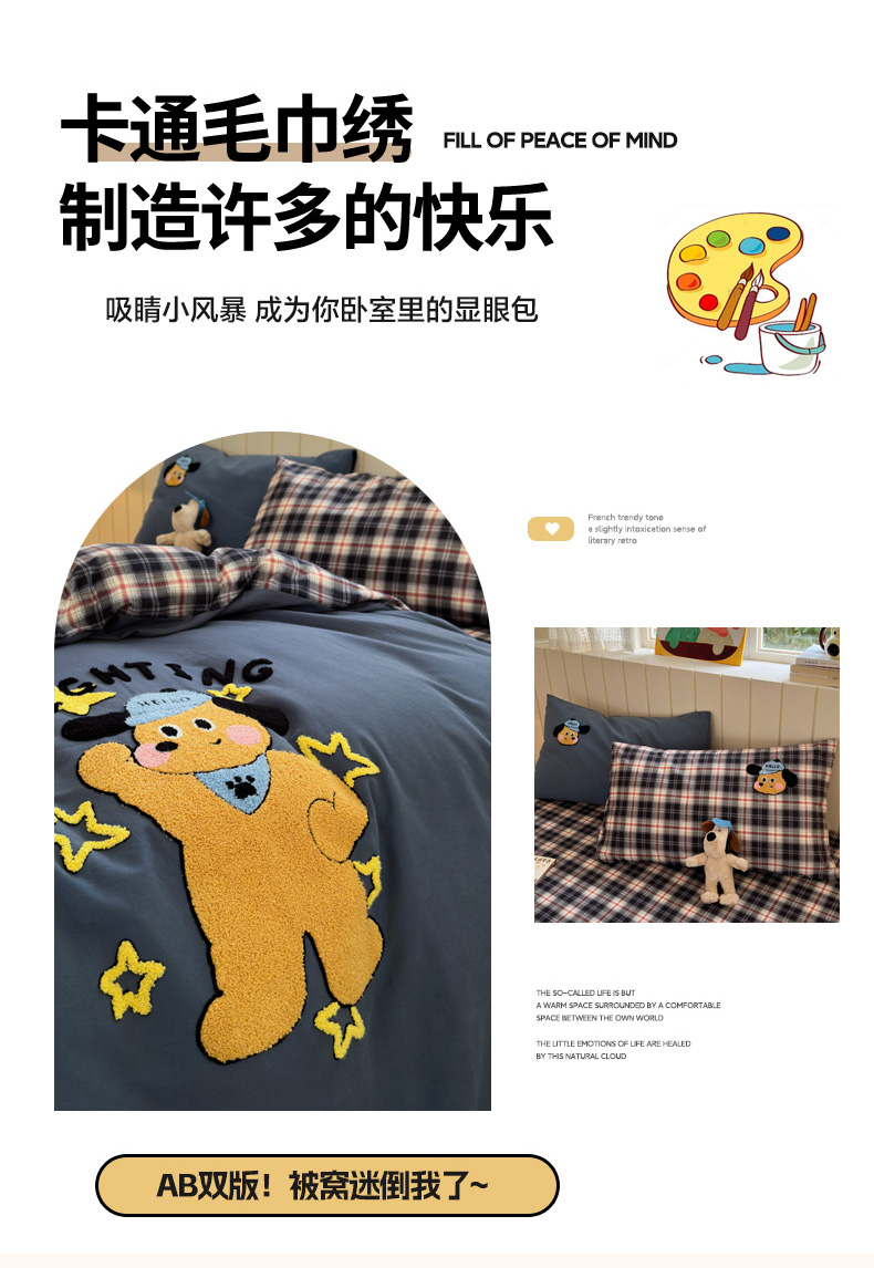 当前位置: 91家纺网 > 商品网购 > 床品套件 > 四件套 > 毛巾绣四件套 > 如意朵 2025新款全棉磨毛卡通毛巾绣四件套(专版花型)-场景二 加油小狗