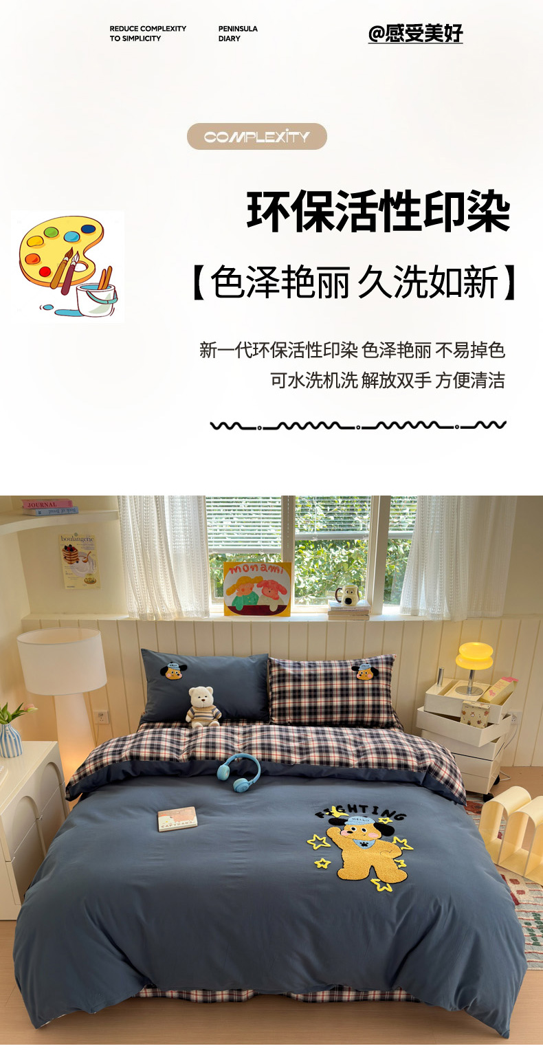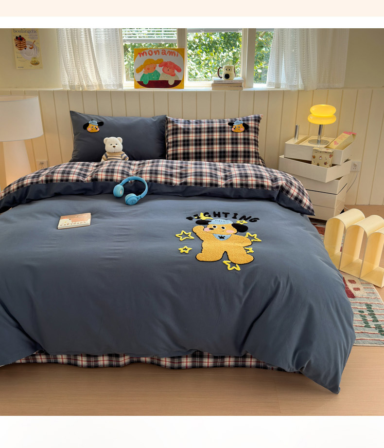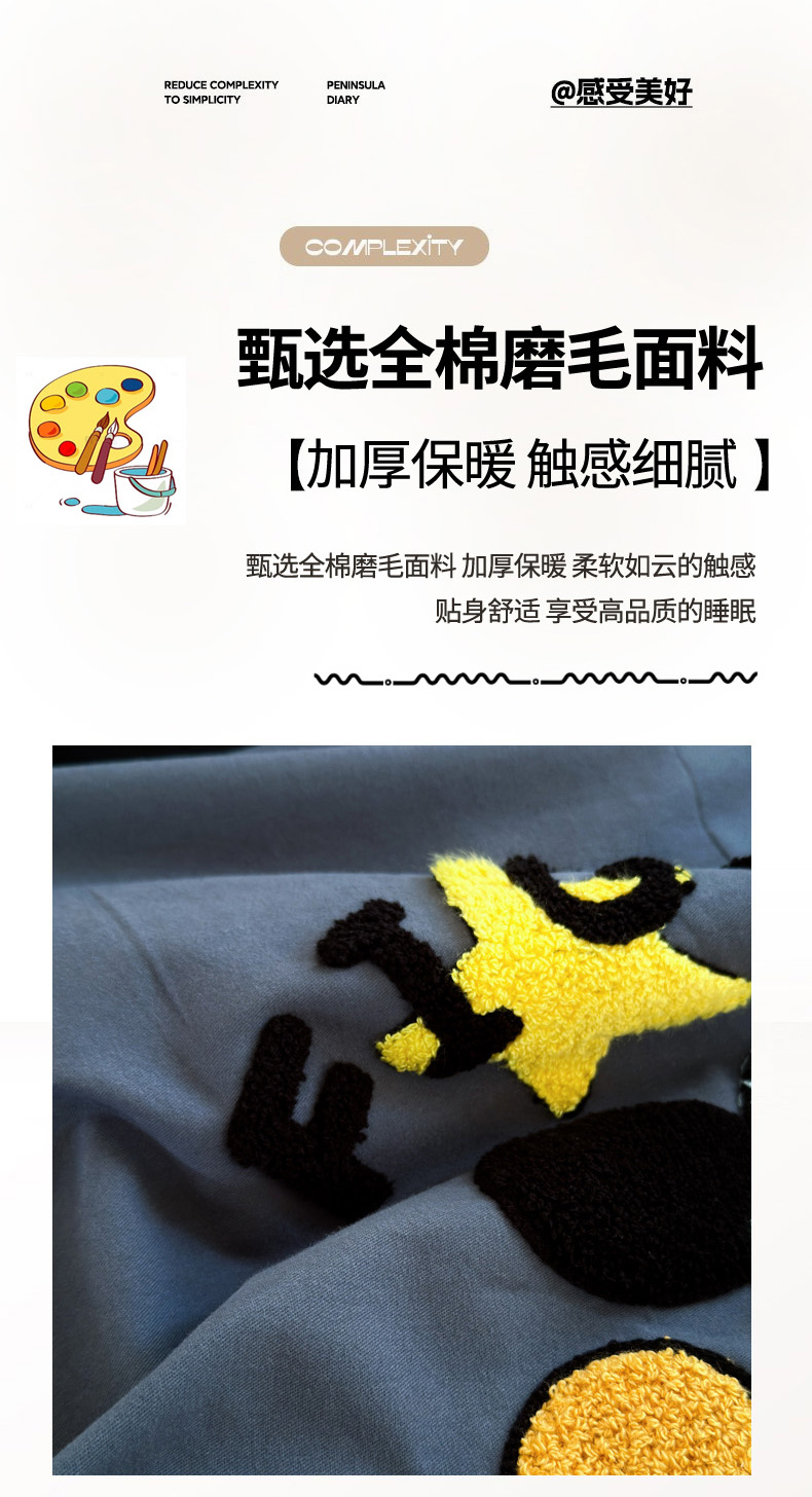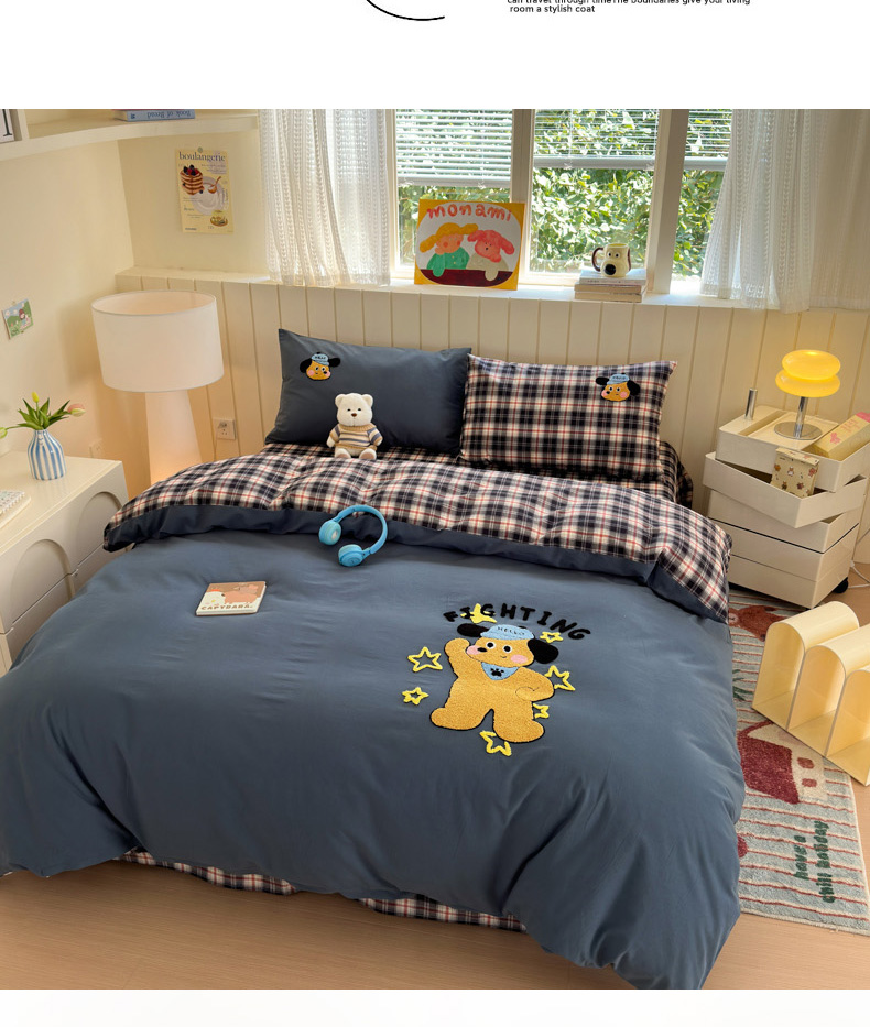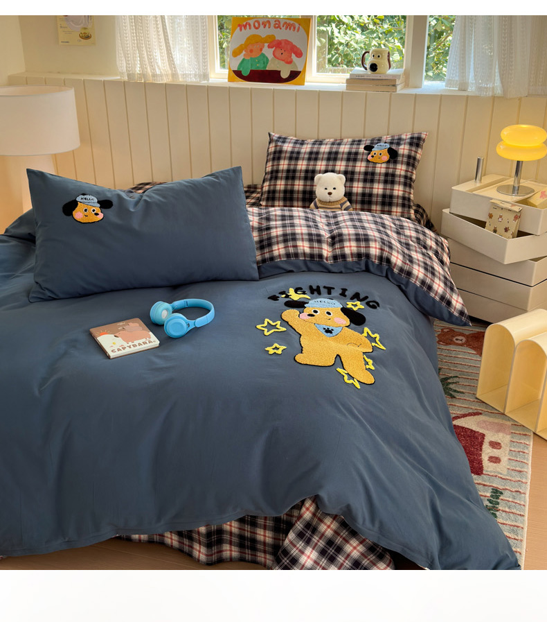 当前位置: 91家纺网 > 商品网购 > 床品套件 > 四件套 > 毛巾绣四件套 > 如意朵 2025新款全棉磨毛卡通毛巾绣四件套(专版花型)-场景二 加油小狗