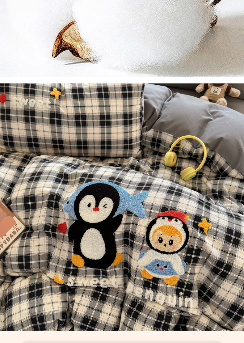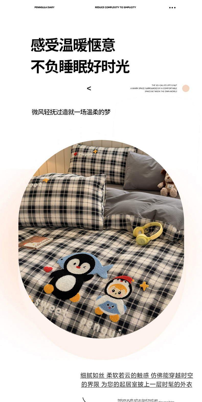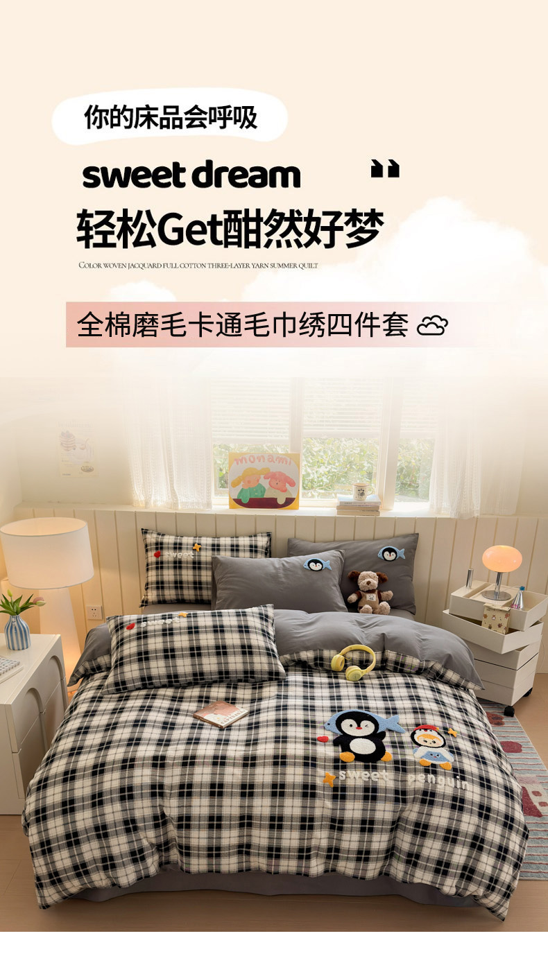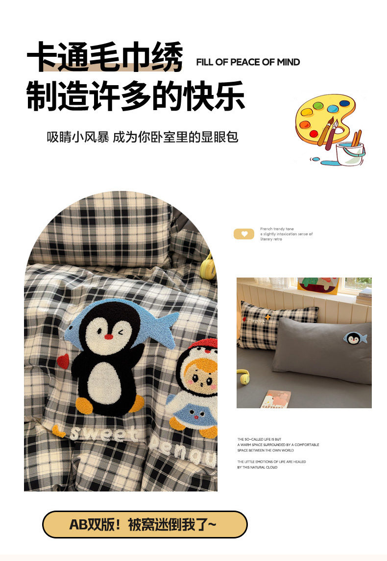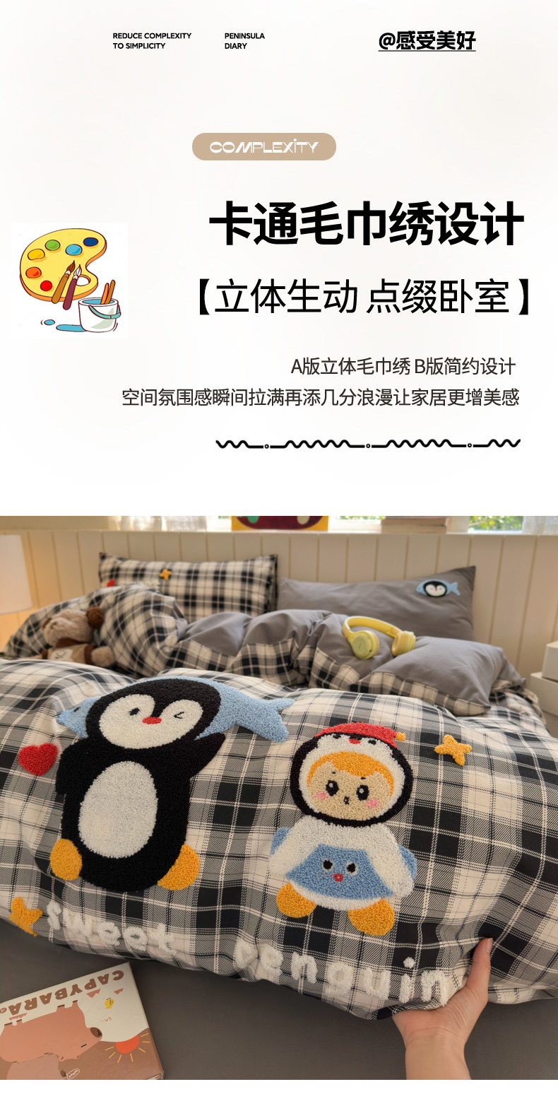 当前位置: 91家纺网 > 商品网购 > 床品套件 > 四件套 > 毛巾绣四件套 > 如意朵 2025新款全棉磨毛卡通毛巾绣四件套(专版花型)-场景二 企鹅宝宝