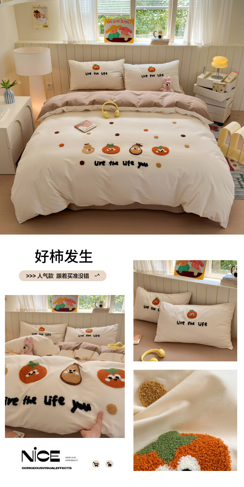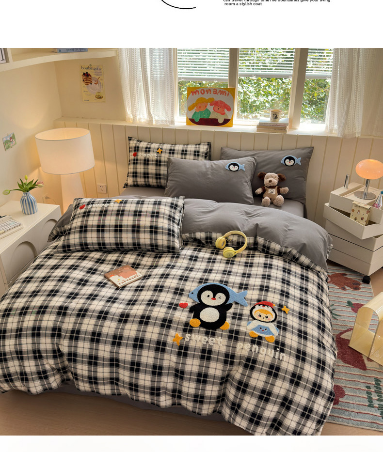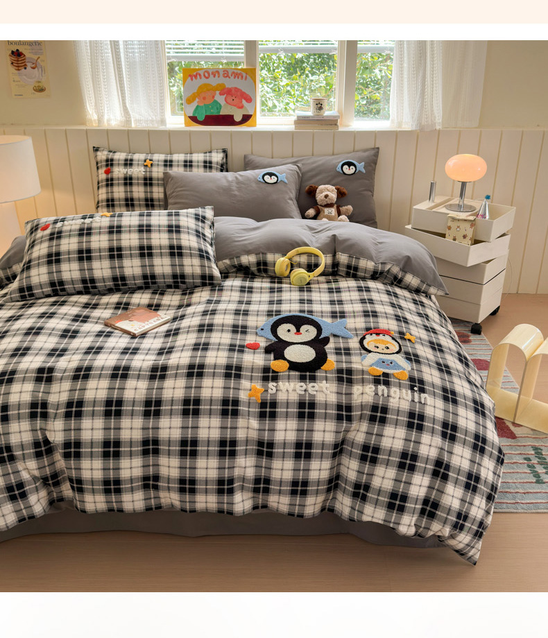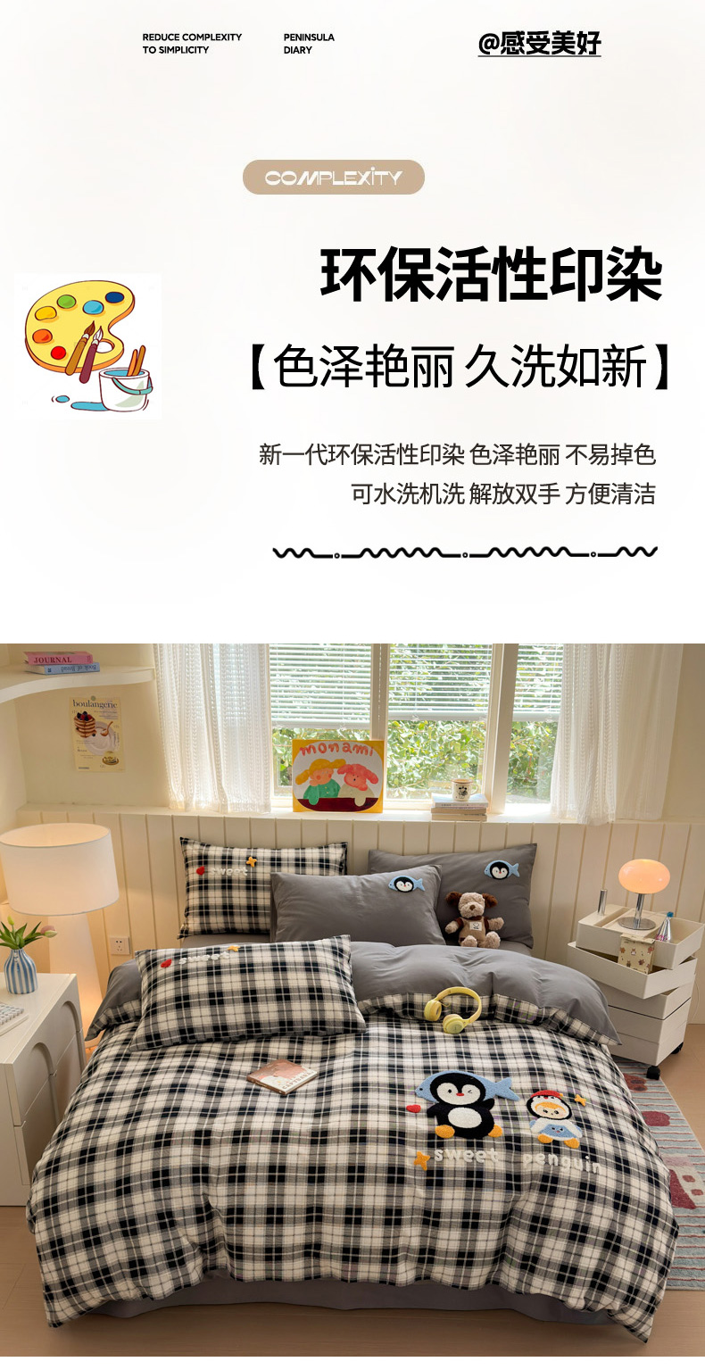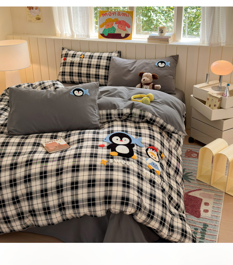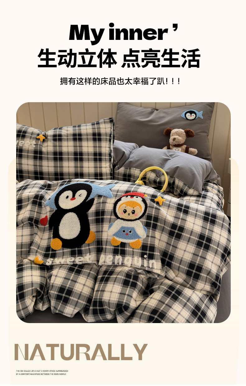 当前位置: 91家纺网 > 商品网购 > 床品套件 > 四件套 > 毛巾绣四件套 > 如意朵 2025新款全棉磨毛卡通毛巾绣四件套(专版花型)-场景二 企鹅宝宝