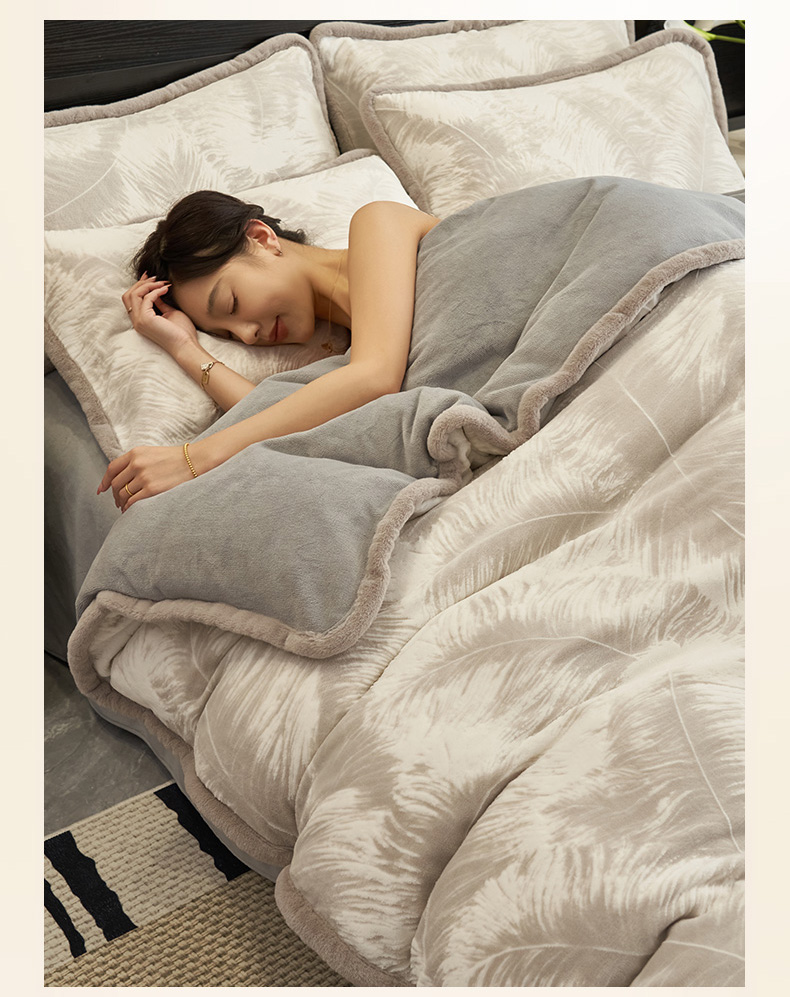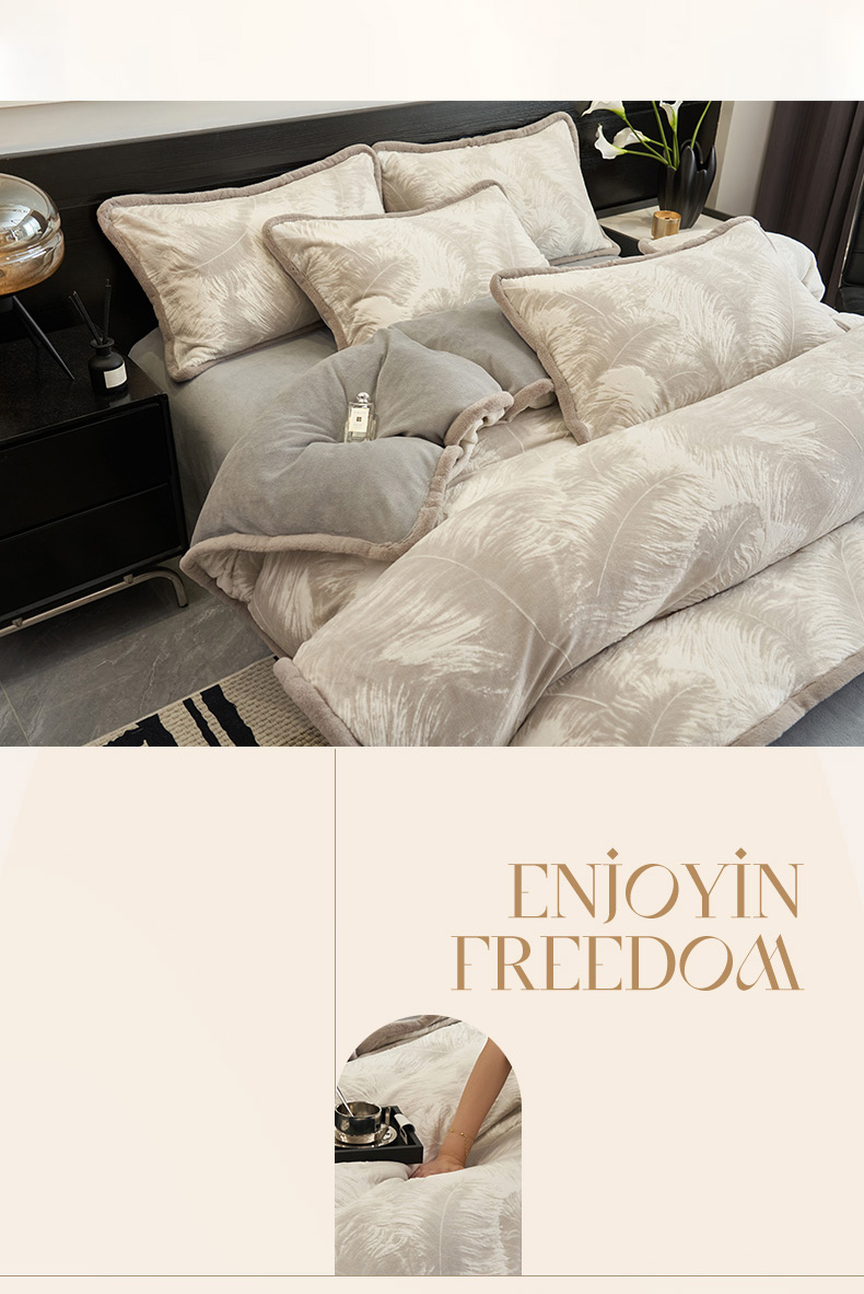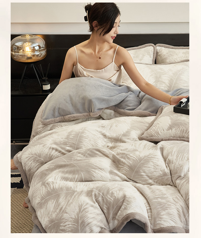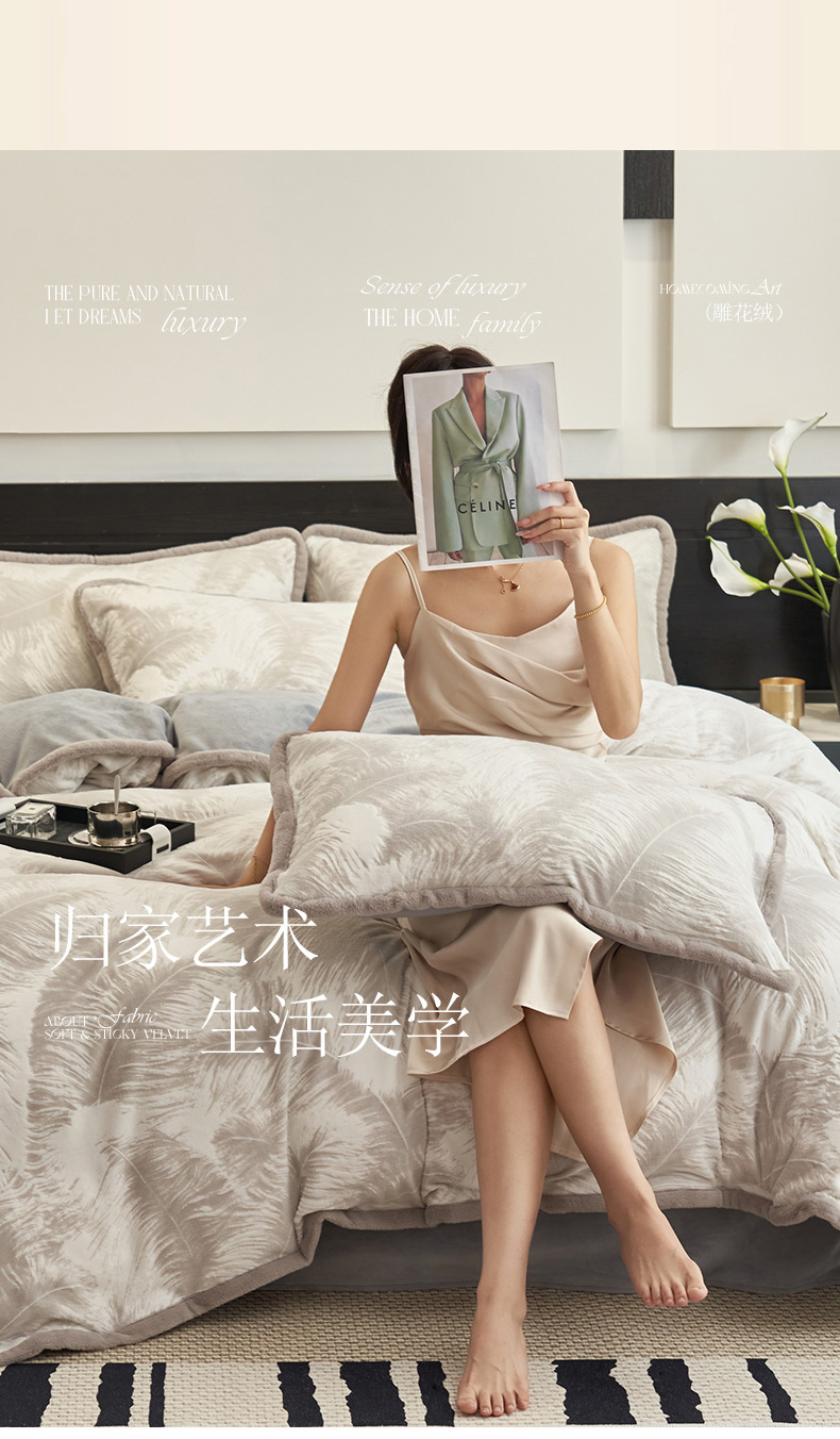(总)金鹰 2025新款A类雕花牛奶绒烂花兔毛包边四件套,羽毛,波澜壮阔,繁花,蝴蝶梦,简爱,兰花,玫瑰物语,梦幻森林,清晨玫瑰,羽叶,仲夏晨歌