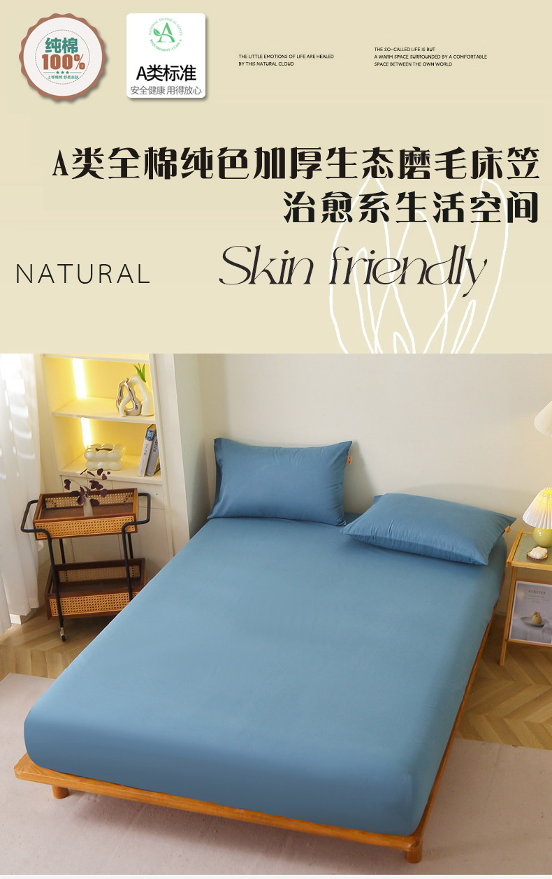 晶缦 2025新款100%纯棉13376纯色喷气全棉磨毛单床笠 暖芸馨-蝶翅蓝
