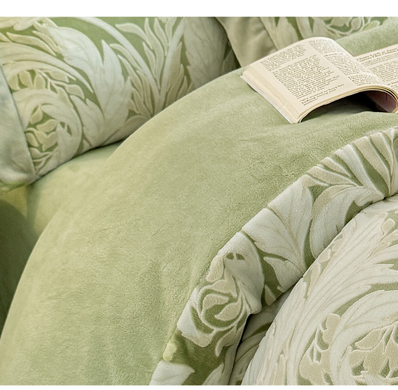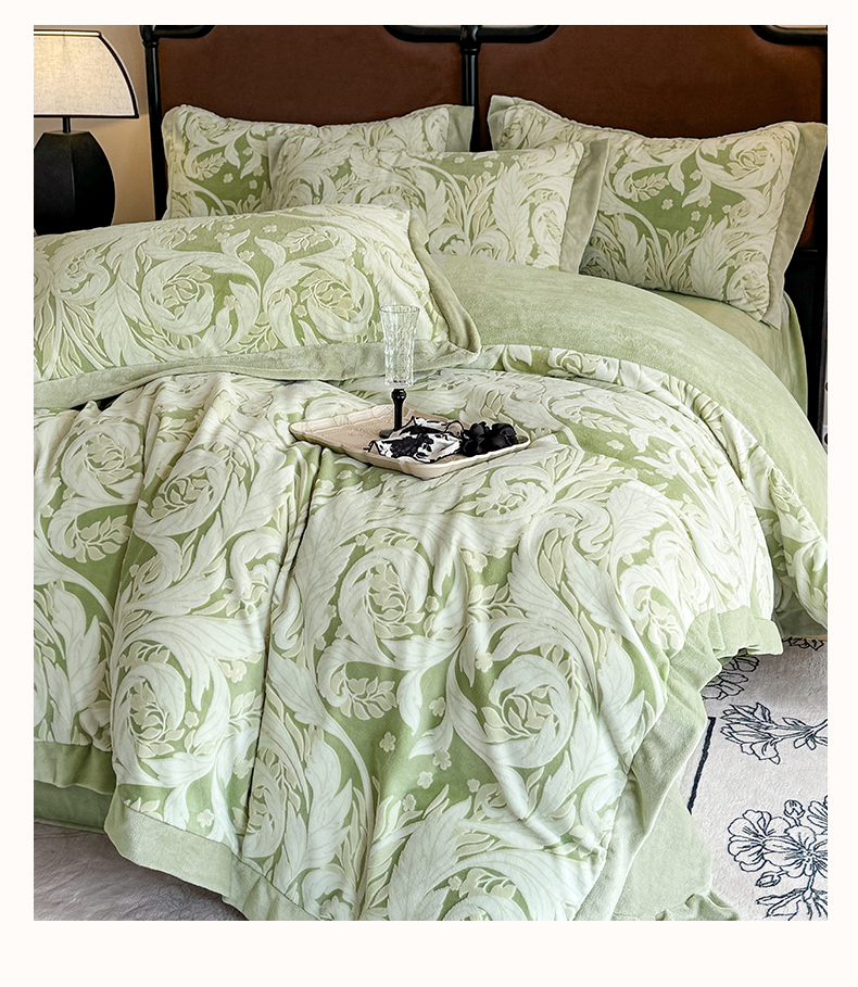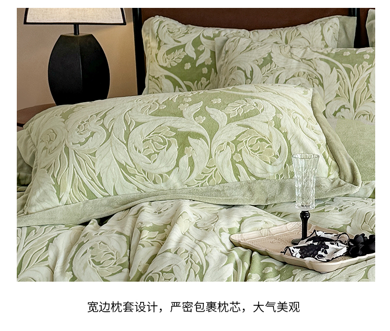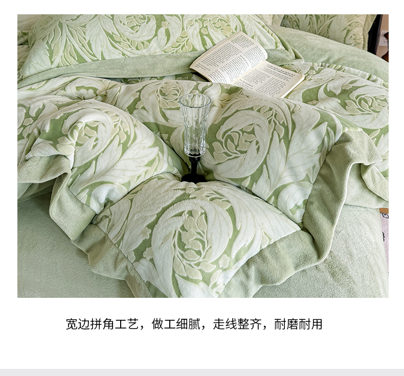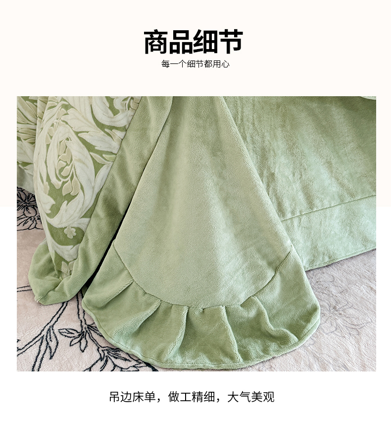 商品名称:慕晨 2025新款高克重雕花牛奶绒法式风大宽边拼角吊边床单四件套 图岚朵-松石绿